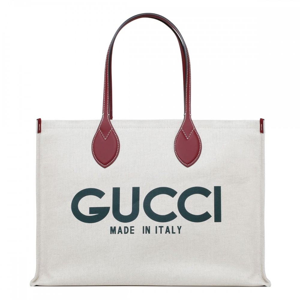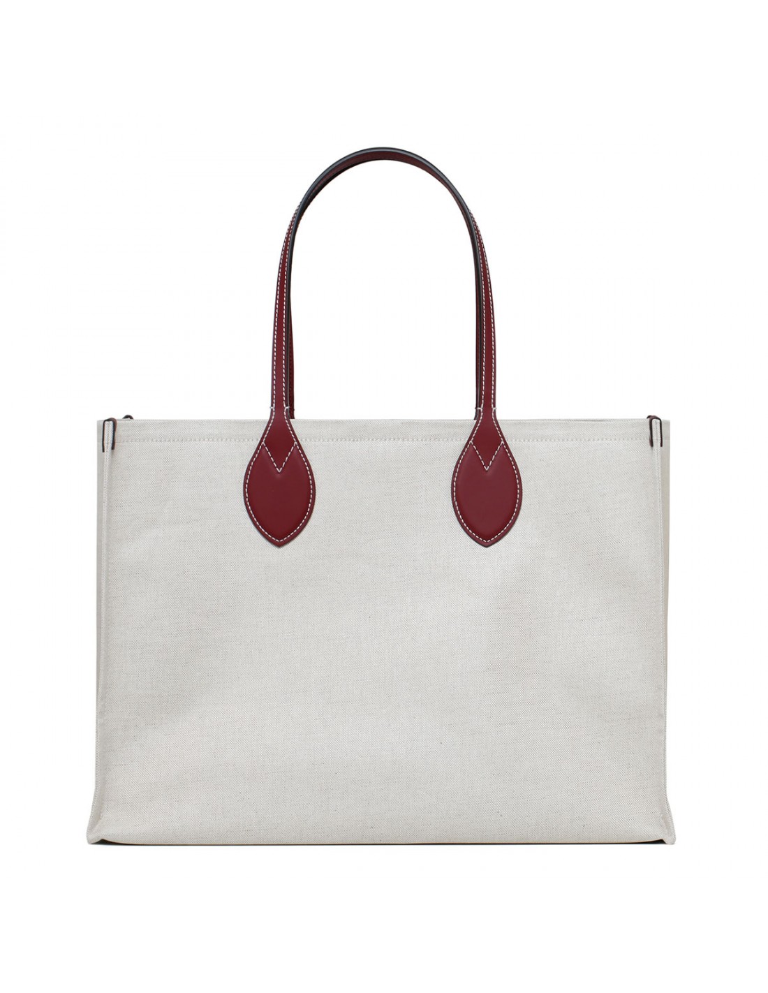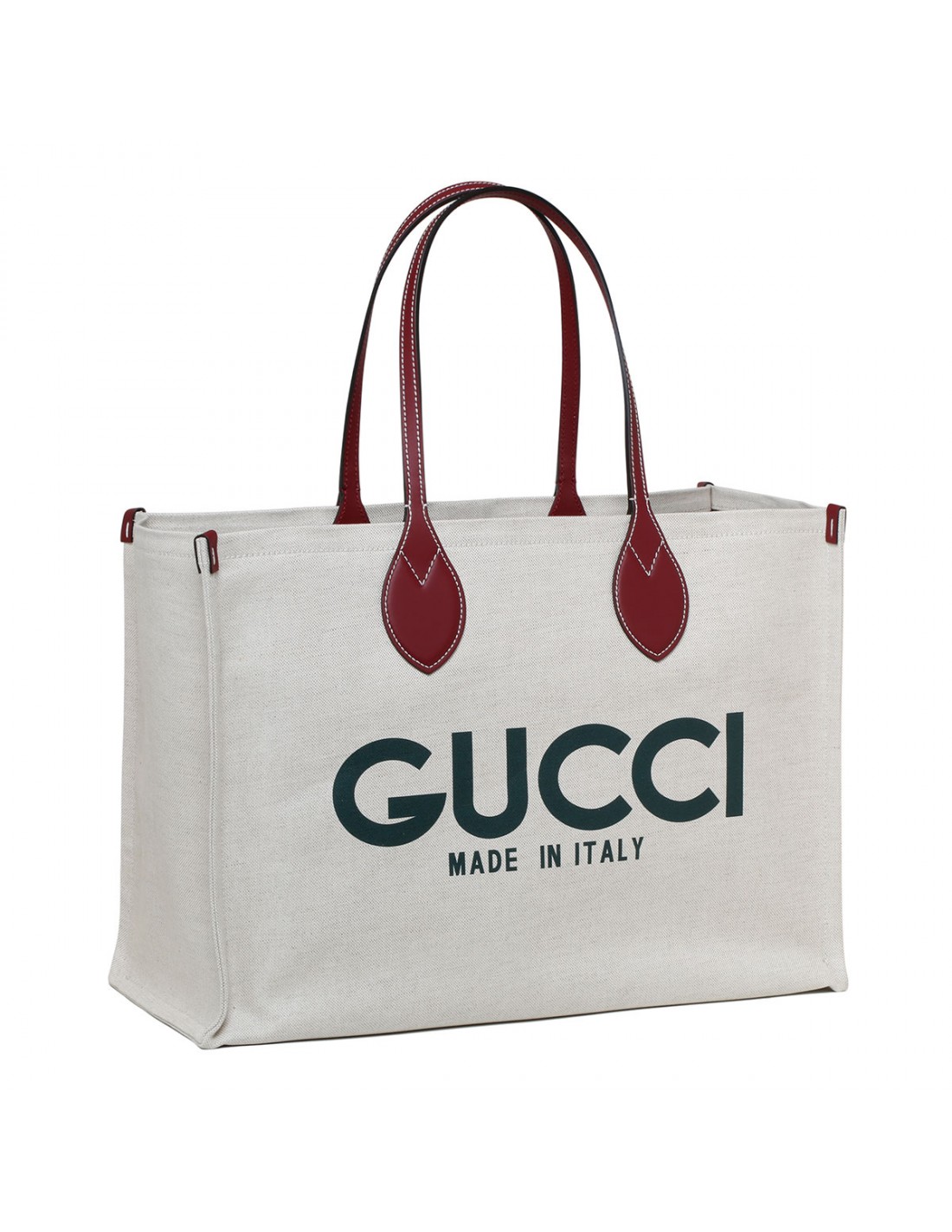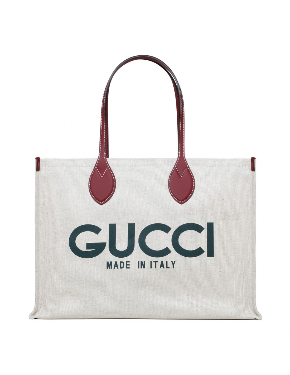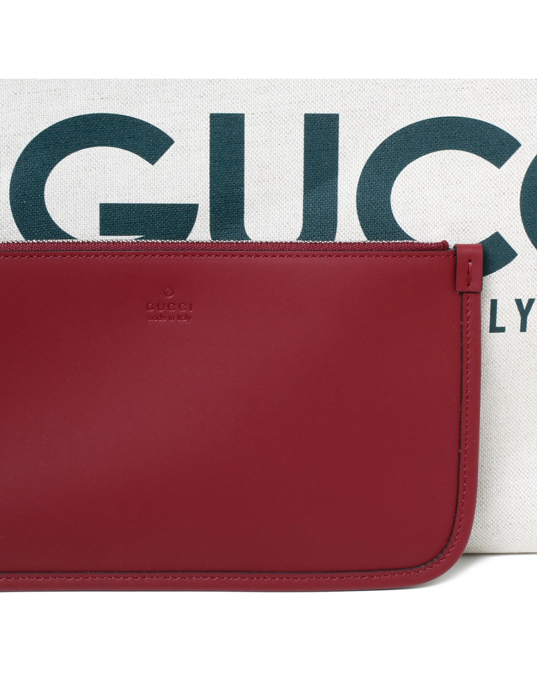 Beige cotton linen canvas tote bag from Gucci featuring dark red leather trim, internal leather zipped pouch, Gucci Made in Italy print, silver-toned hardware, beige and ebony GG Supreme lining.