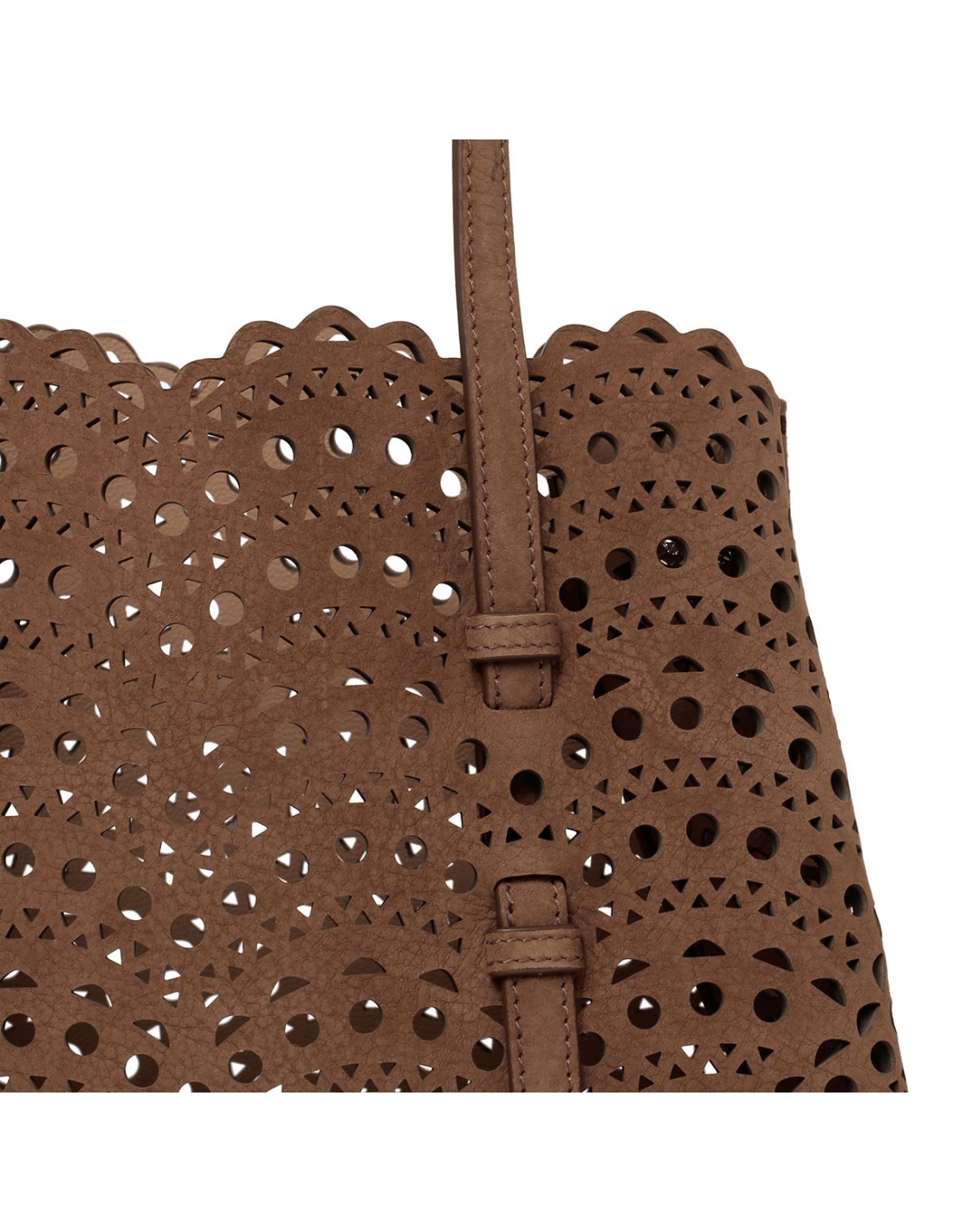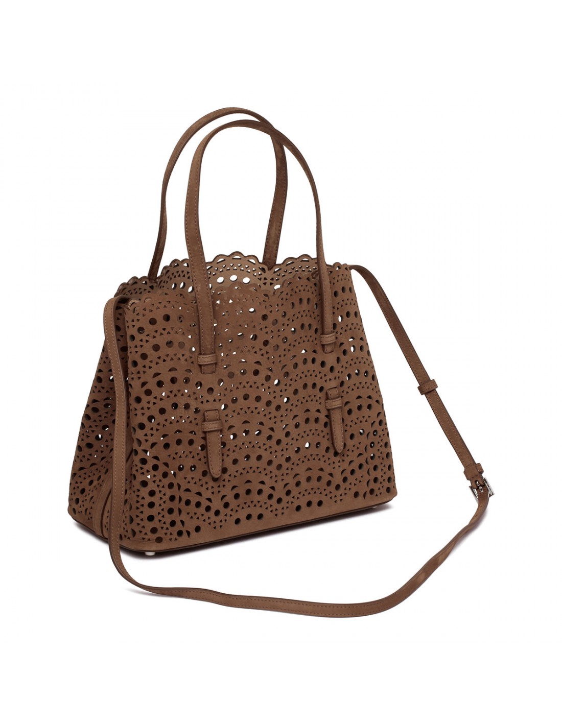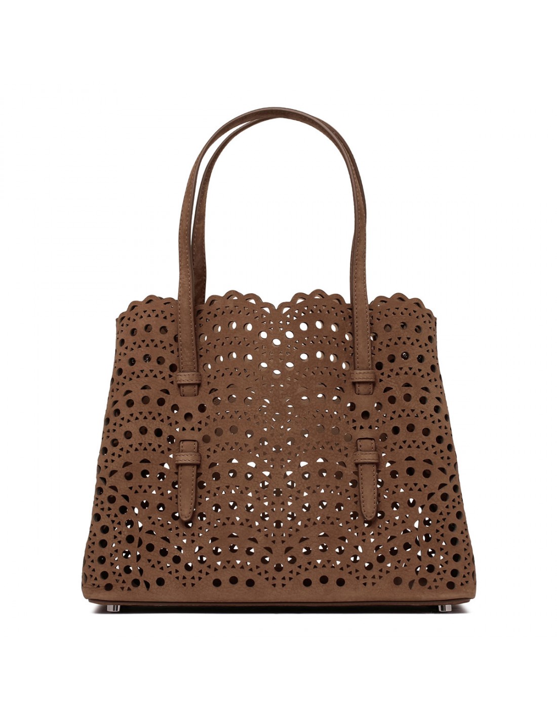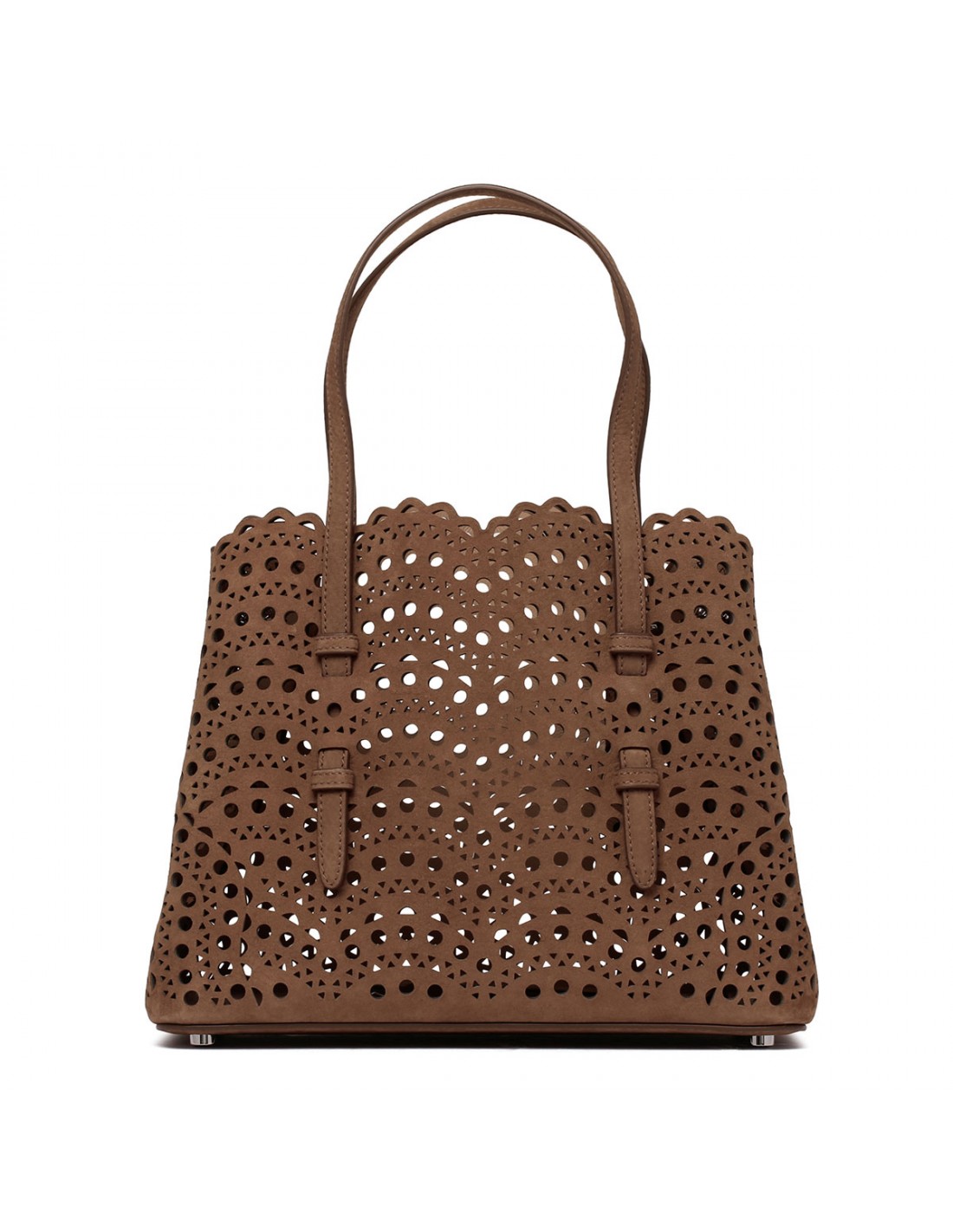 Brown suede leather Mina 25 tote bag from Alaia featuring Vienne wave pattern, snap-fastening gusseted sides, double top handle, zipped leather pouch, adjustable shoulder strap.