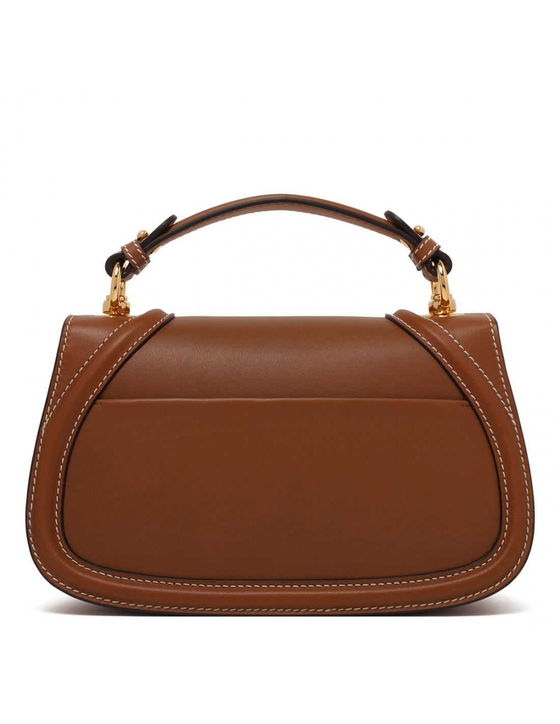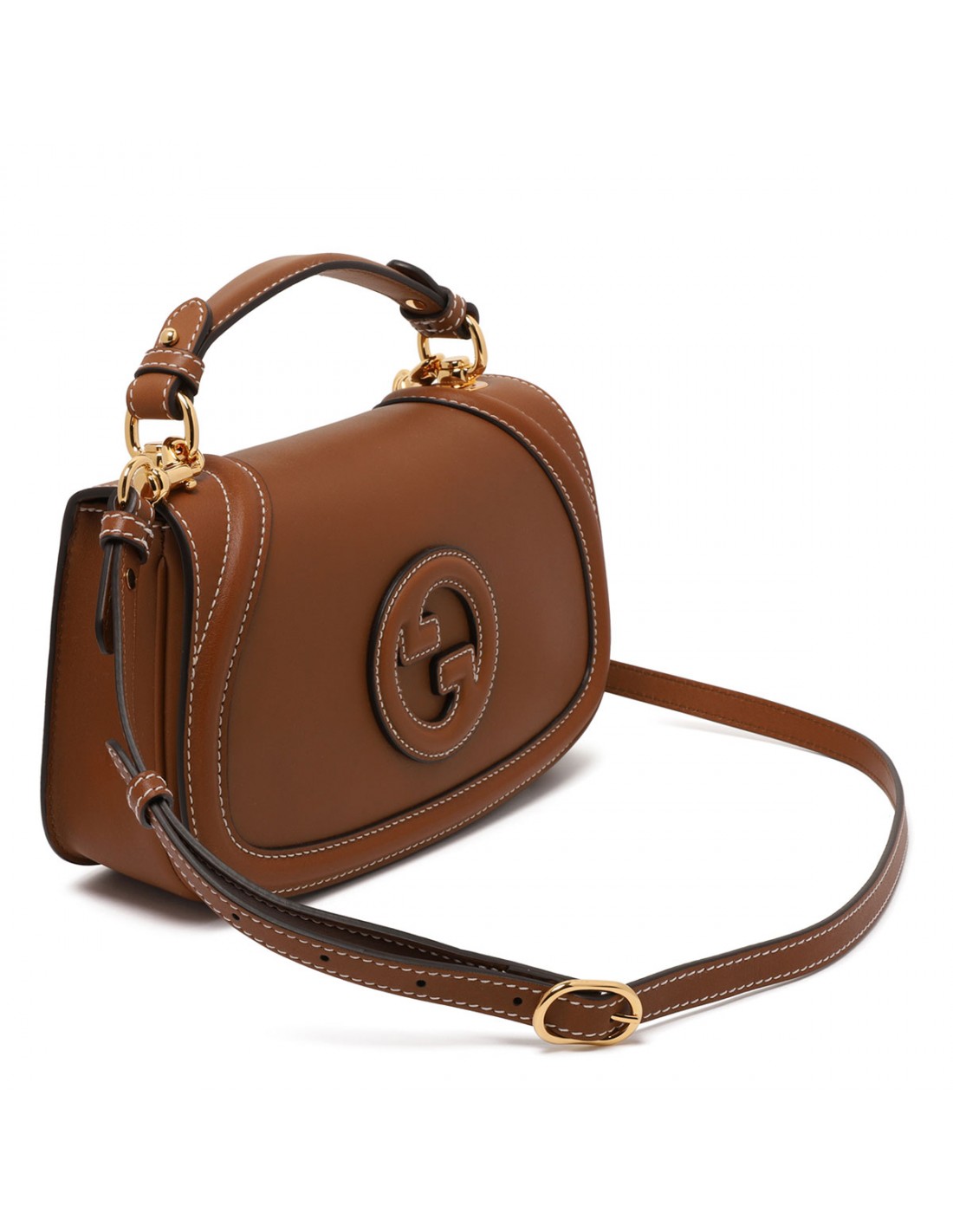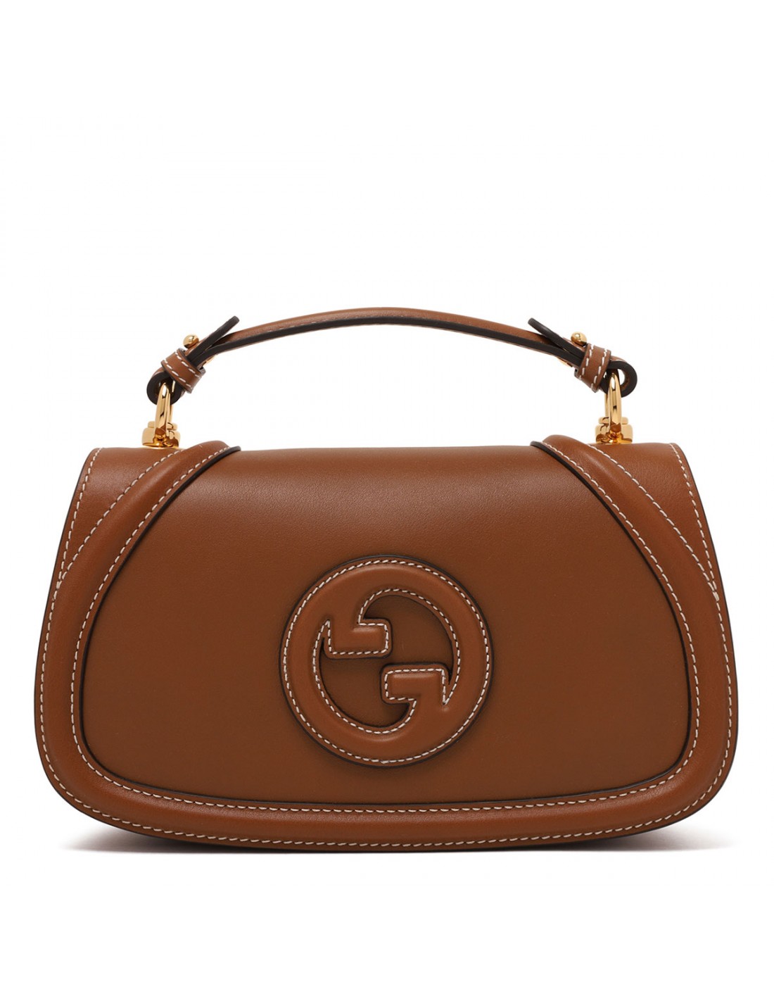 Brown smooth leather Blondie medium top handle bag from Gucci featuring round interlocking G, brown leather trim, top handle, detachable and adjustable shoulder strap, gold-toned hardware, magnetic closure, back open pocket., brown cotton linen lining, internal zipped pocket.