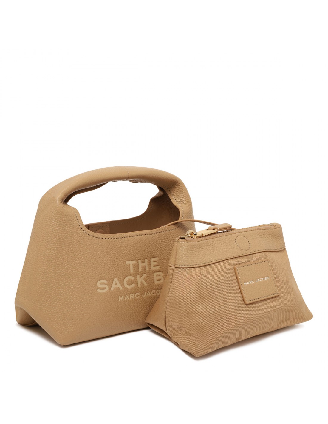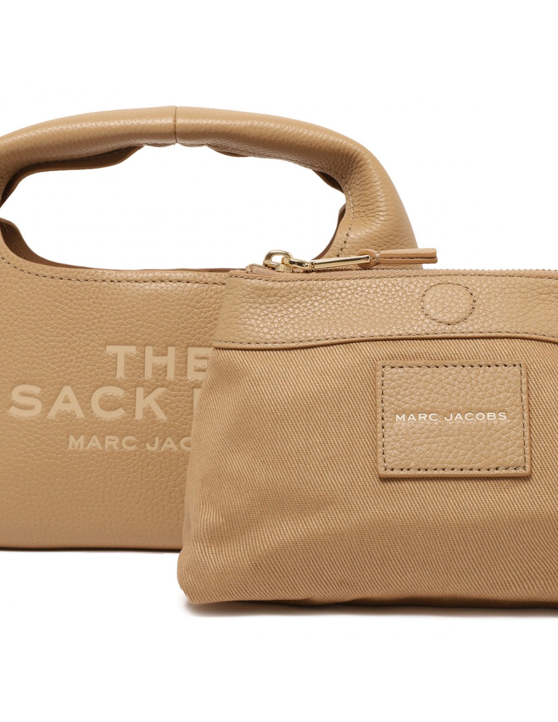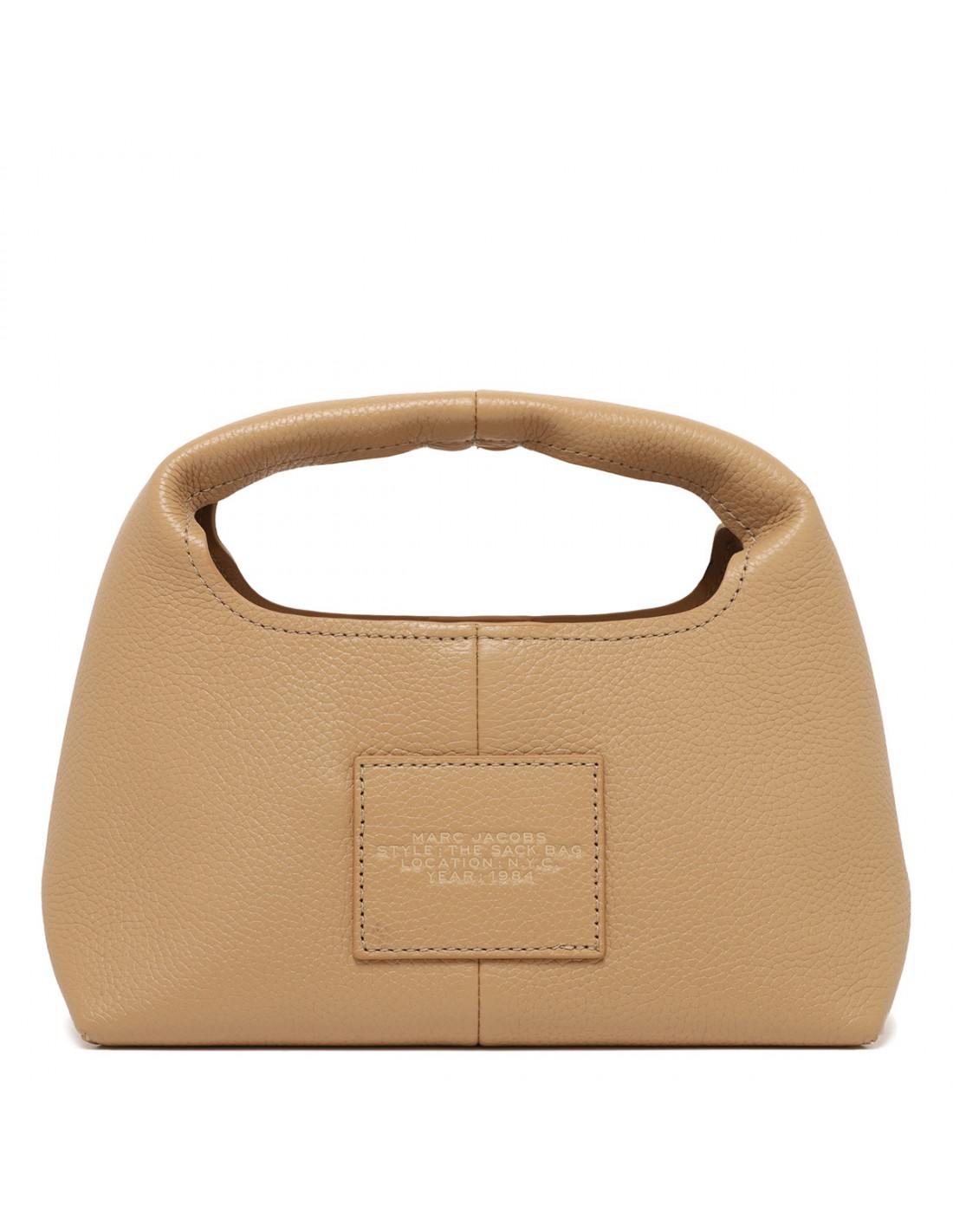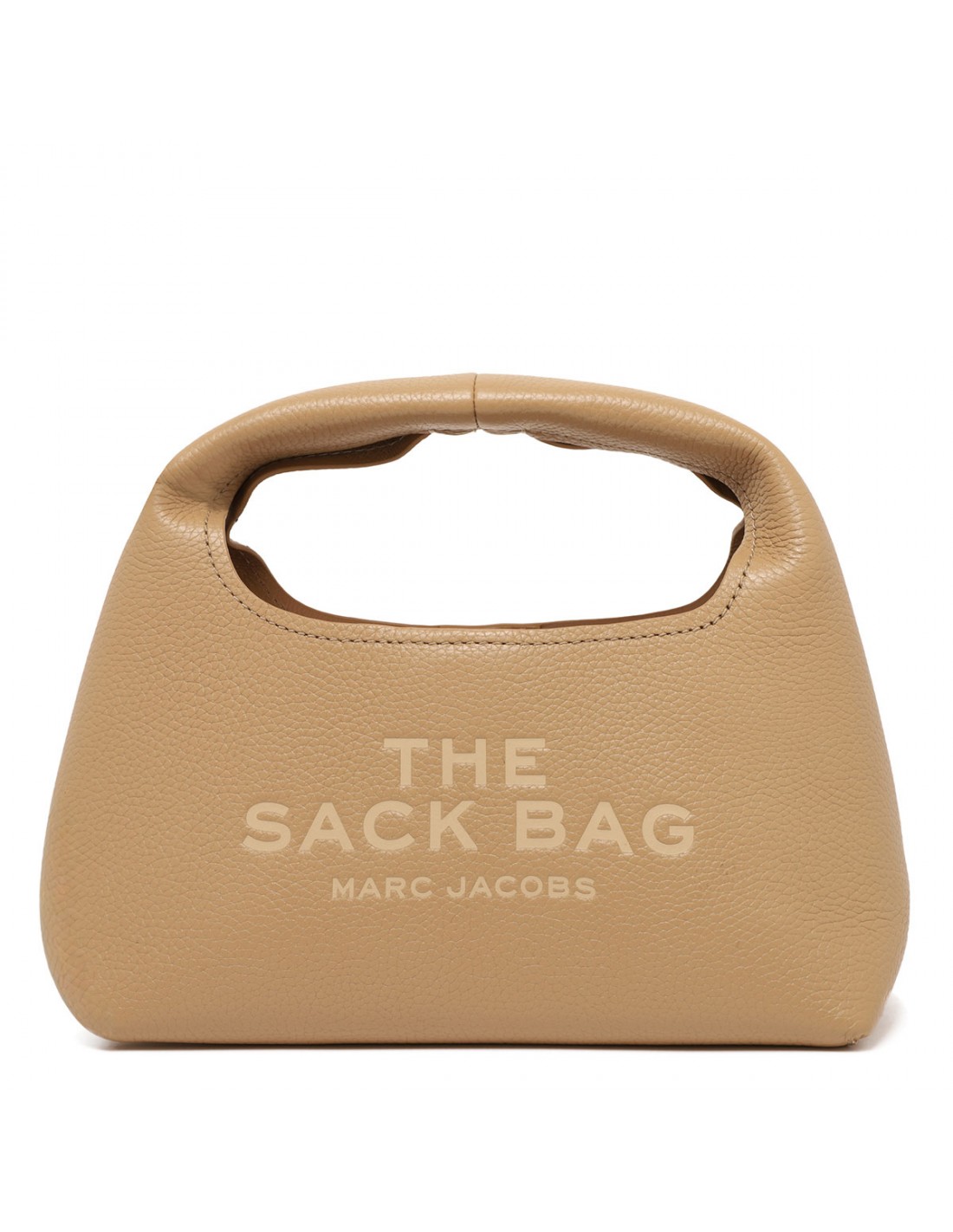 Camel hue full-grain leather The Mini Sack bag from Marc Jacobs featuring logo embossed, magnetic snap closure, top handle, internal zipped pouch with logo embossed.