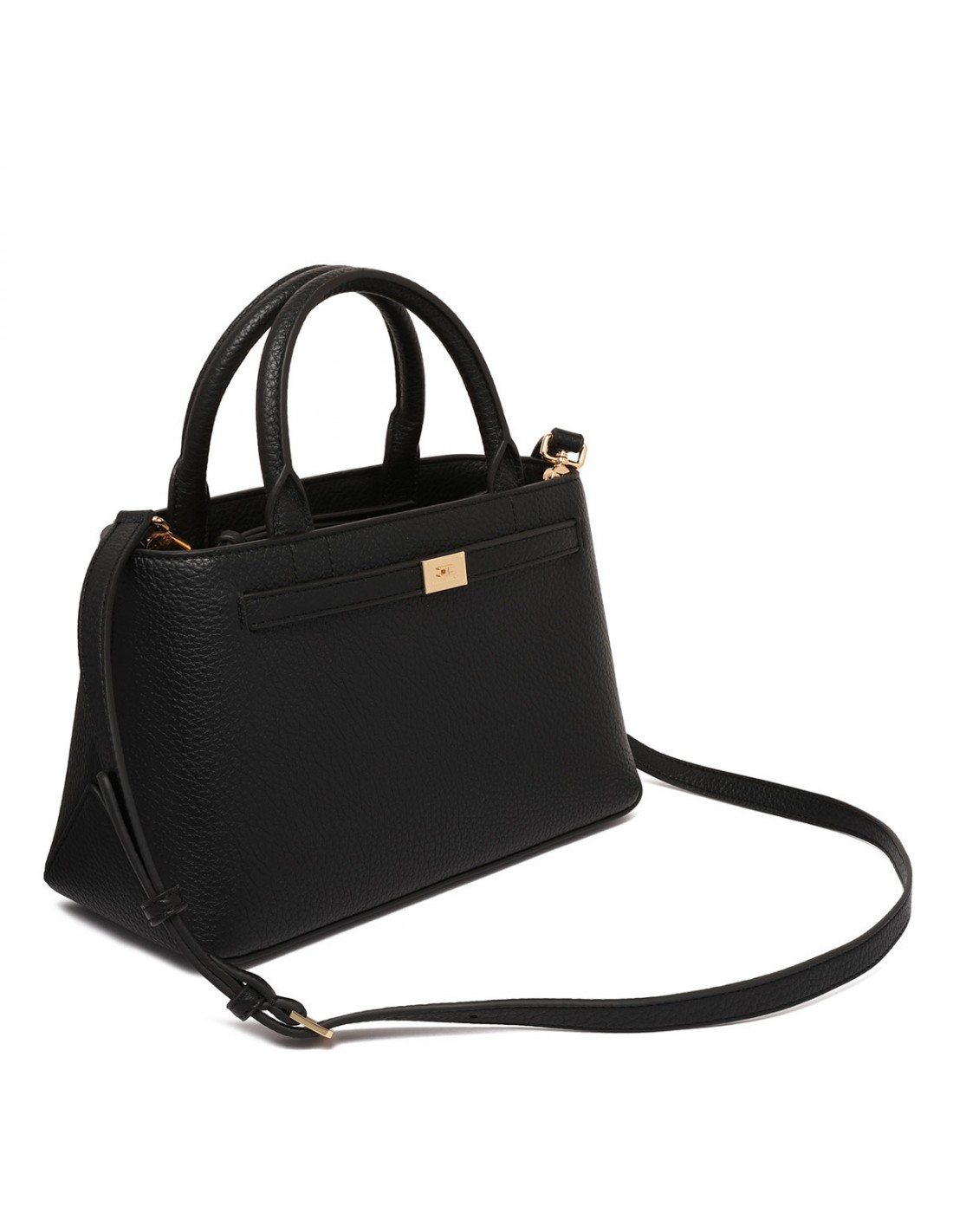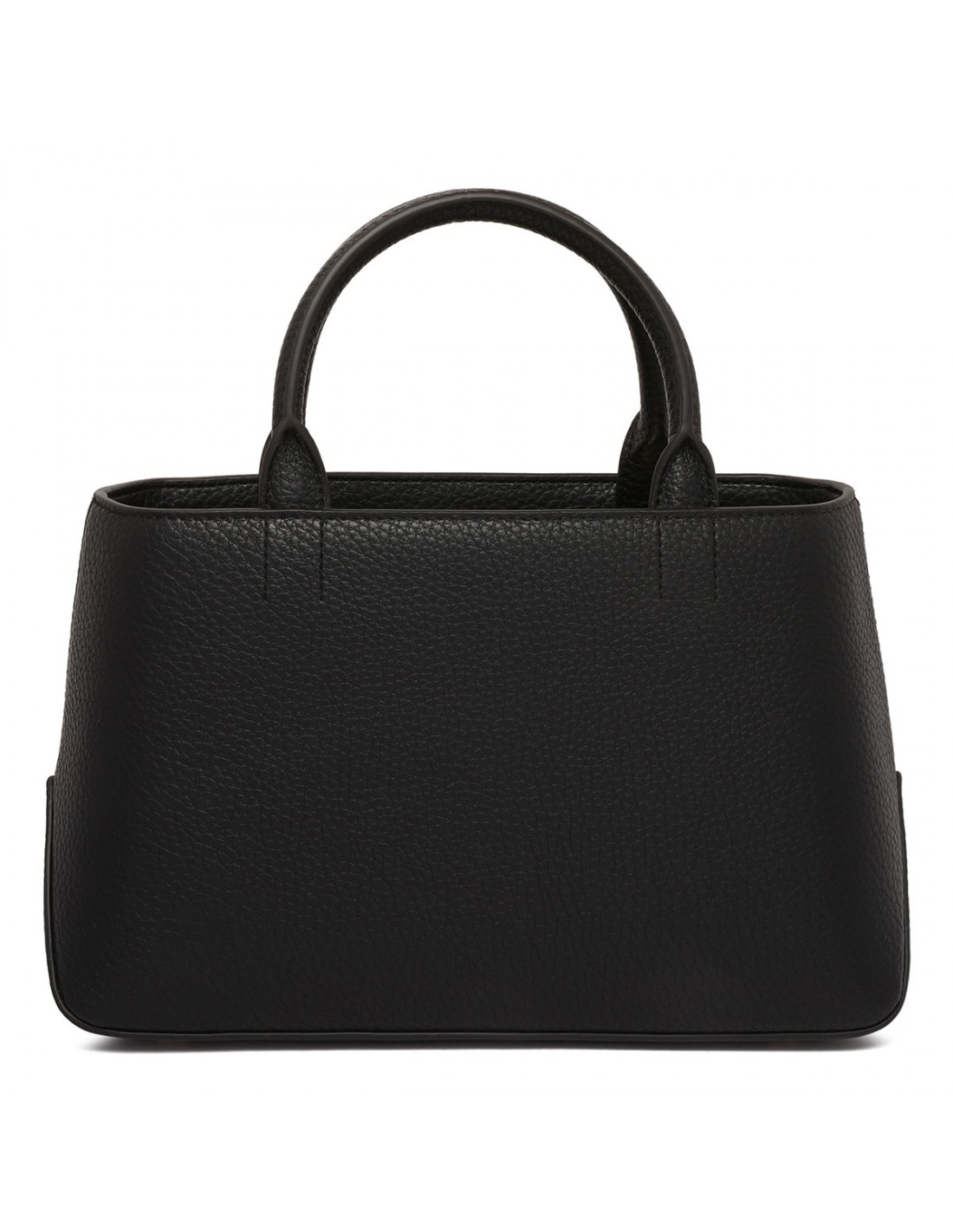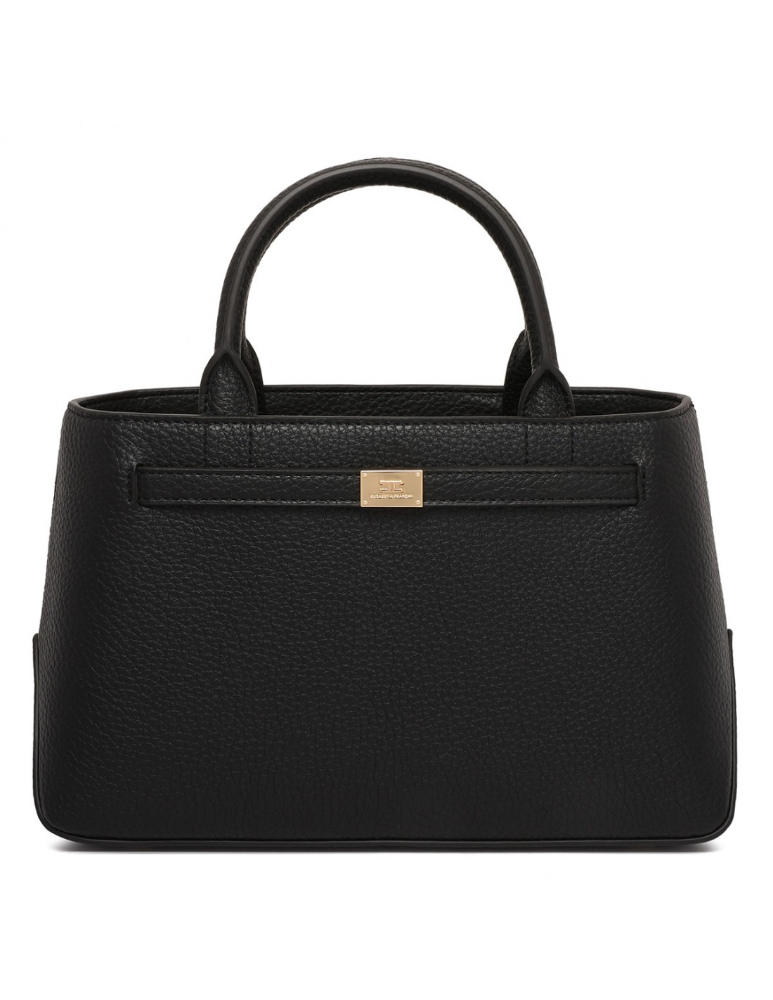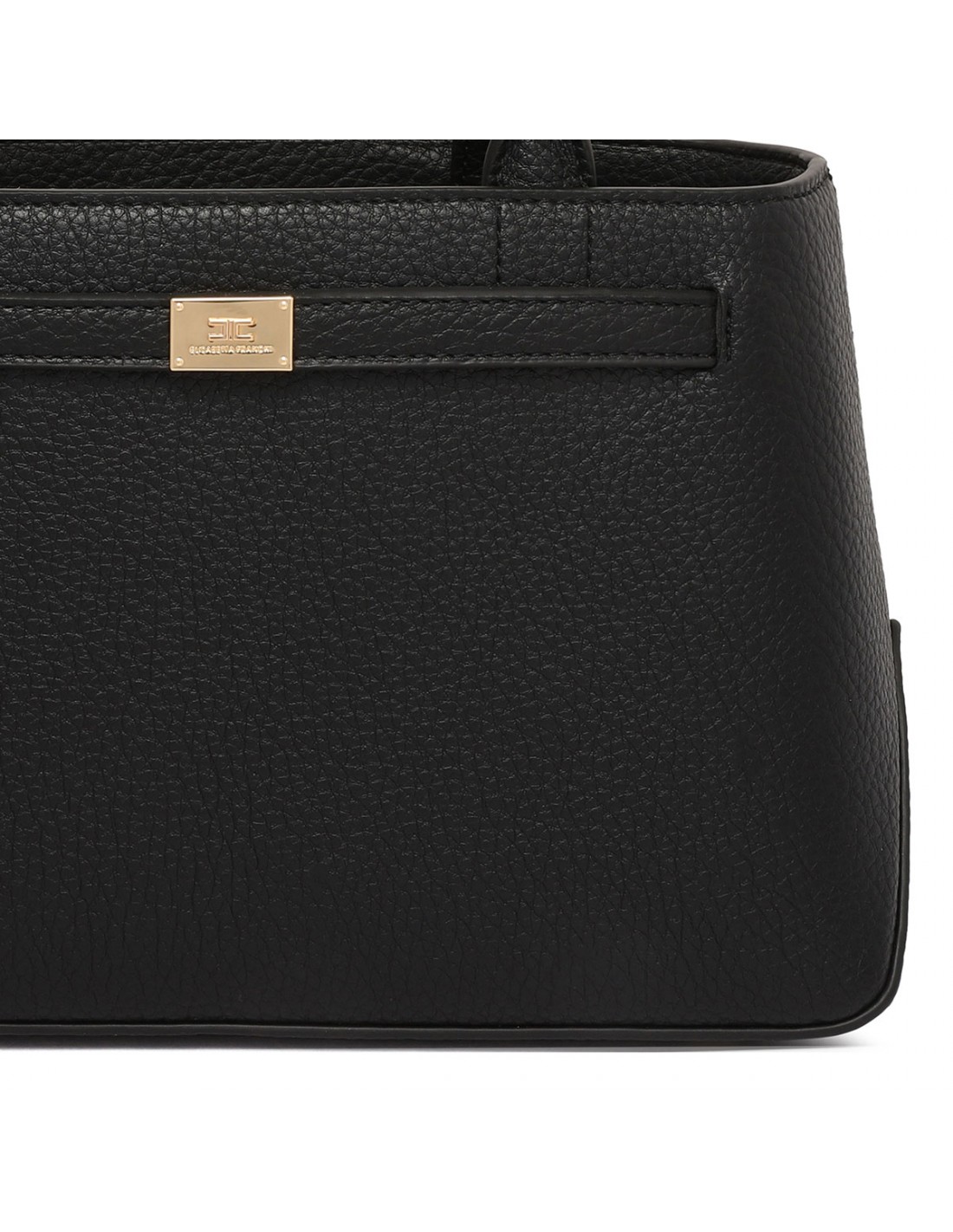Black tumbled leather-effect synthetic material handbag from Elisabetta Franchi featuring double top handle, golden metal logo plaque, detachable and adjustable shoulder strap, zip fastening on top, internal lining.