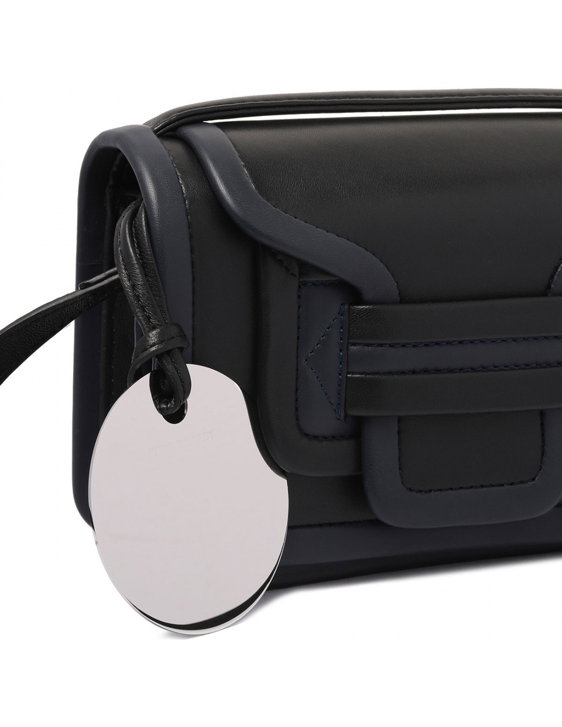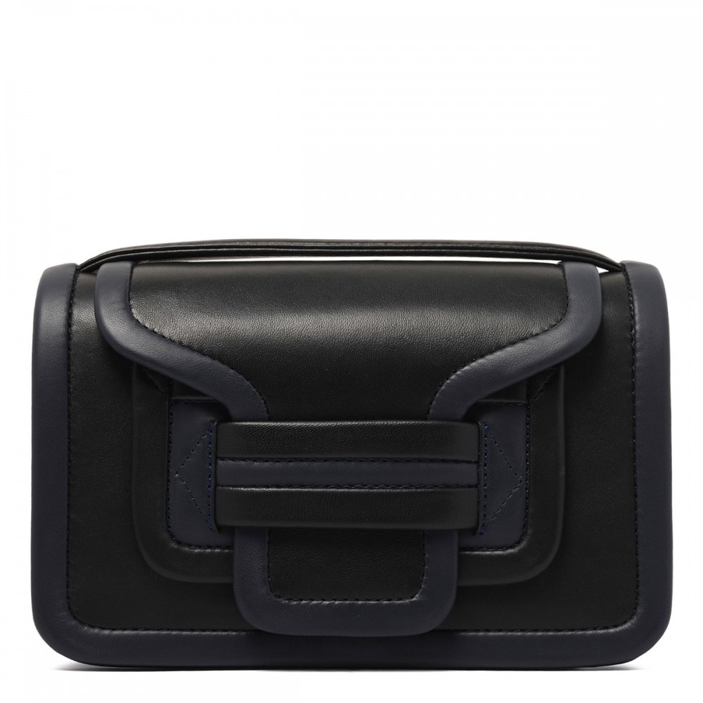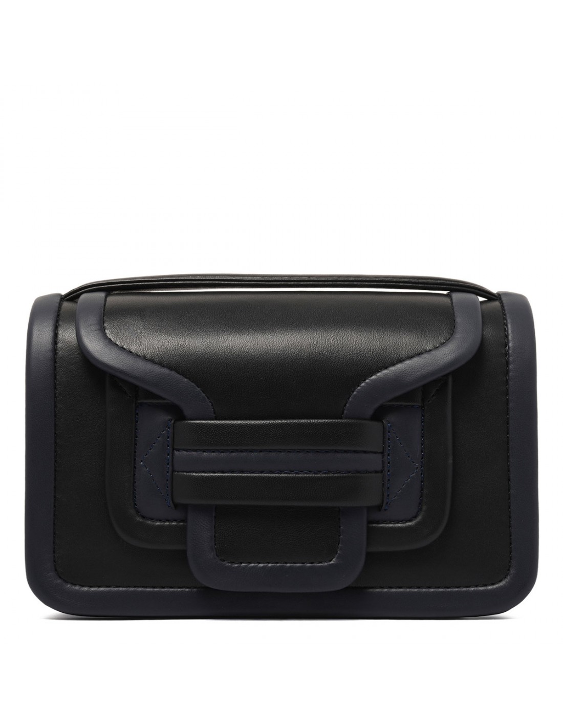 Black and navy leather Alpha handbag from Pierre Hardy featuring adjustable and detachable strap, concealed magnetic snap under the flap, pocket at the back, small round mirror inside, leather lining and slot pocket.