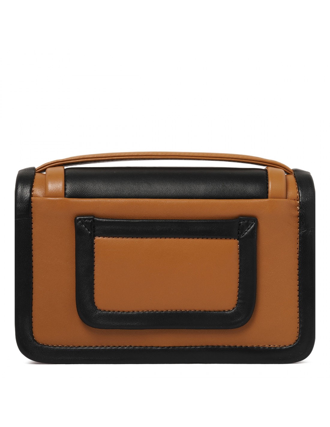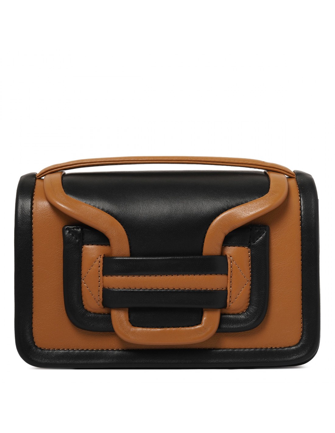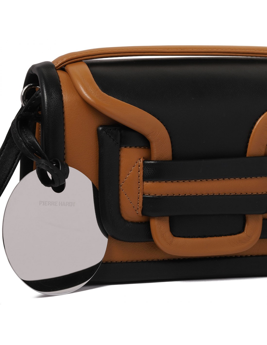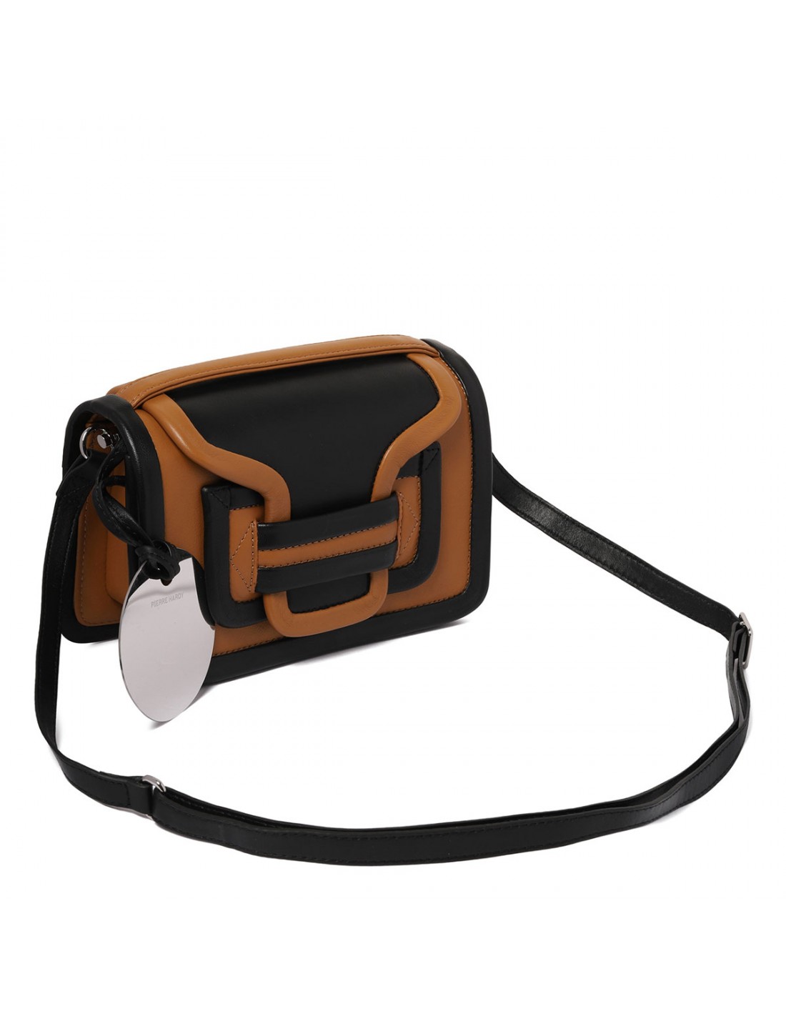 Cognac and black leather Alpha maxi handbag from Pierre Hardy featuring adjustable and detachable strap, concealed magnetic snap under the flap, pocket at the back, small round mirror inside, leather lining and slot pocket.