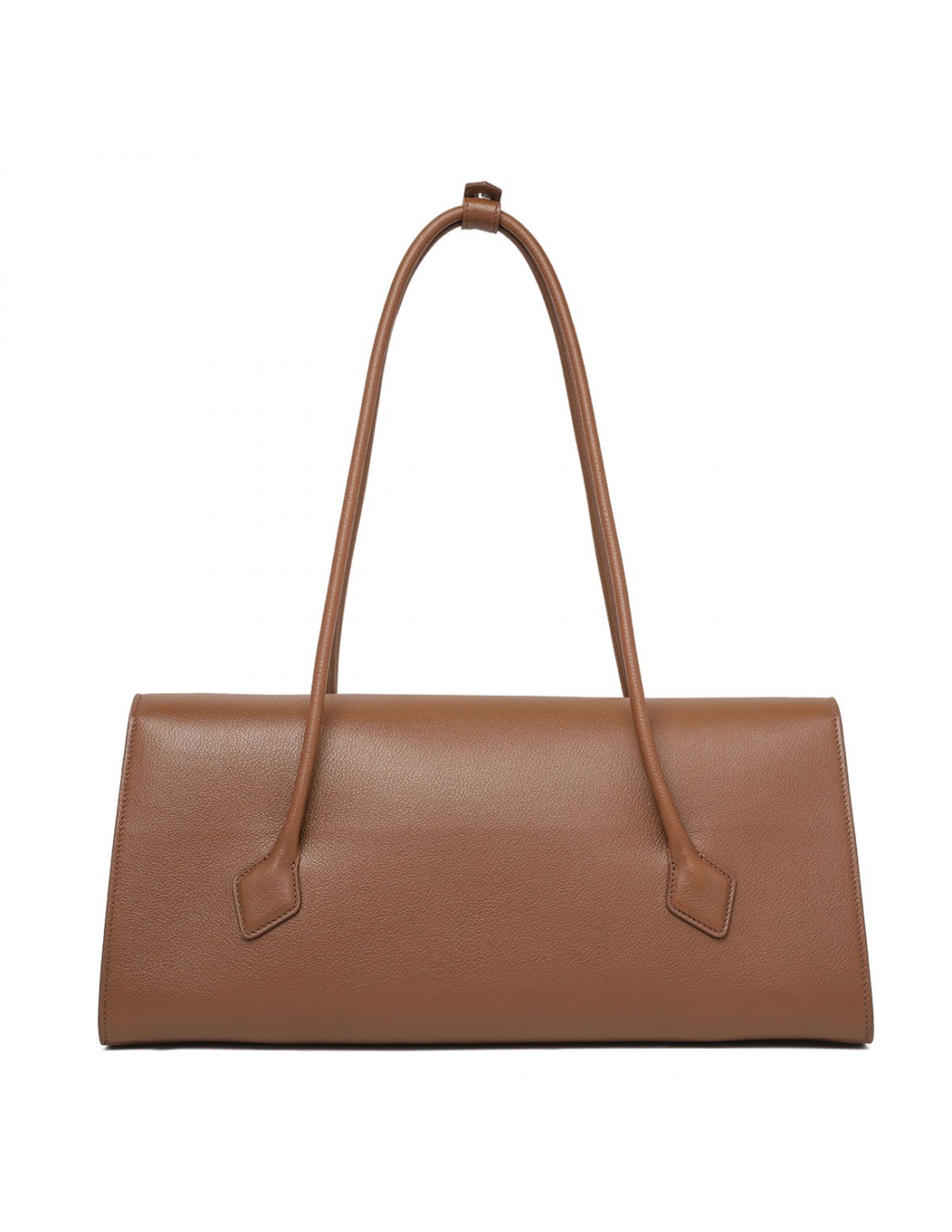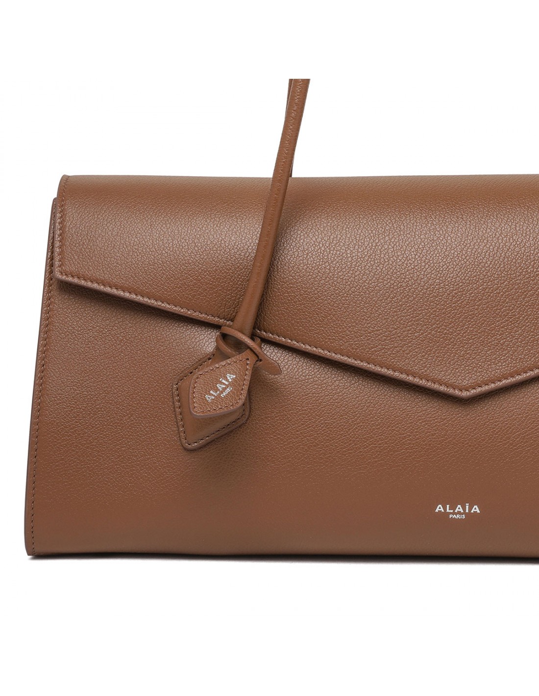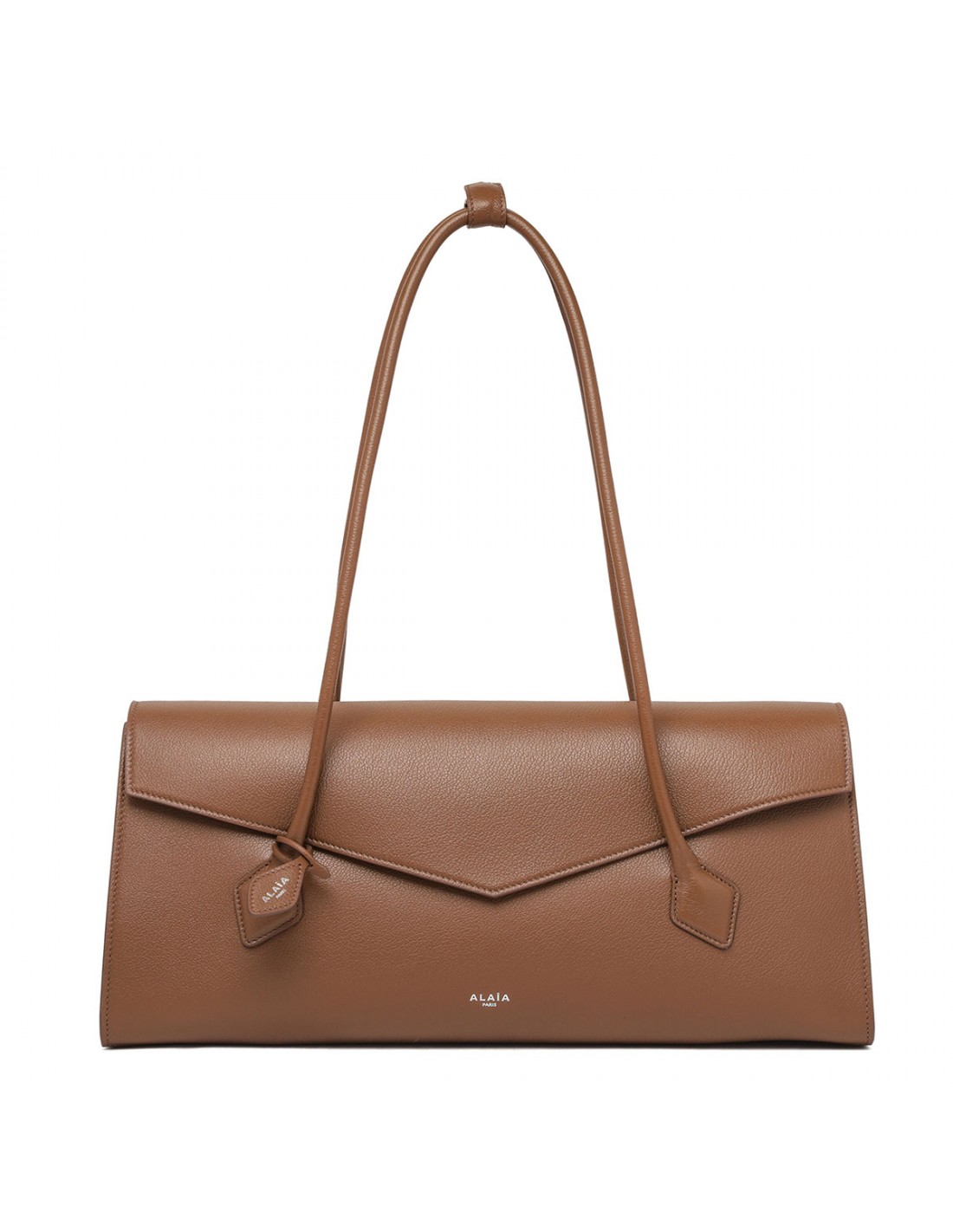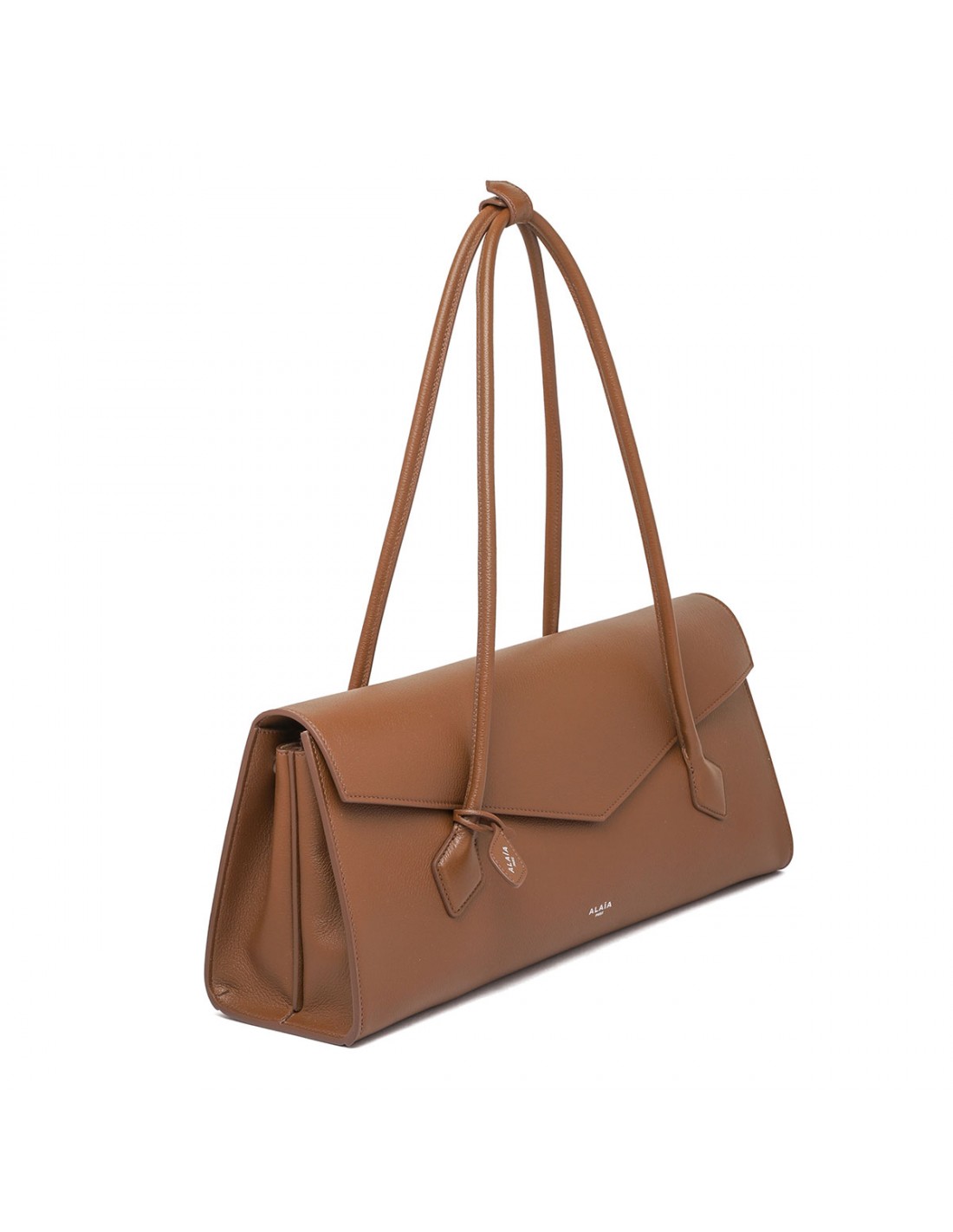 Brown calf leather Le Teckel flap tote bag from Alaia featuring elongated silhouette, long tubular handles with decorative ties, two large gussets with magnetic fastening and one pocket with double zip fastening.