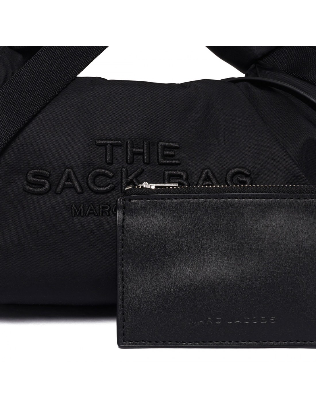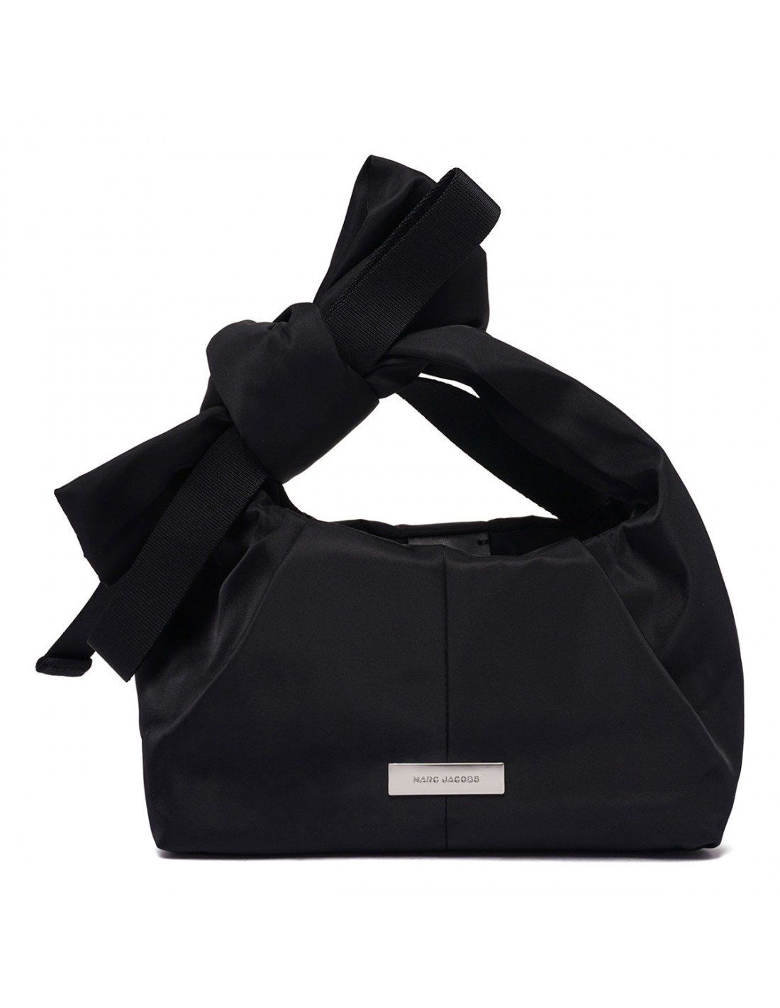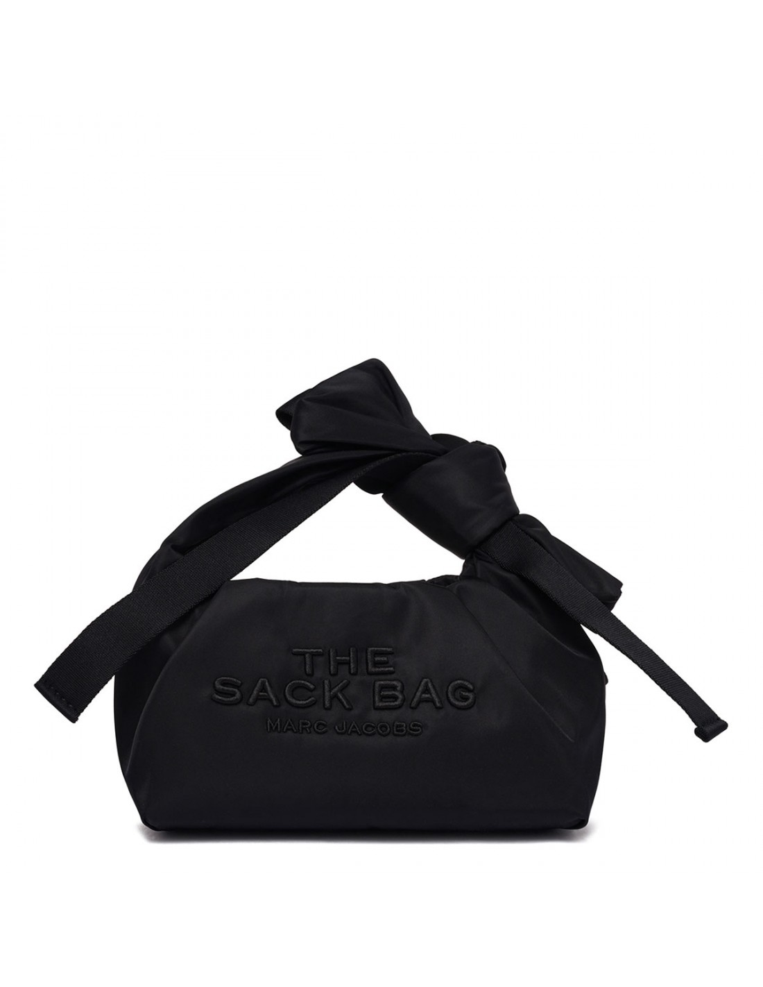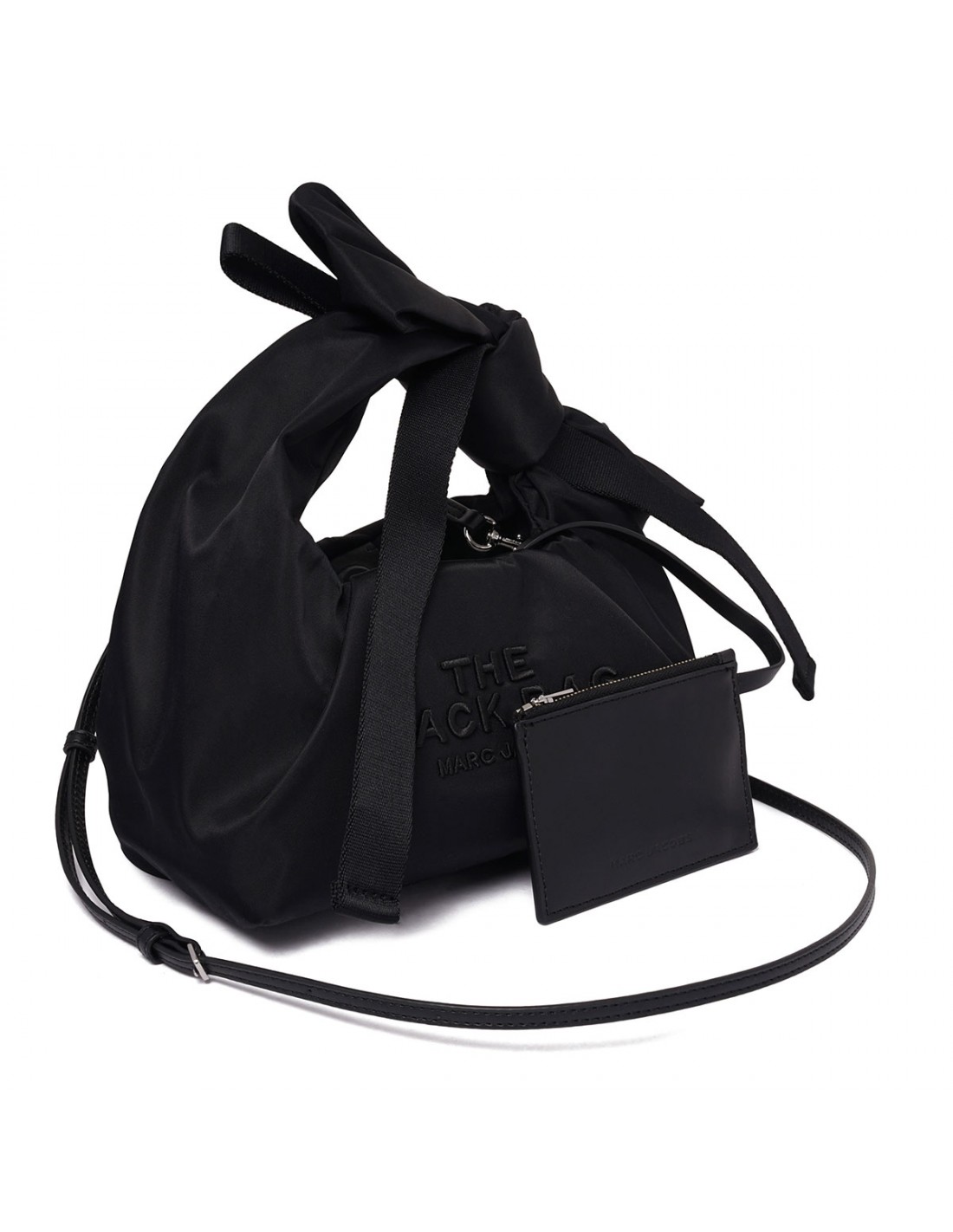 Black pleated nylon The Bow mini sack bag from Marc Jacobs featuring top handle, adjustable leather crossbody strap, magnetic fastening, D-ring and a clip-in leather pouch, embroidered logo.