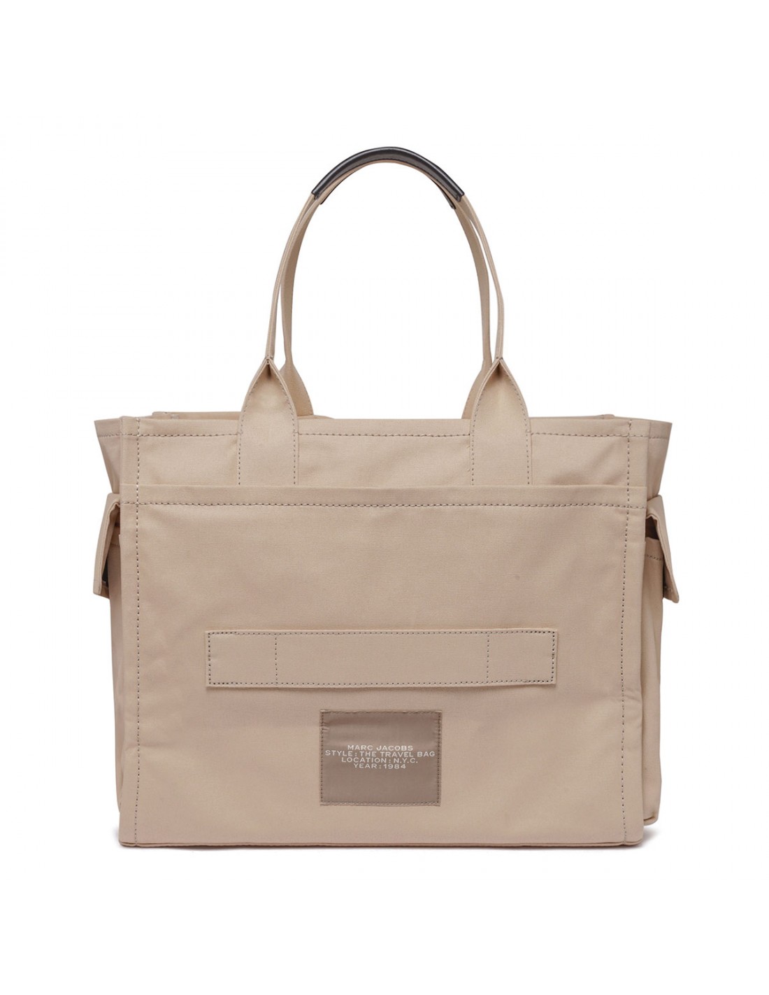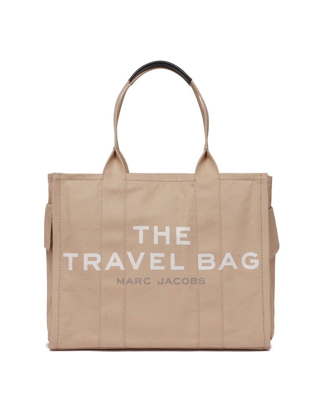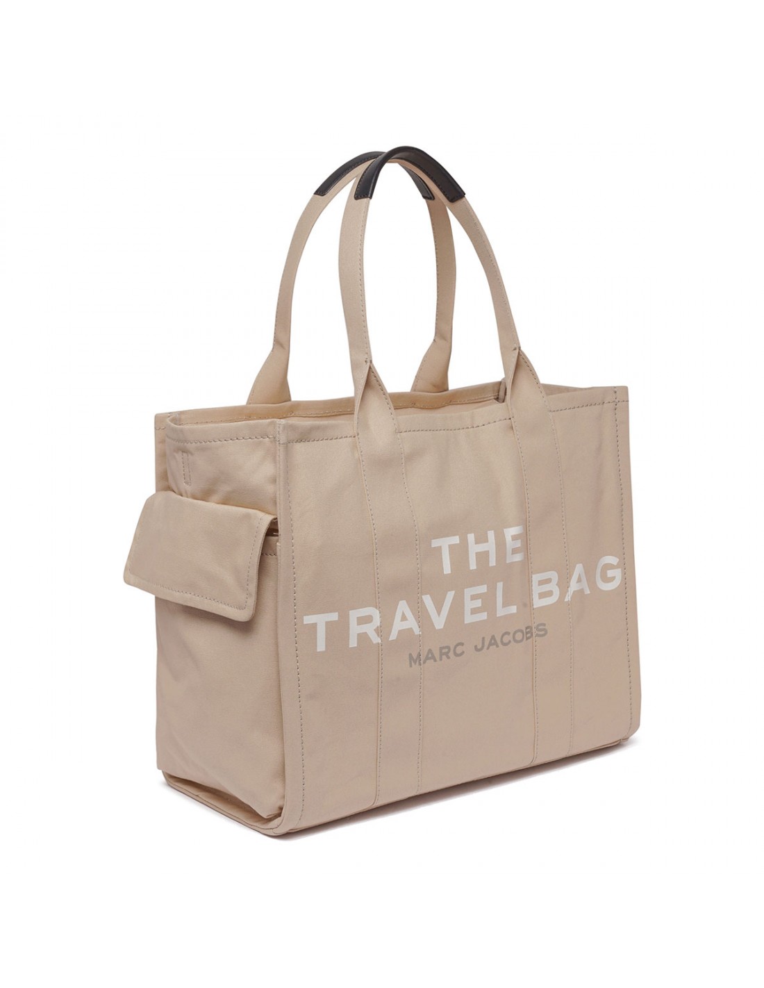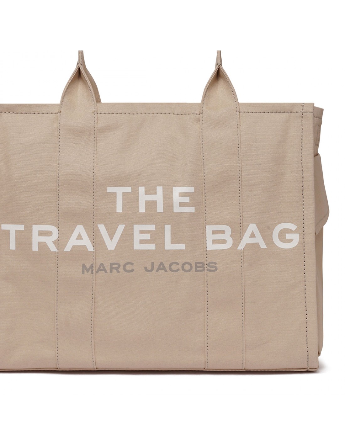Beige canvas The Canvas Travel tote from Marc Jacobs featuring logo printed at front, double top handle, detachable and adjustable webbing shoulder strap, silver-tone hardware, two side cargo pockets, back zipped pocket, zip fastening along top, faille-lining, one internal zip pocket and two flat pockets.