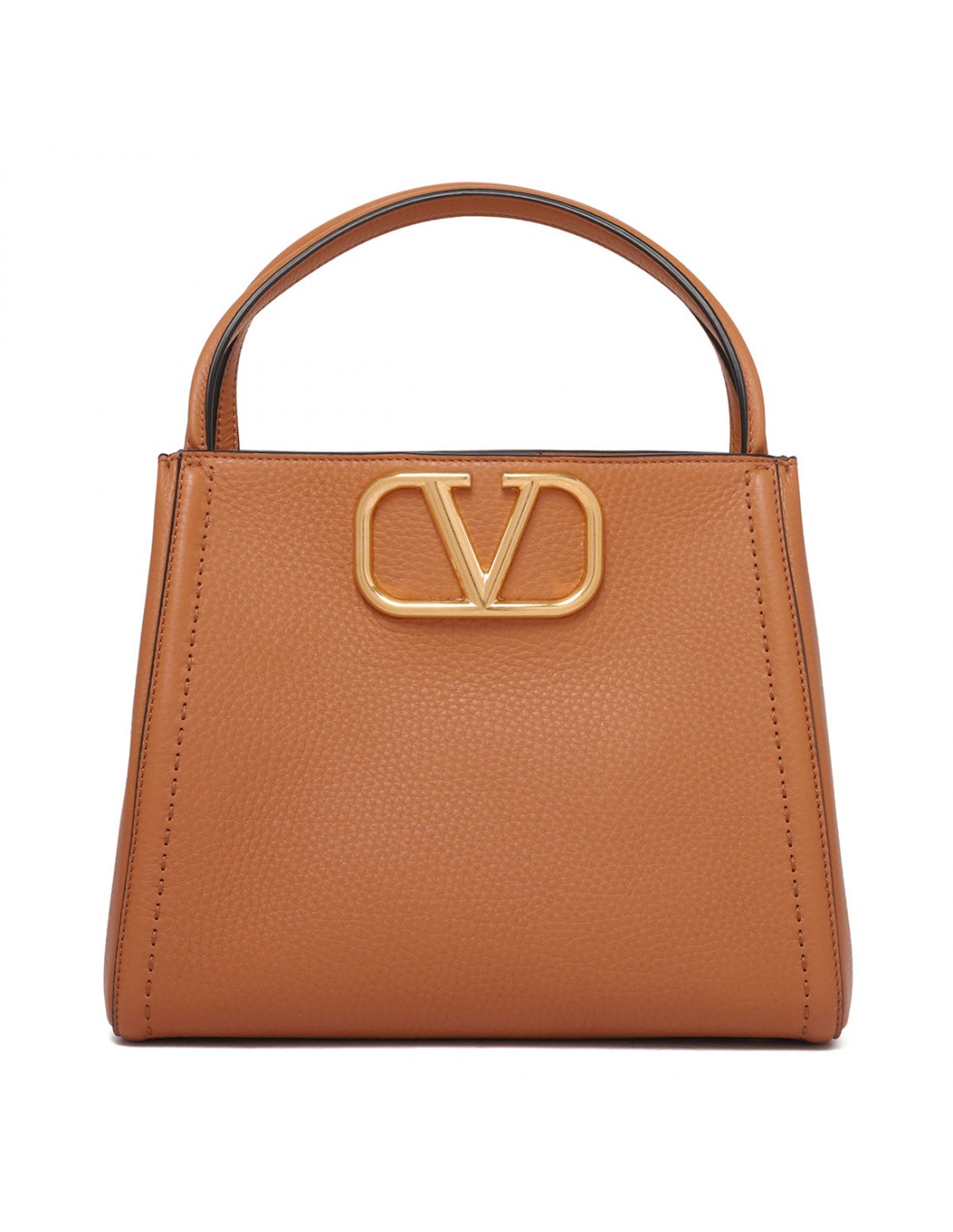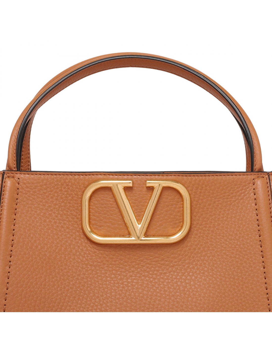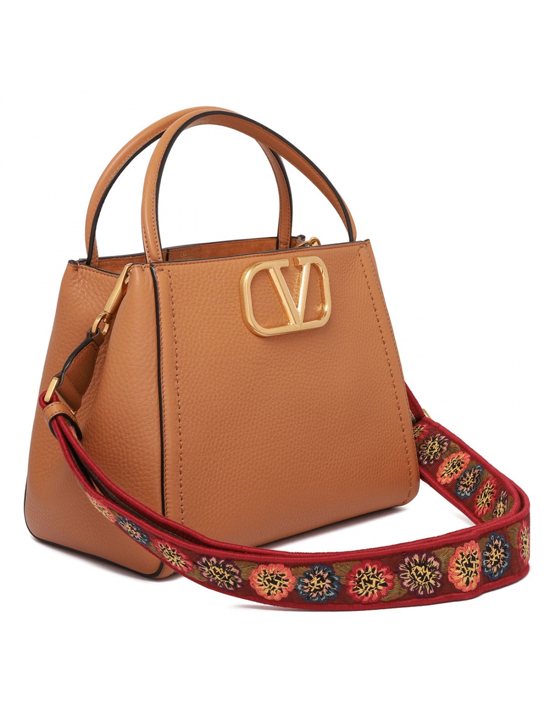 Almond beige calfskin Vsling medium handbag from Valentino Garavani featuring gold-tone metal VLogo Signature closure, gold-tone hardware, magnetic logo closure, double top handle, detachable and adjustable jacquard shoulder strap, protective feet, nappa leather lining, internal pocket.