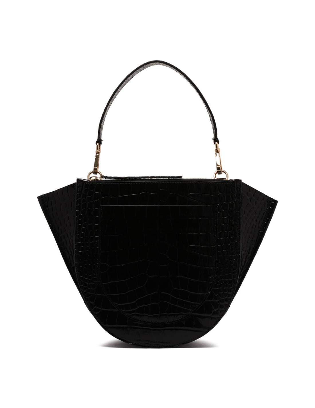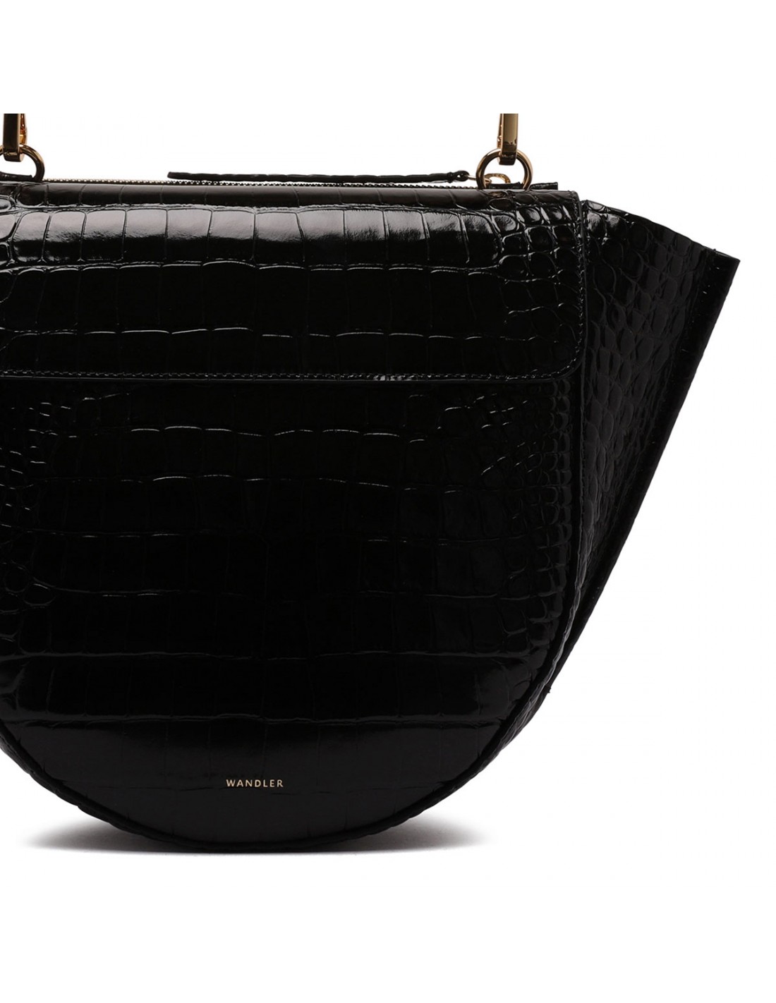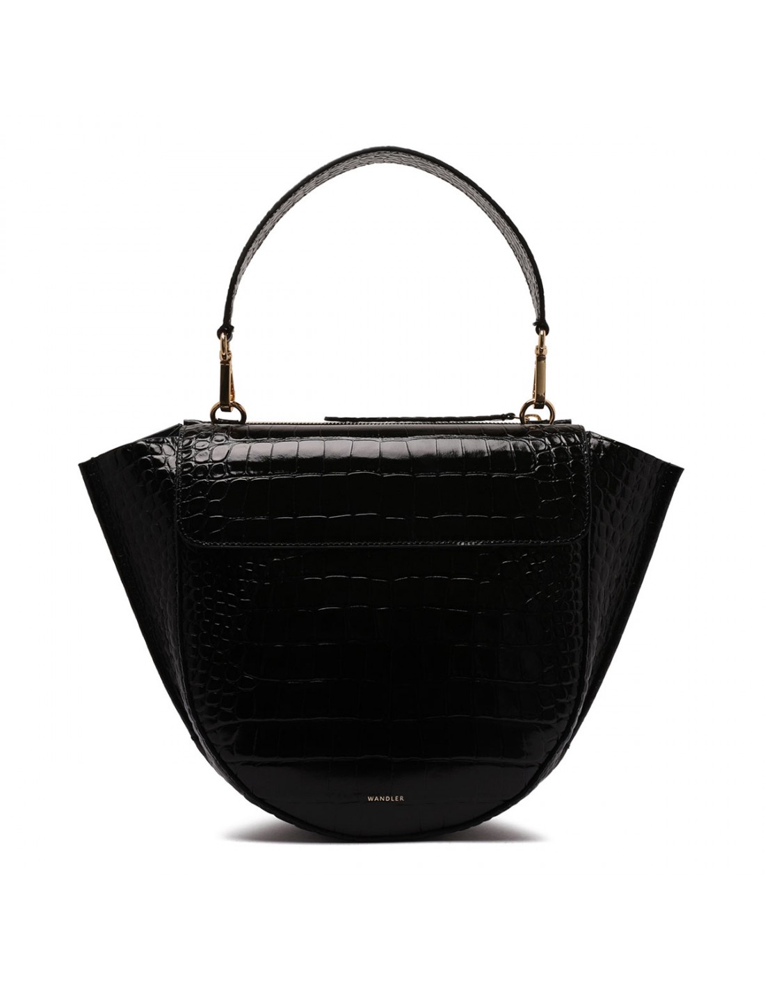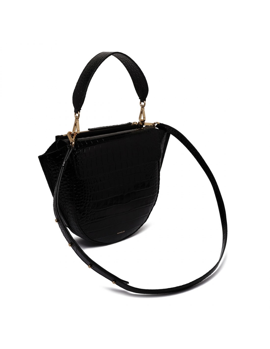 Black croc-embossed leather Hortensia medium bag from Wandler featuring magnetic closure, one main compartment, back external pocket with zip fastening, single top handle, black hand-painted edges, detachable shoulder strap, internal slip pocket.