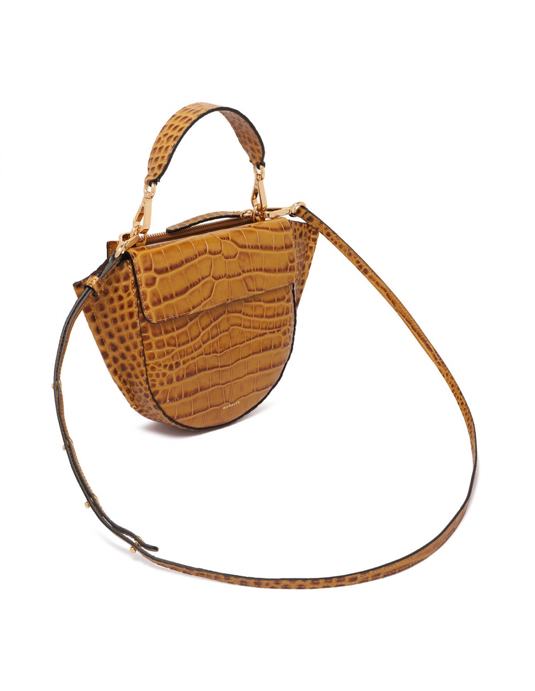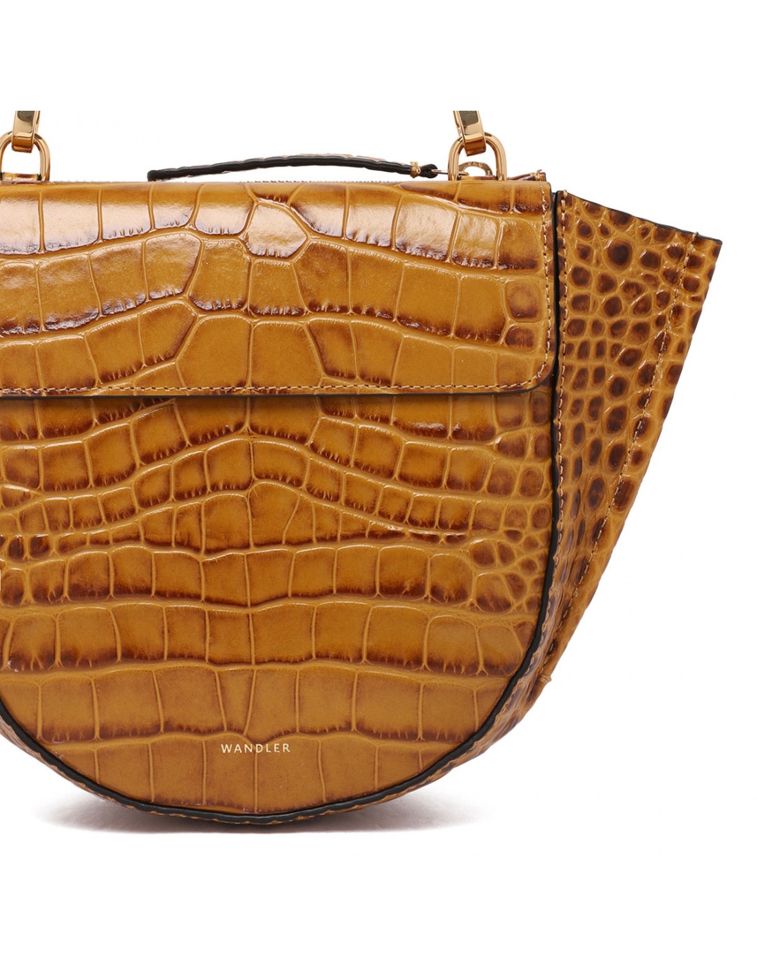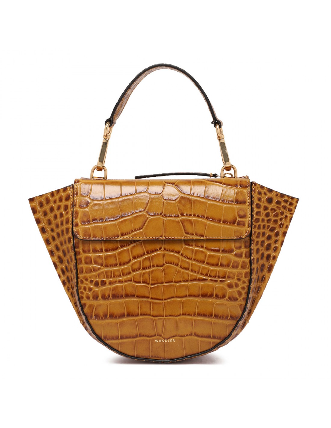 Saddle hue croc-embossed leather Hortensia mini bag from Wandler featuring magnetic closure, one main compartment, back external pocket with zip fastening, single top handle, black hand-painted edges, detachable shoulder strap, internal slip pocket.