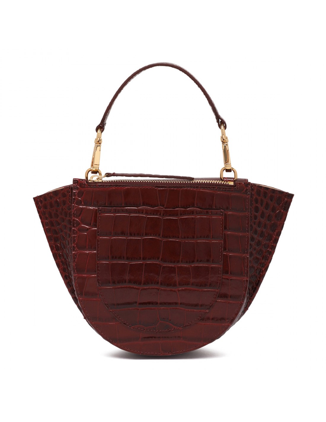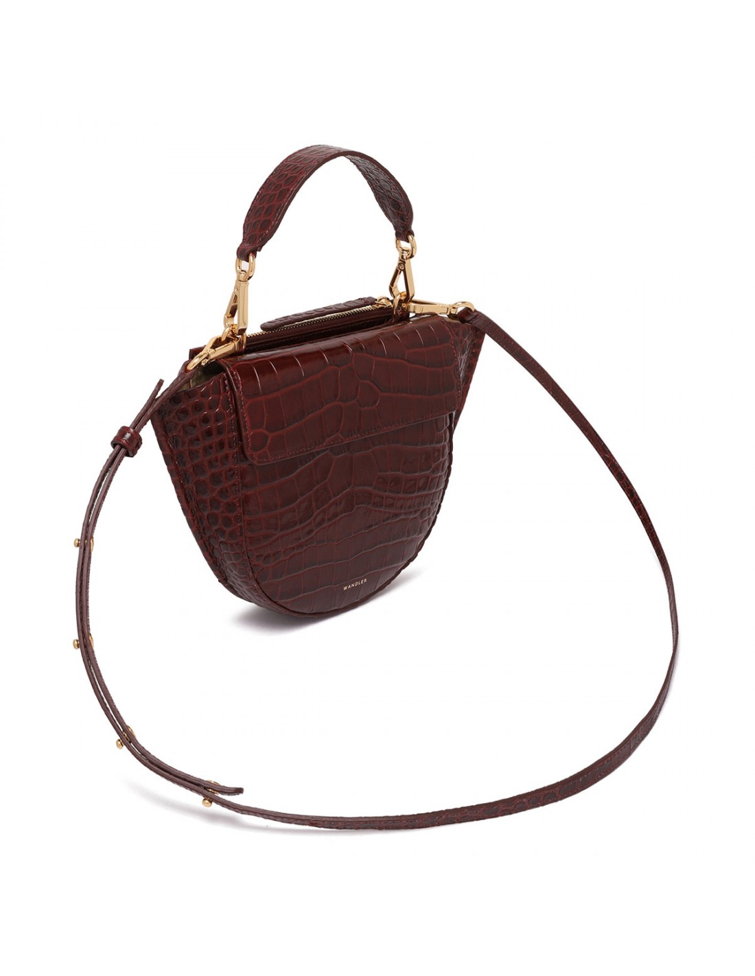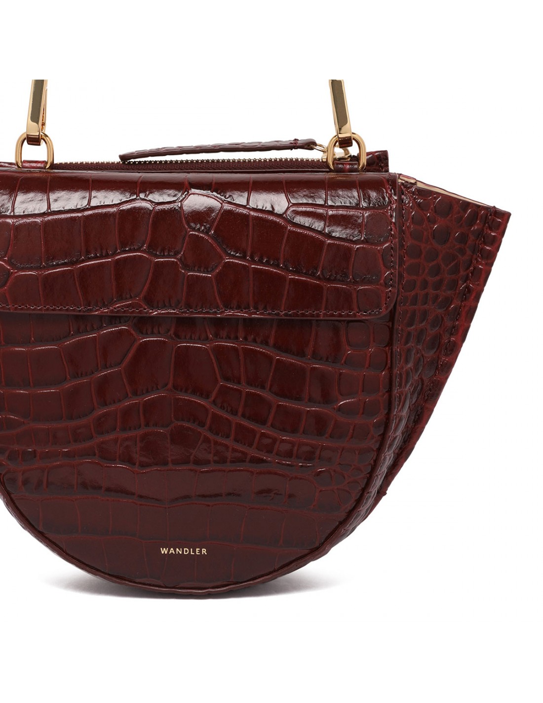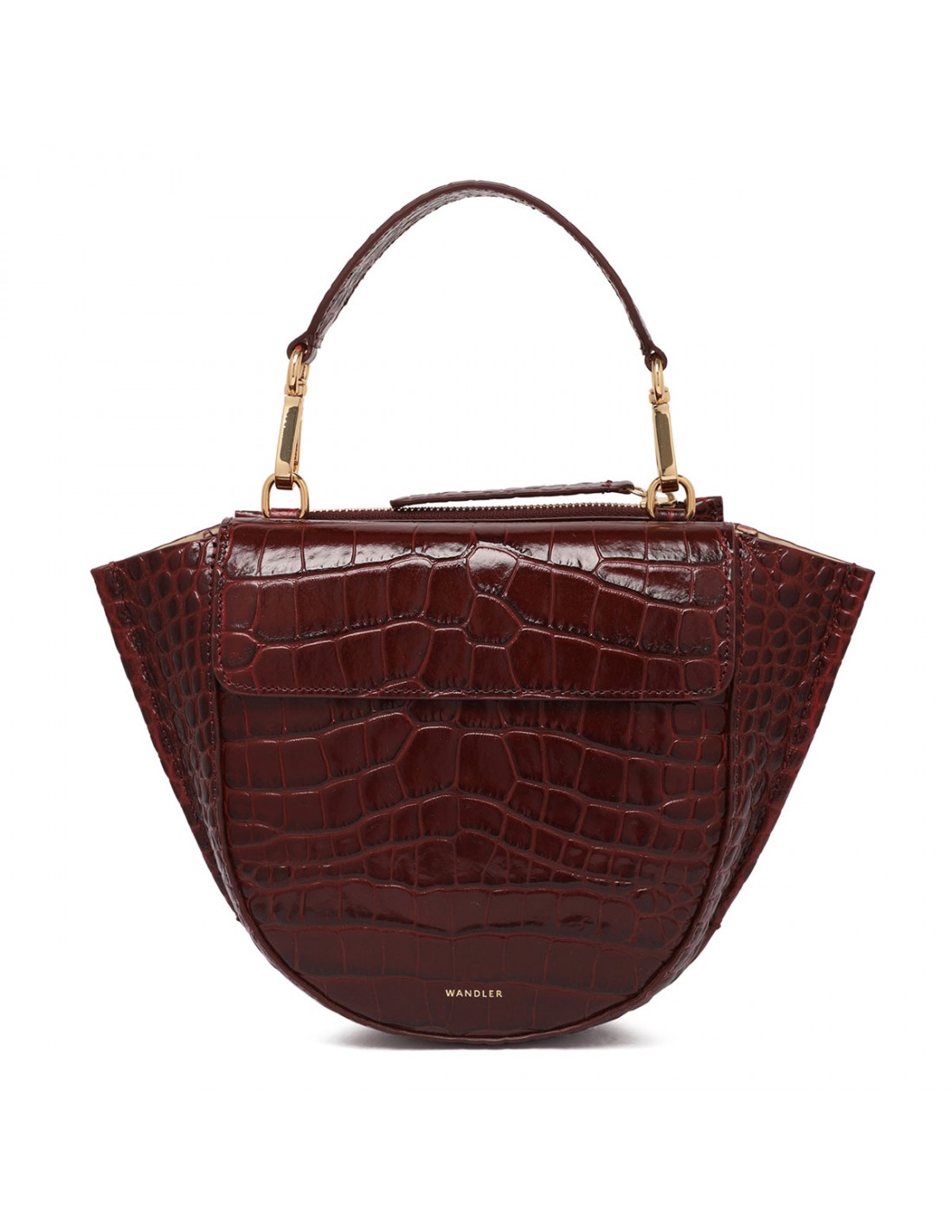Bordeaux croc-embossed leather Hortensia mini bag from Wandler featuring magnetic closure, one main compartment, back external pocket with zip fastening, single top handle, black hand-painted edges, detachable shoulder strap, internal slip pocket.