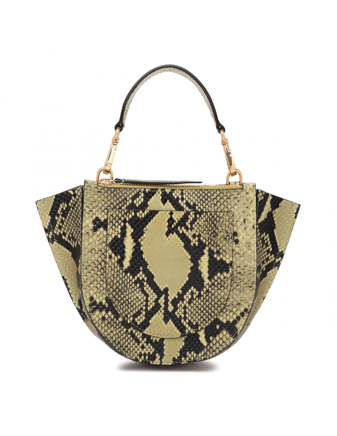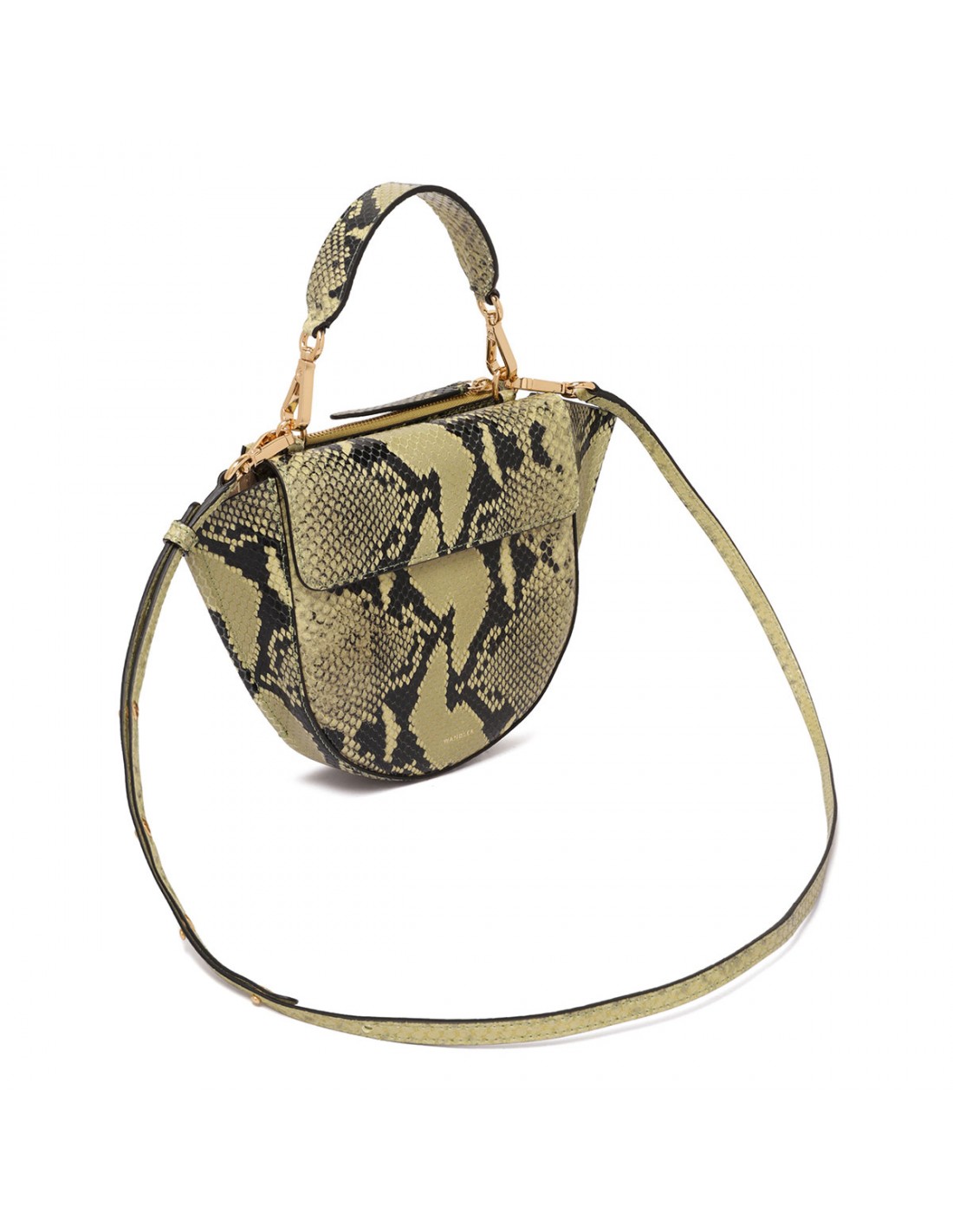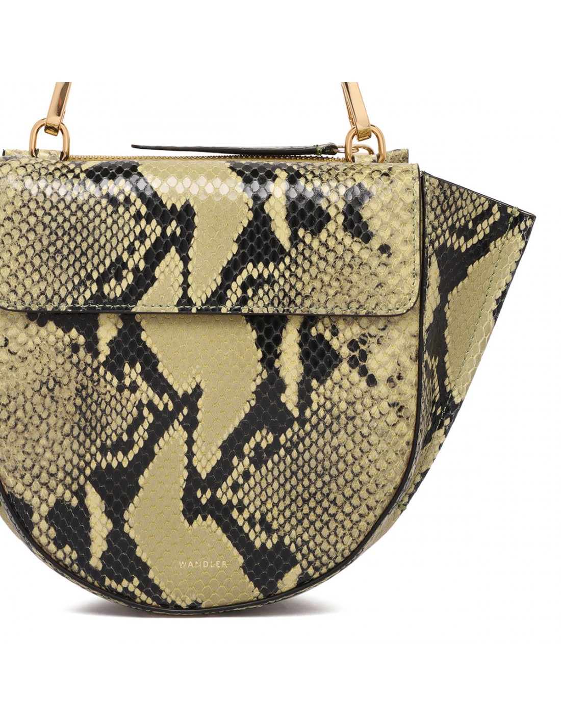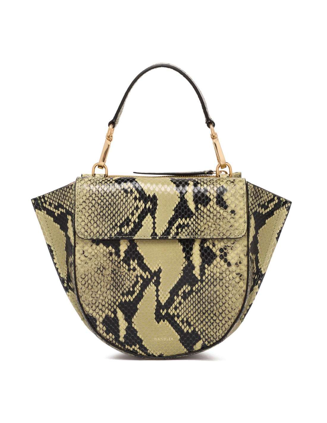 Lime hue leather Hortensia mini bag from Wandler featuring python motif, magnetic closure, one main compartment, back external pocket with zip fastening, single top handle, black hand-painted edges, detachable shoulder strap, internal slip pocket.