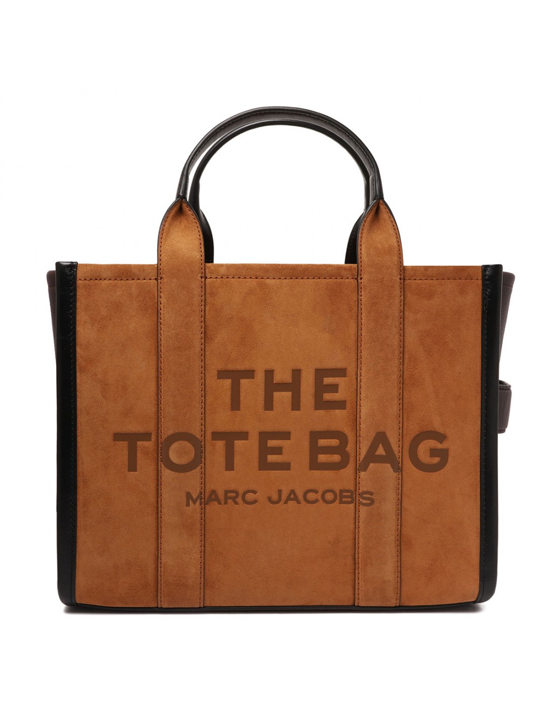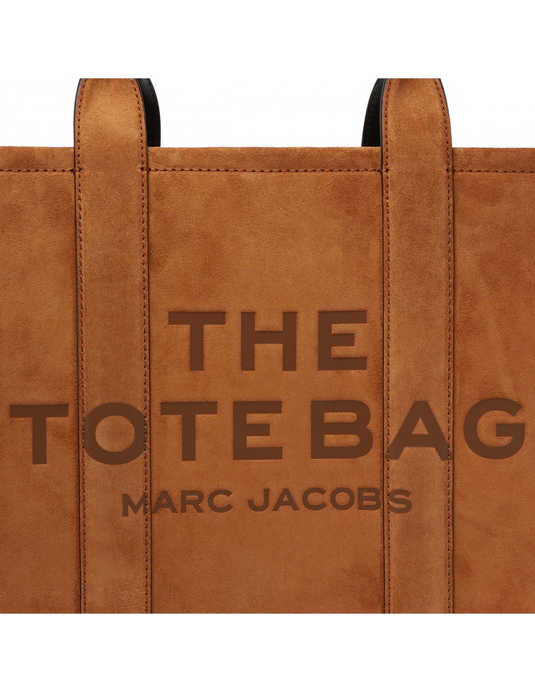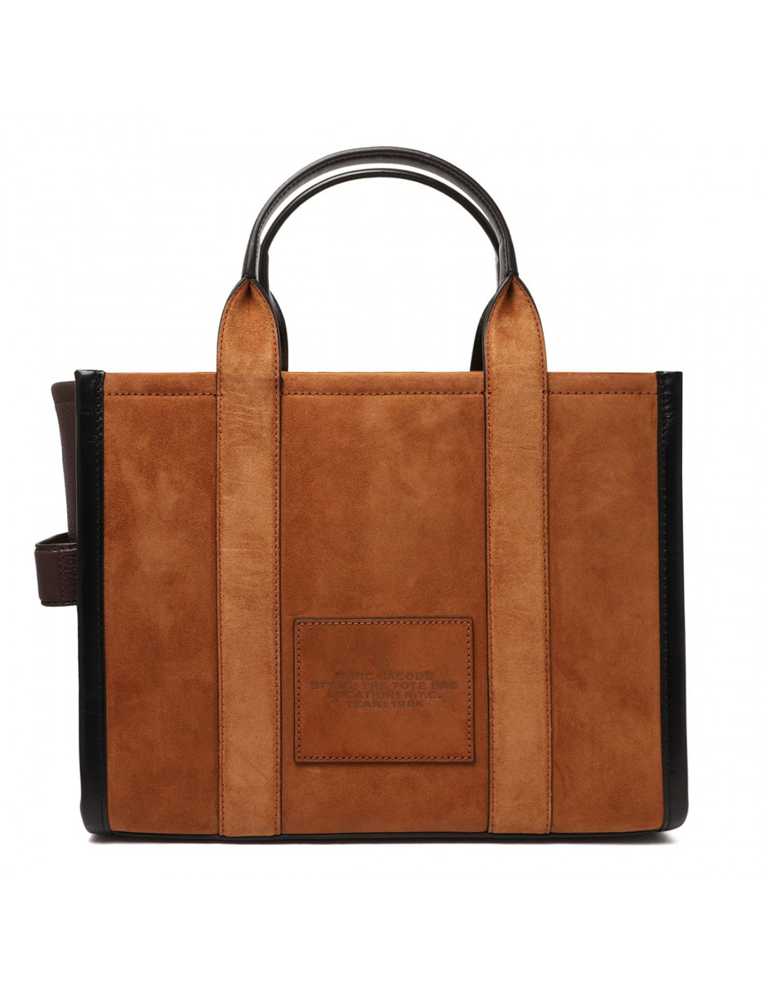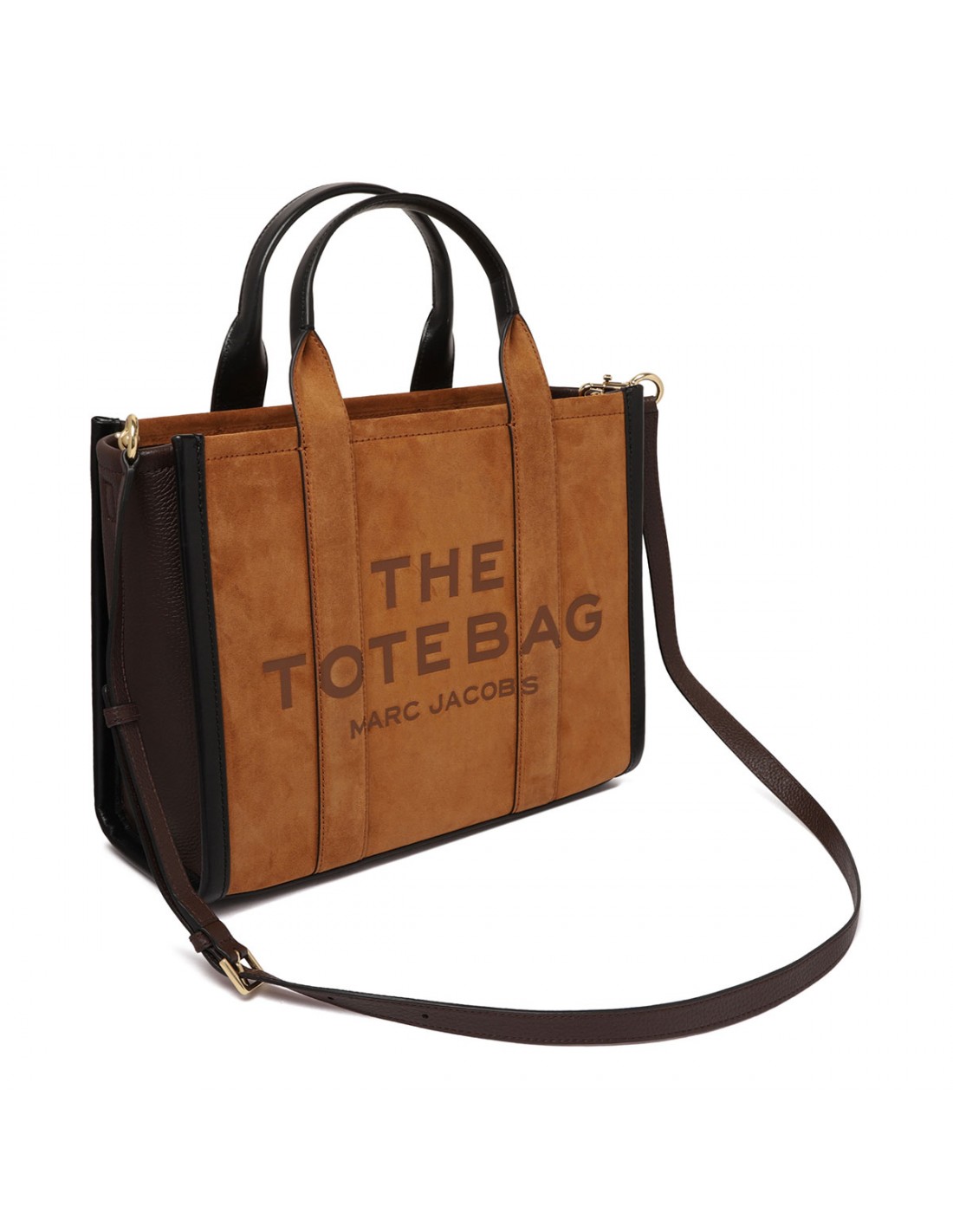 Copper hue suede leather The medium tote bag from Marc Jacobs with contrasting leather detail, small logo patch, zip fastening along top, removable and adjustable leather strap, leather top handles, twill lining, internal zipped and slip pockets, internal cardslot.