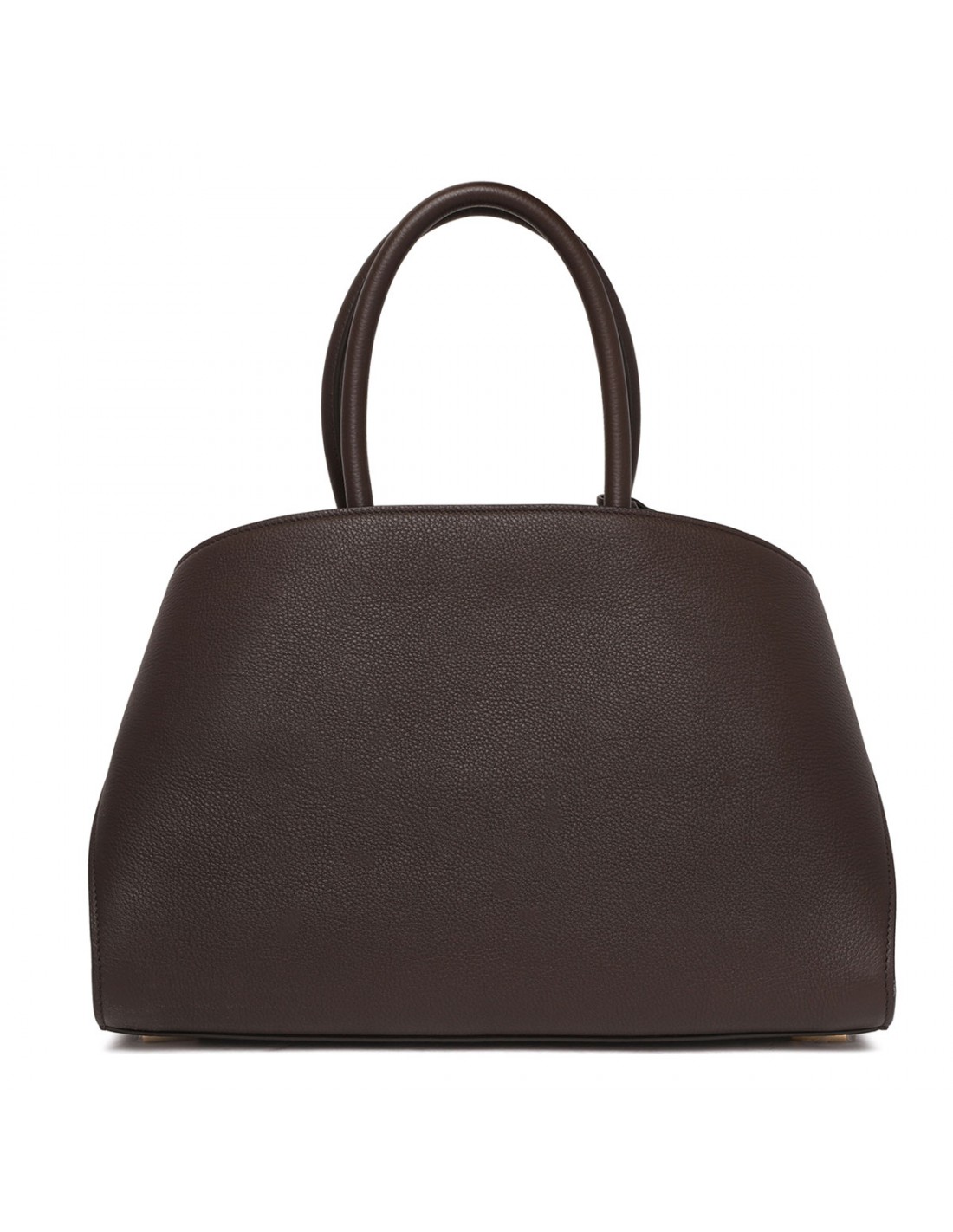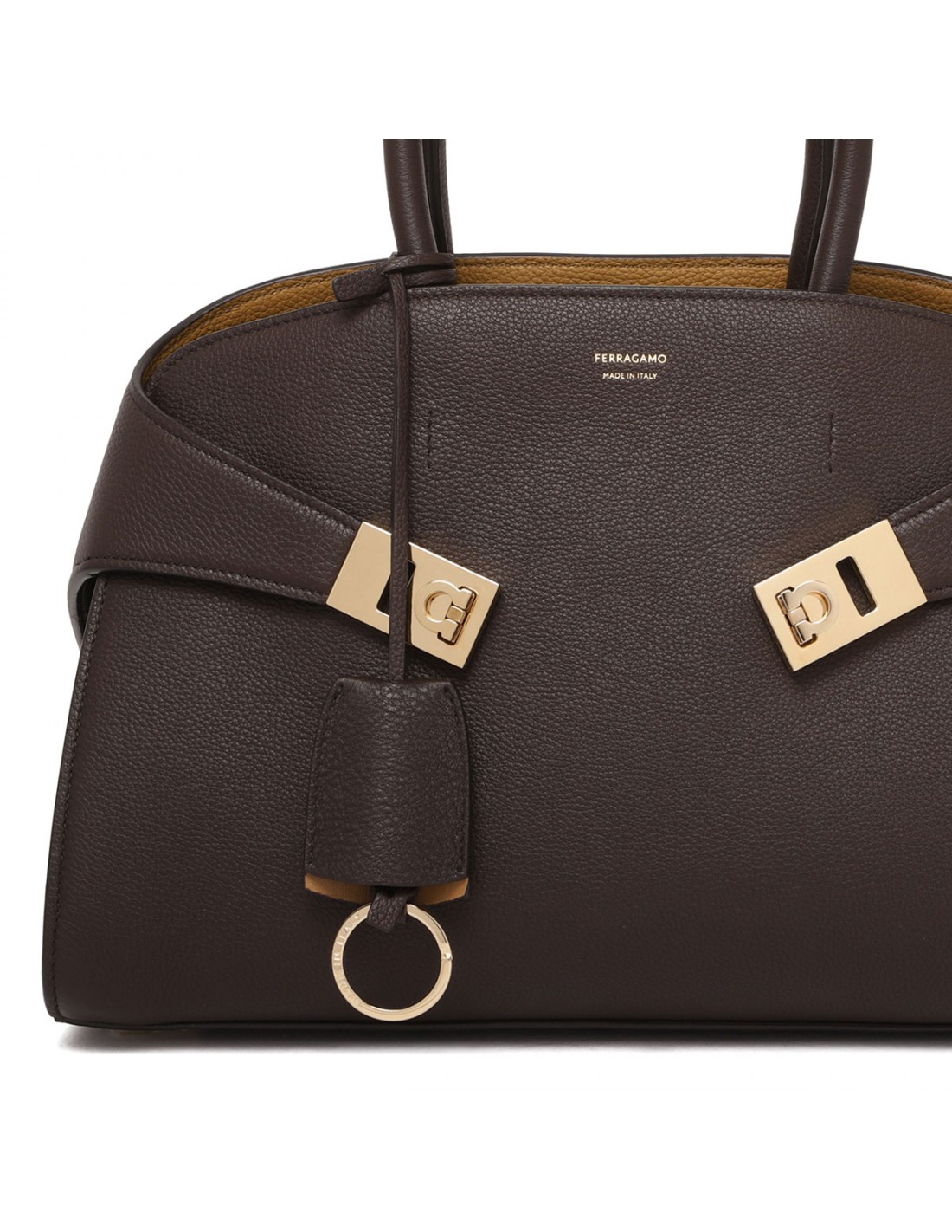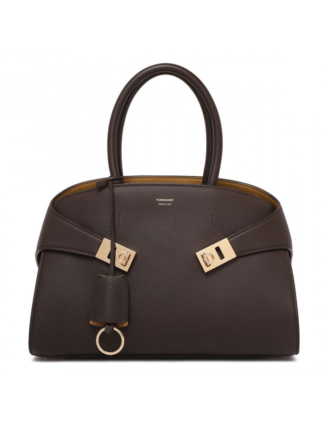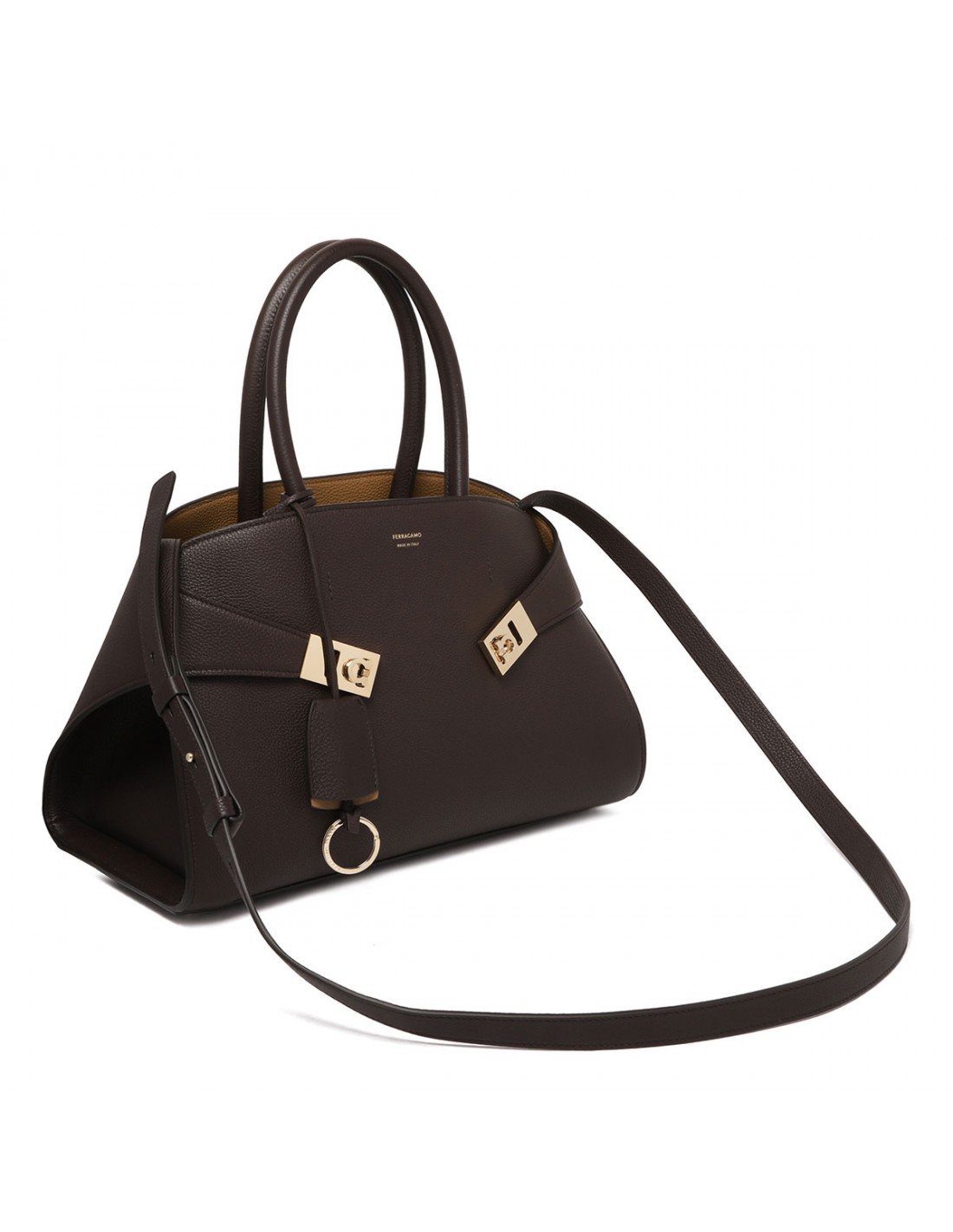 Dark brown grainy leather Hug S handbag from Ferragamo featuring asymmetric silhouette, gold-tone Gancini buckles, concealed ring closure, key ring charm, one internal zip pocket.