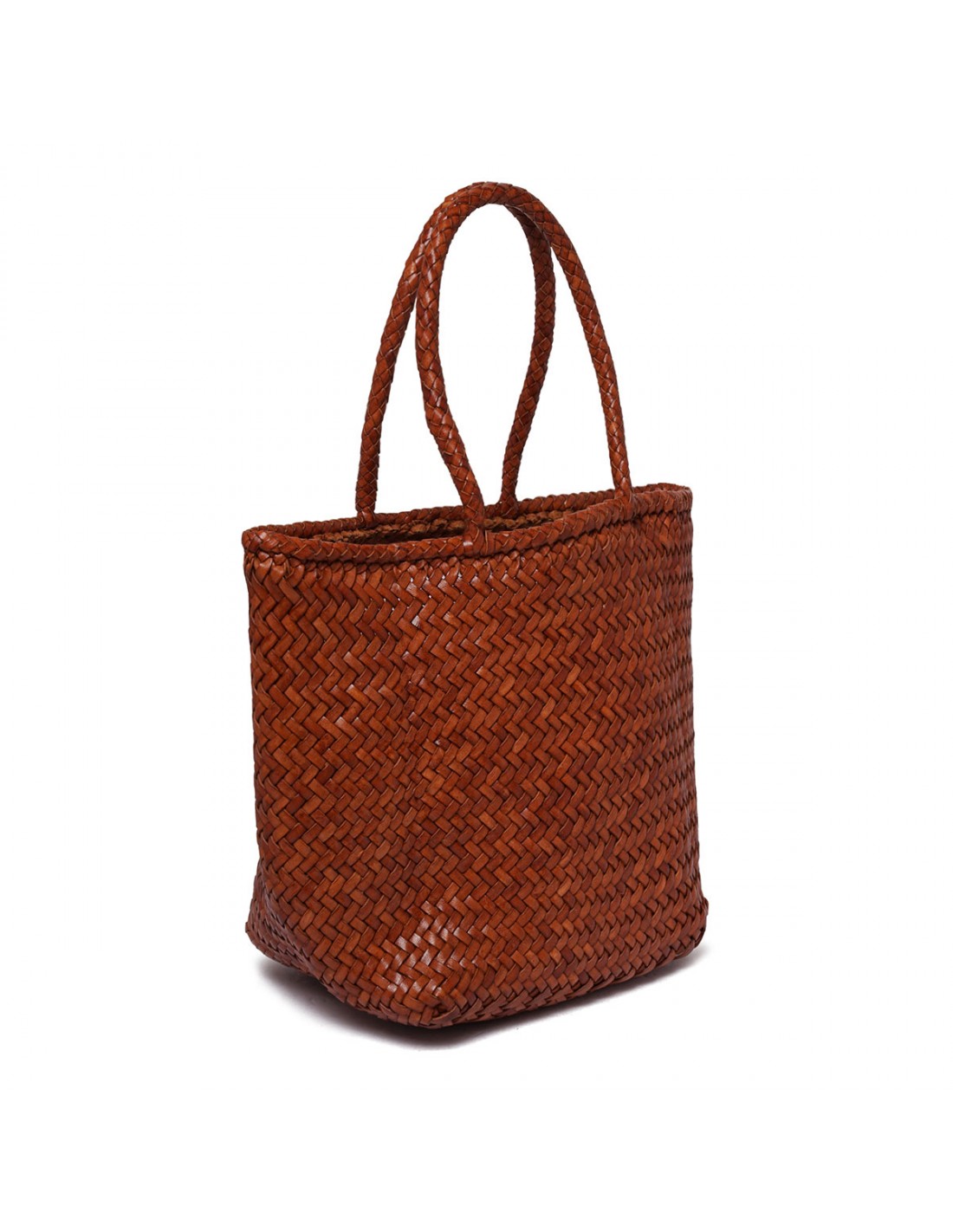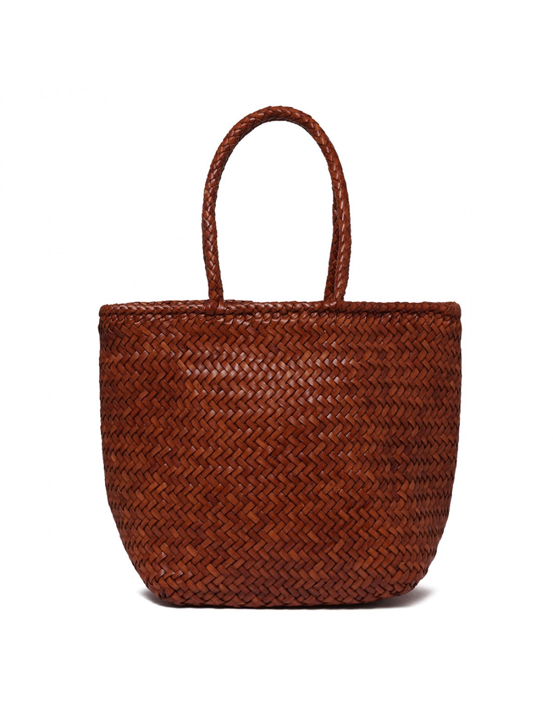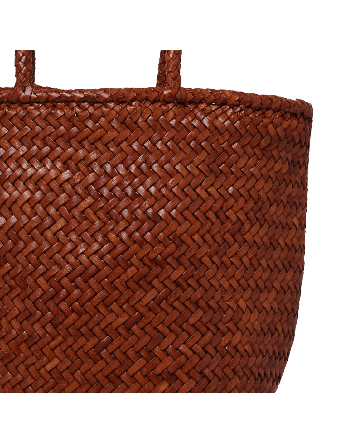 Dark red woven buffalo leather Grace small basket bag from Dragon Diffusion featuring distinctive diagonal weave, rounded sides, braided leather top handles, antiqued St. Christopher medal charm hand-sewn inside the bag.