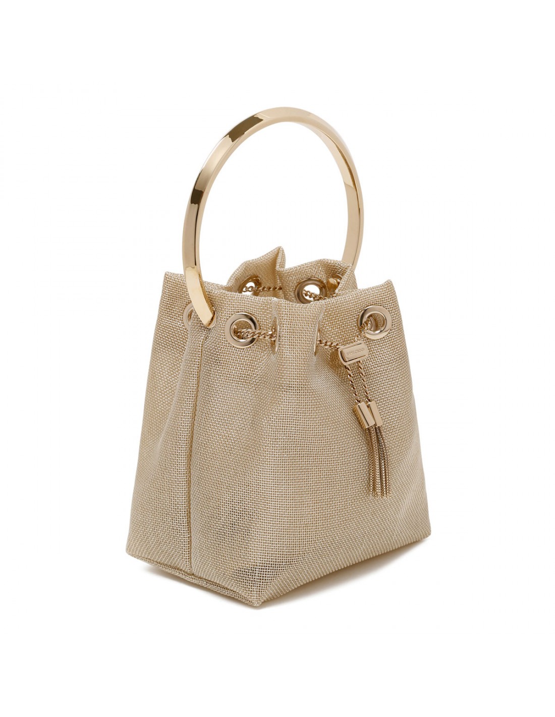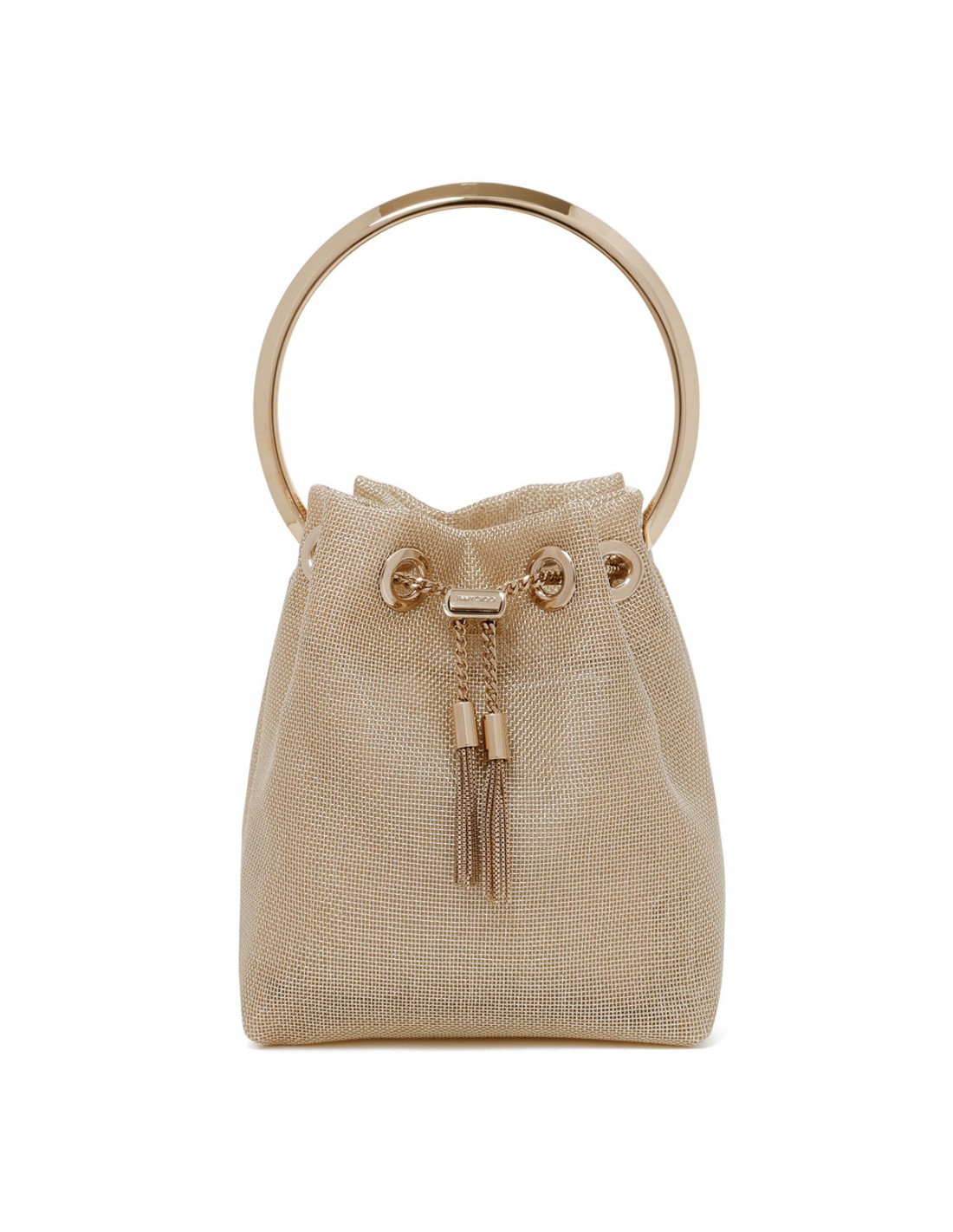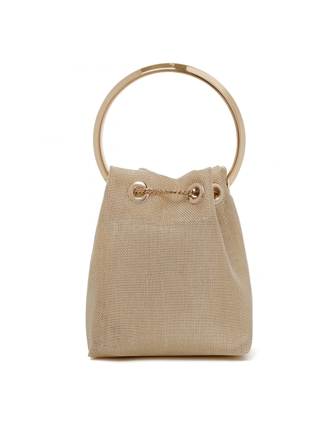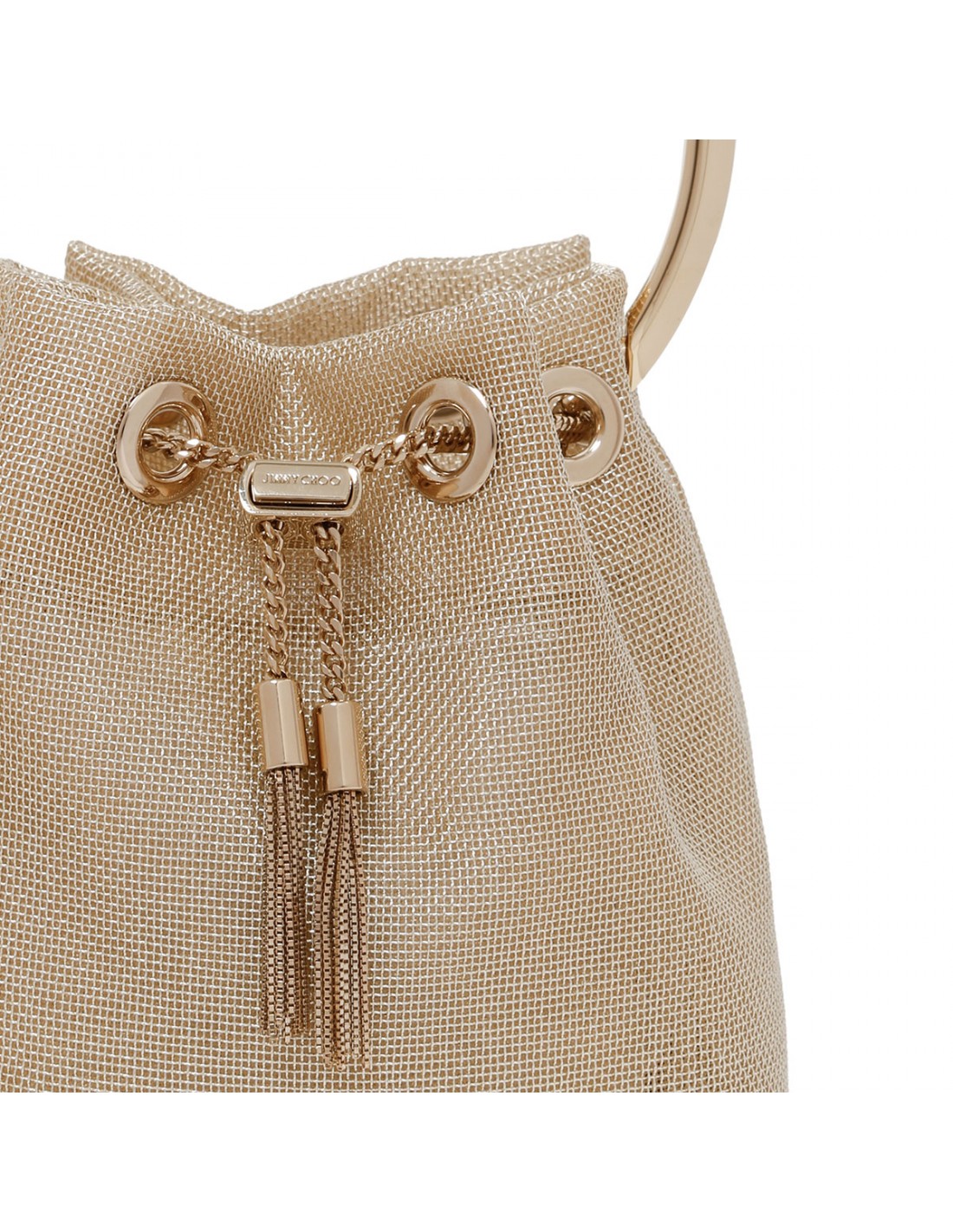Champagne hue metallic mesh Bon Bon bag from Jimmy Choo featuring gold metal bracelet top handle, chain drawstring fastening, chain shoulder strap, sustainable fabric lining.
