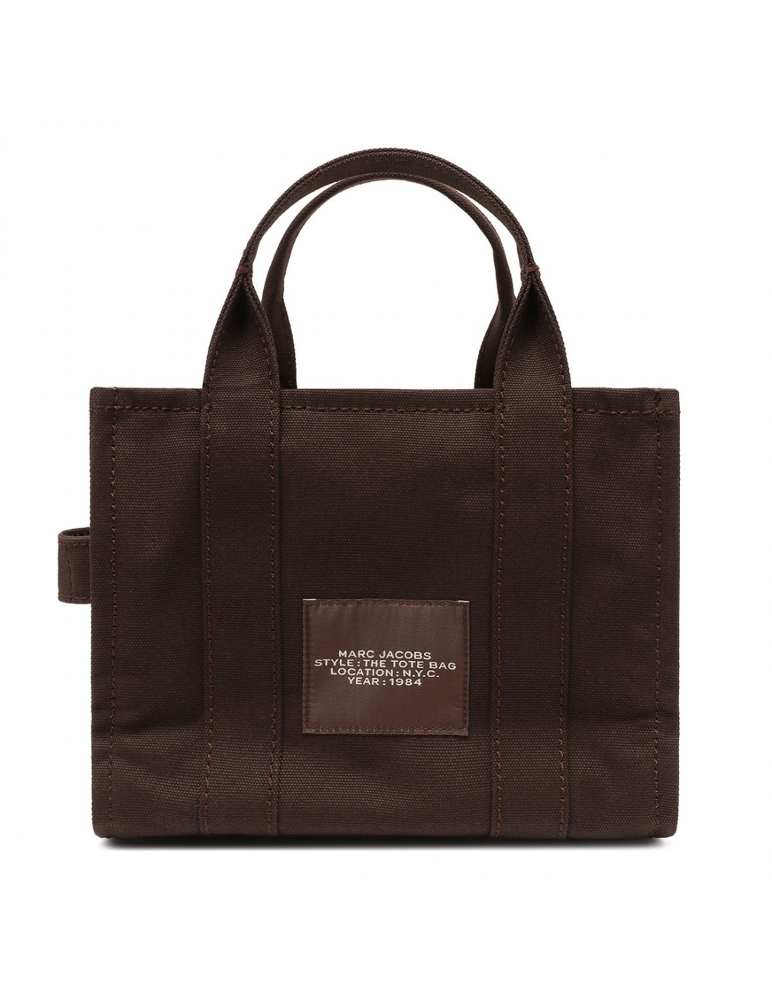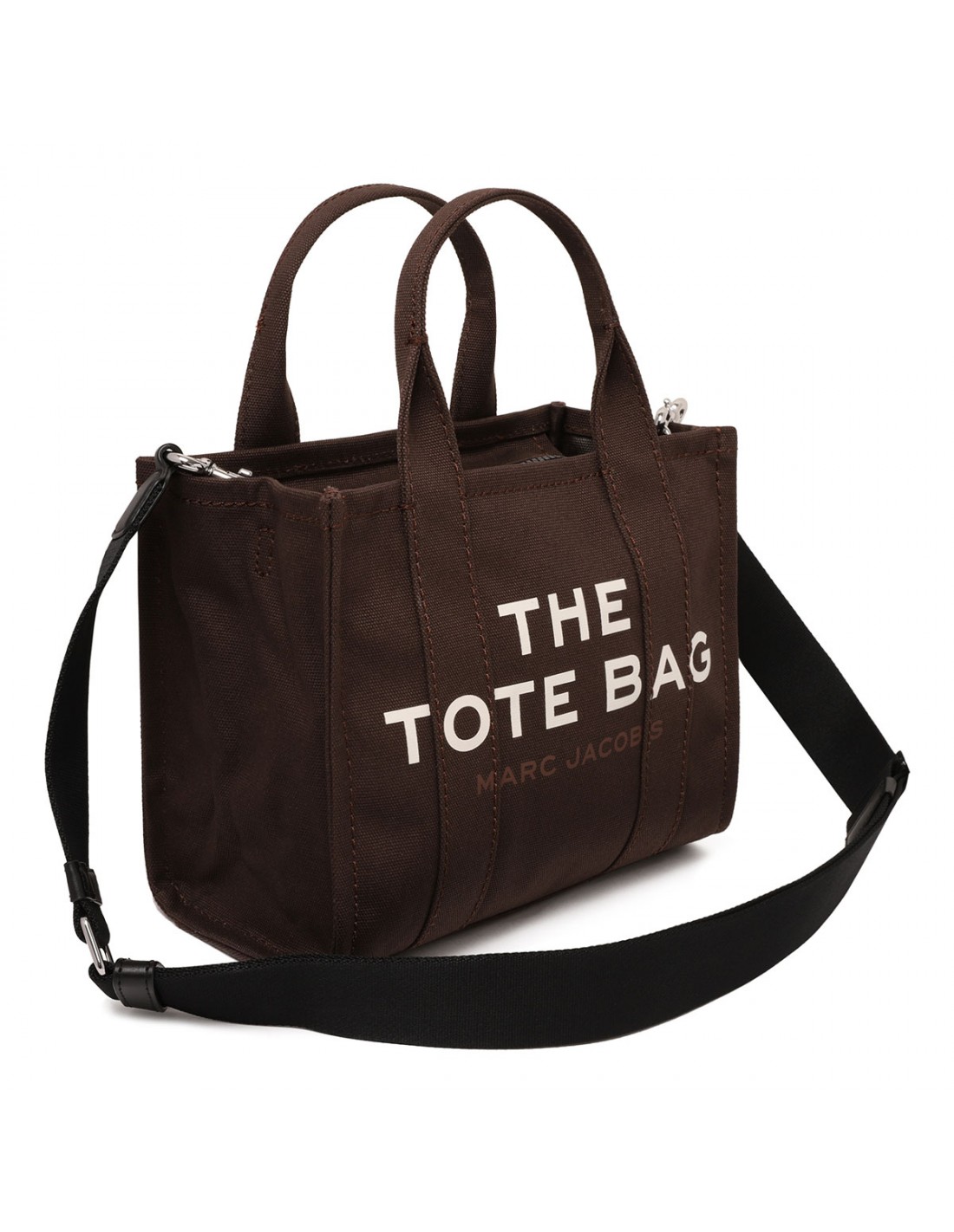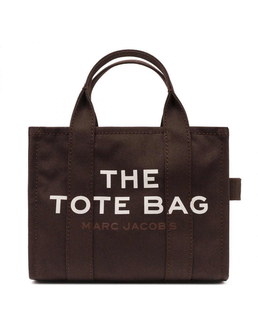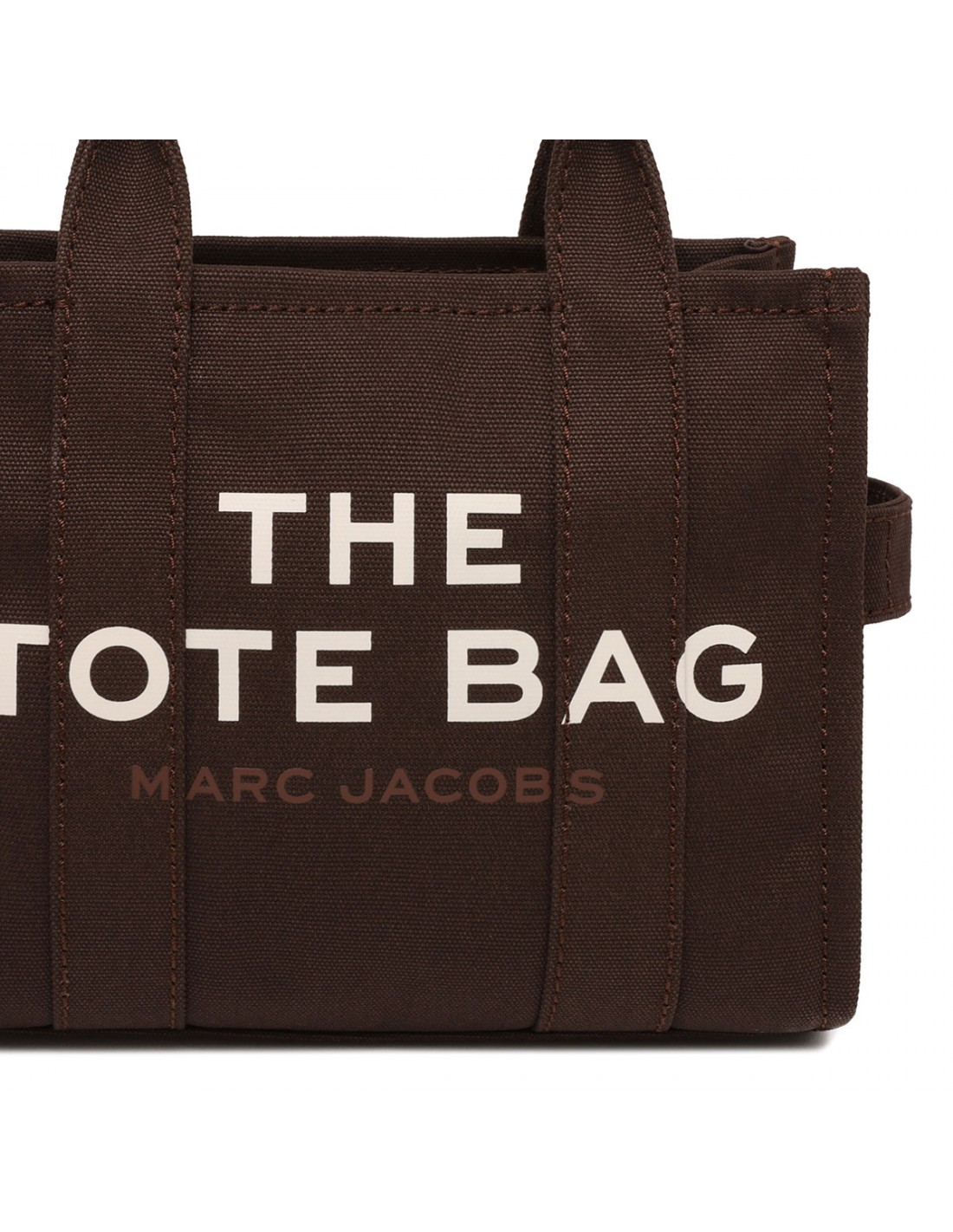 Chocolate brown hue canvas The Tote mini bag from Marc Jacobs featuring contrasting logo print, small logo patch, zip fastening along top, detachable and adjustable webbing shoulder strap, canvas top handles.