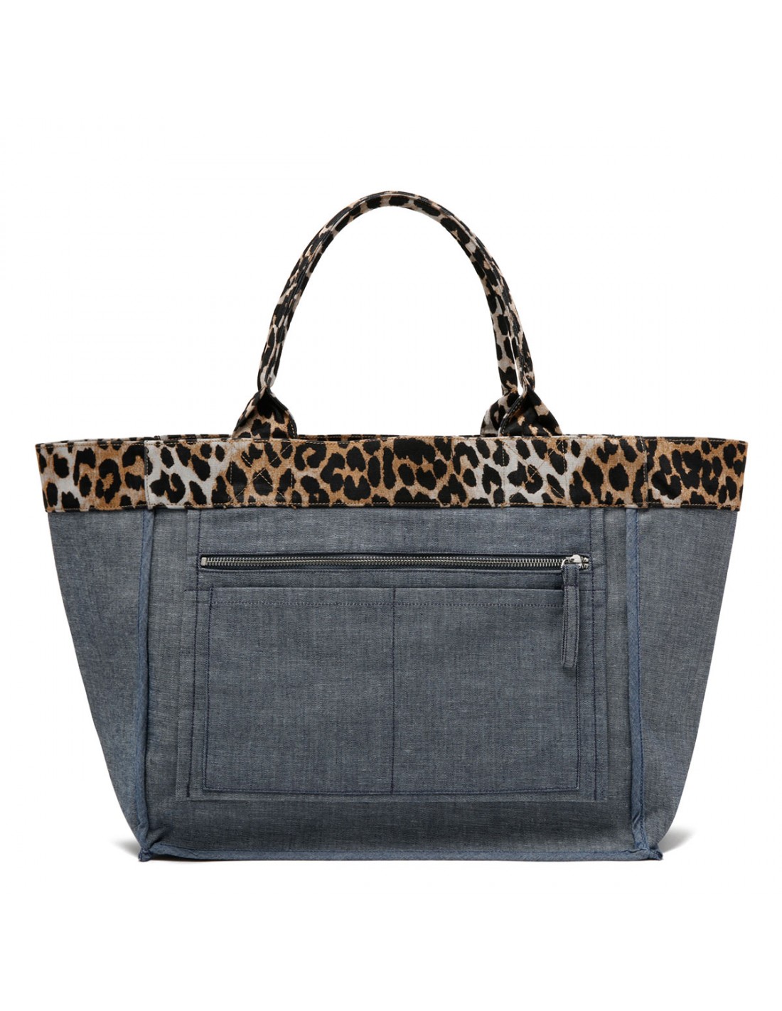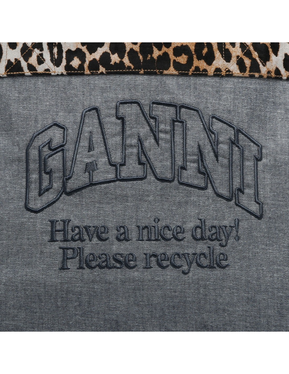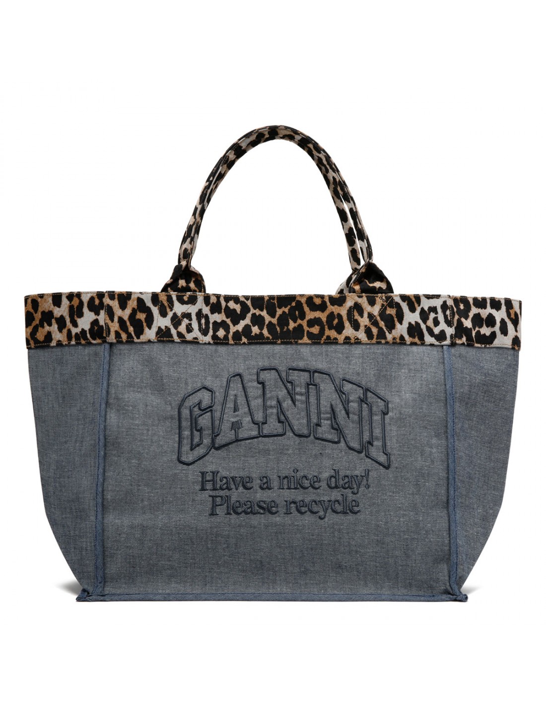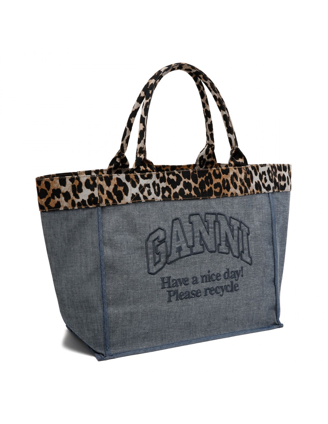 Reversible medium tote bag from Ganni featuring one side in leopard fabric and other side in denim, logo with the phrase Have a nice day! Please recycle embroidered on both sides, open top, shoulder straps, zipped pocket.