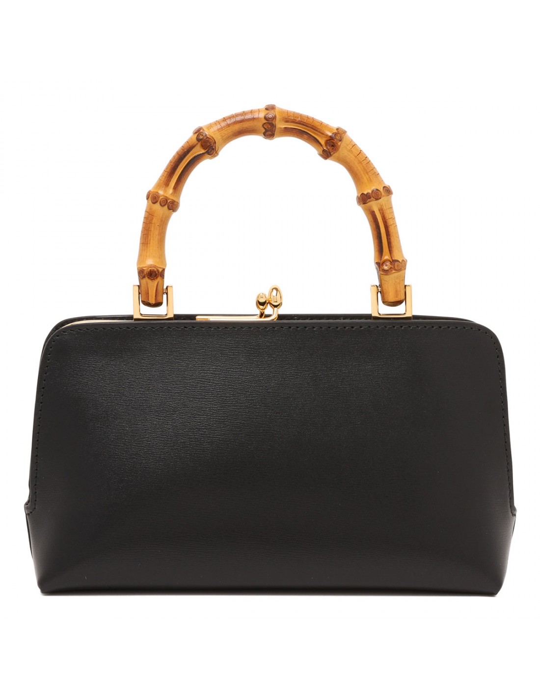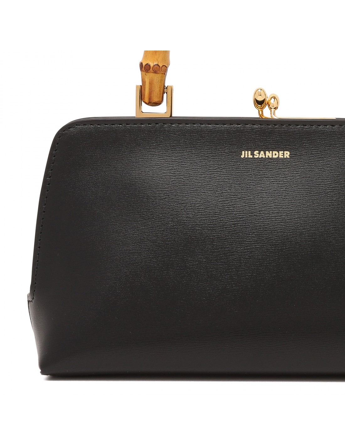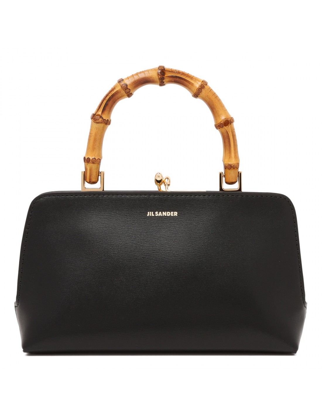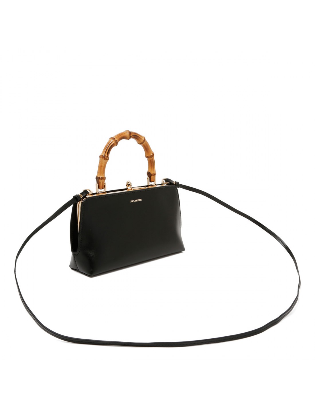 Black leather Goji mini handbag from Jil Sander featuring metal frame detail, embossed Jil Sander logo, bamboo top handle, clutch closure, adjustable and detachable shoulder strap and internal zipped pocket.
