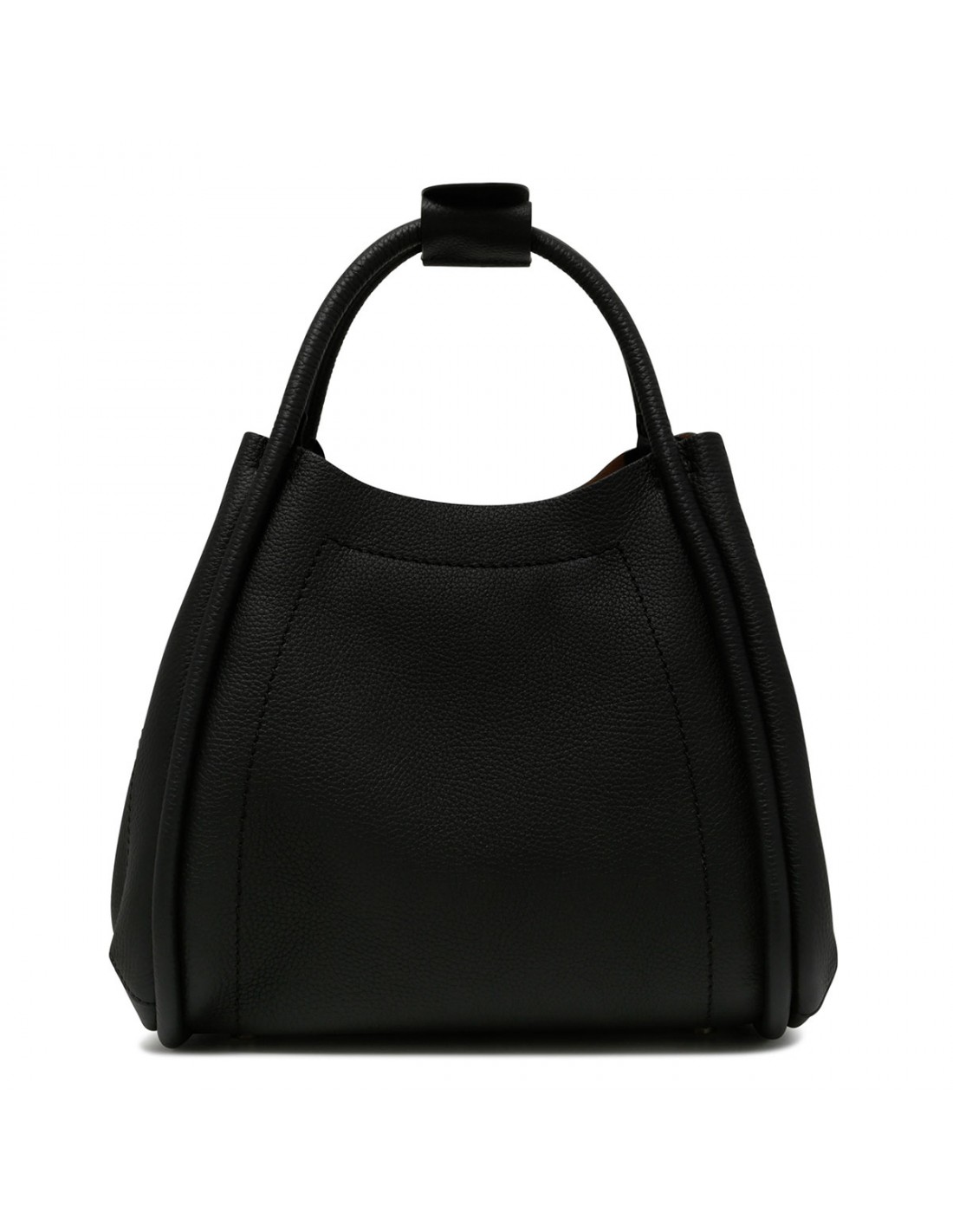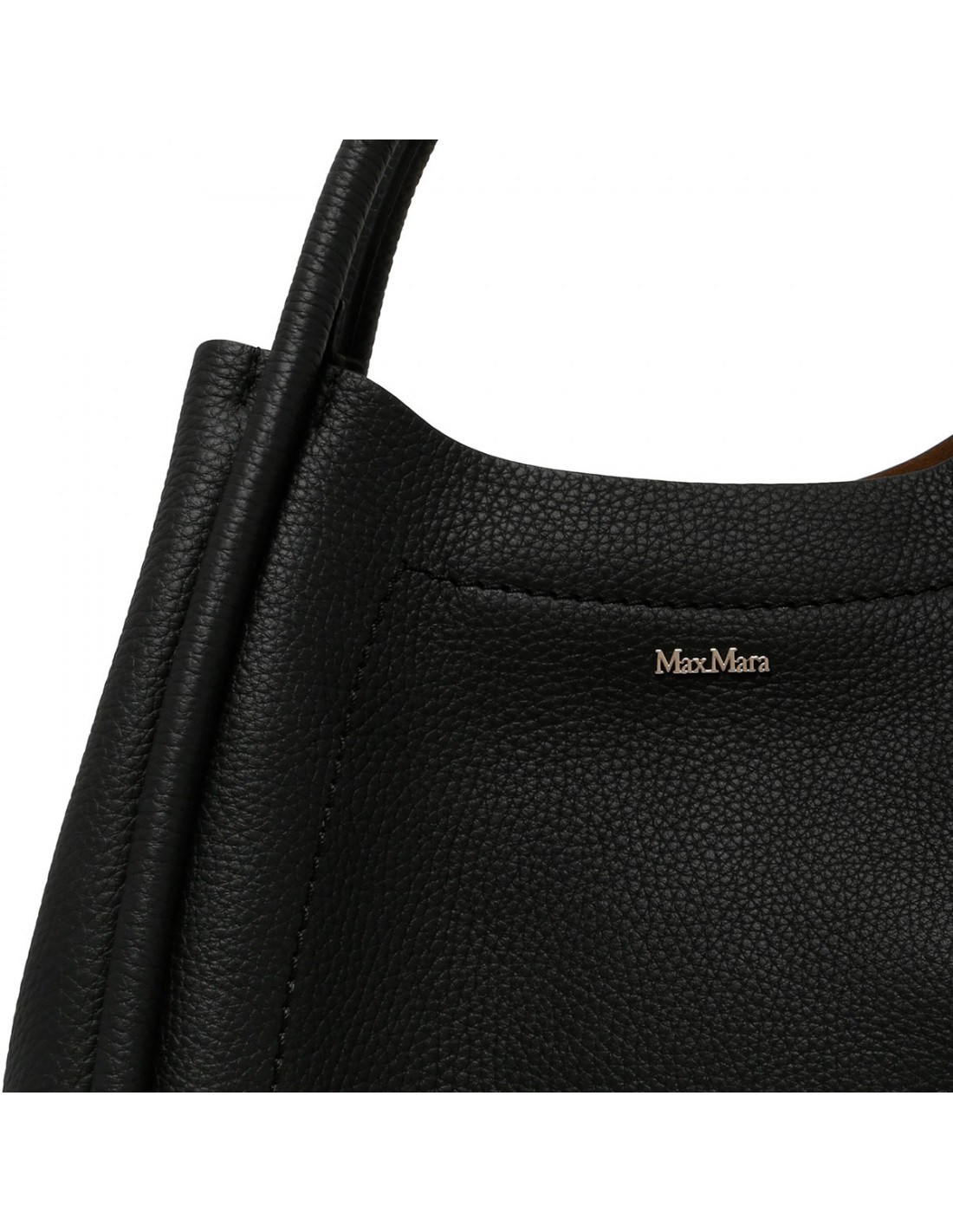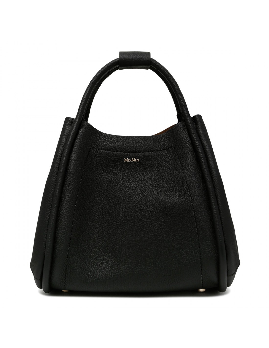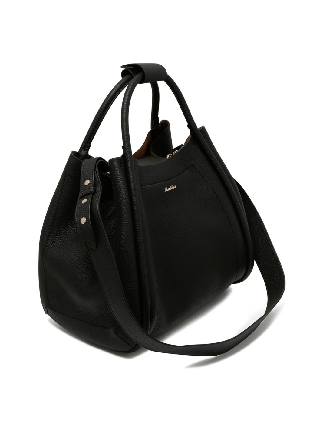 Black tumbled calfskin Marine small bag from Max Mara featuring rounded shape, extendable sides, magnetic snap fastening, tubular handles with snap button bracelet, detachable shoulder strap, logo lettering on front.