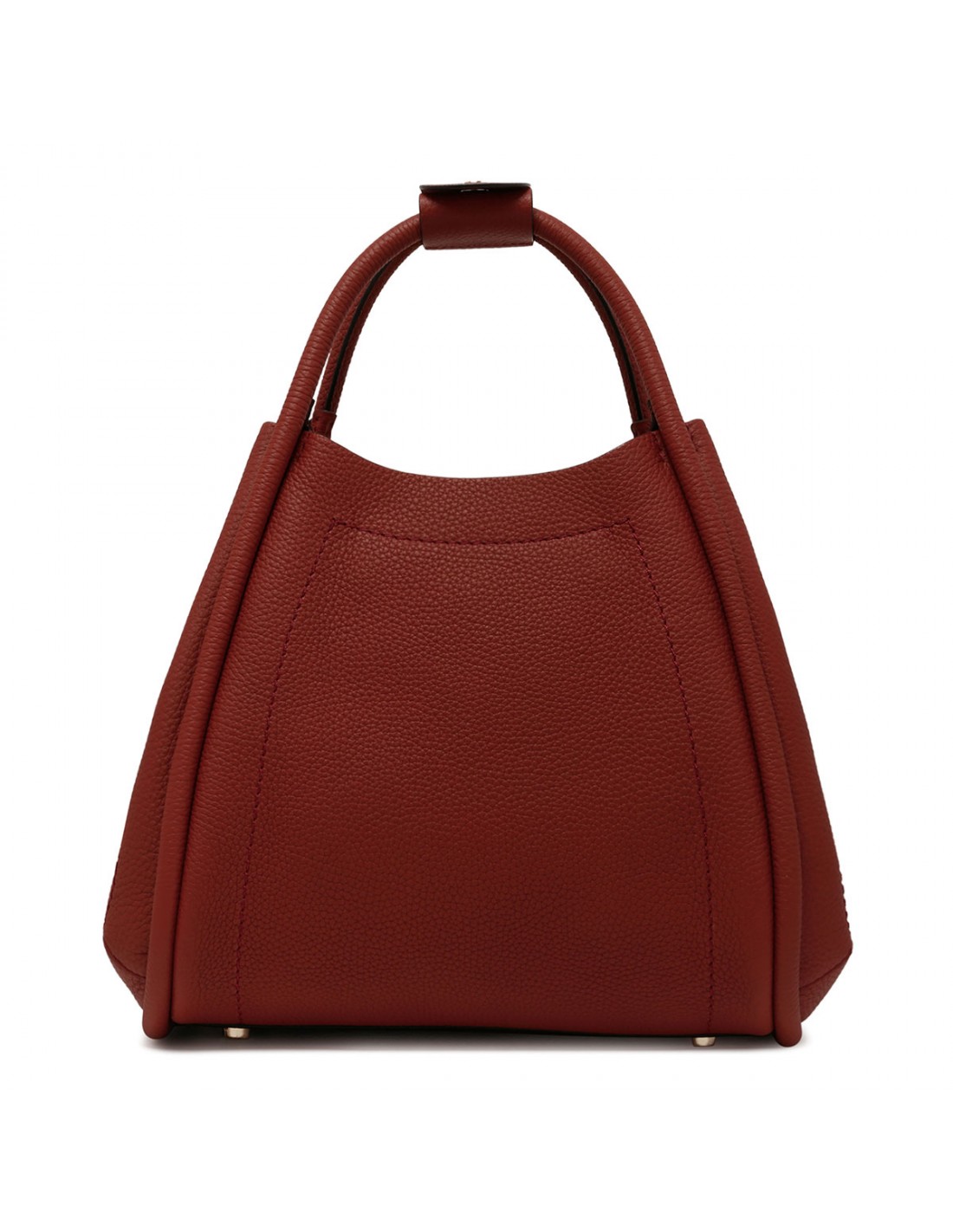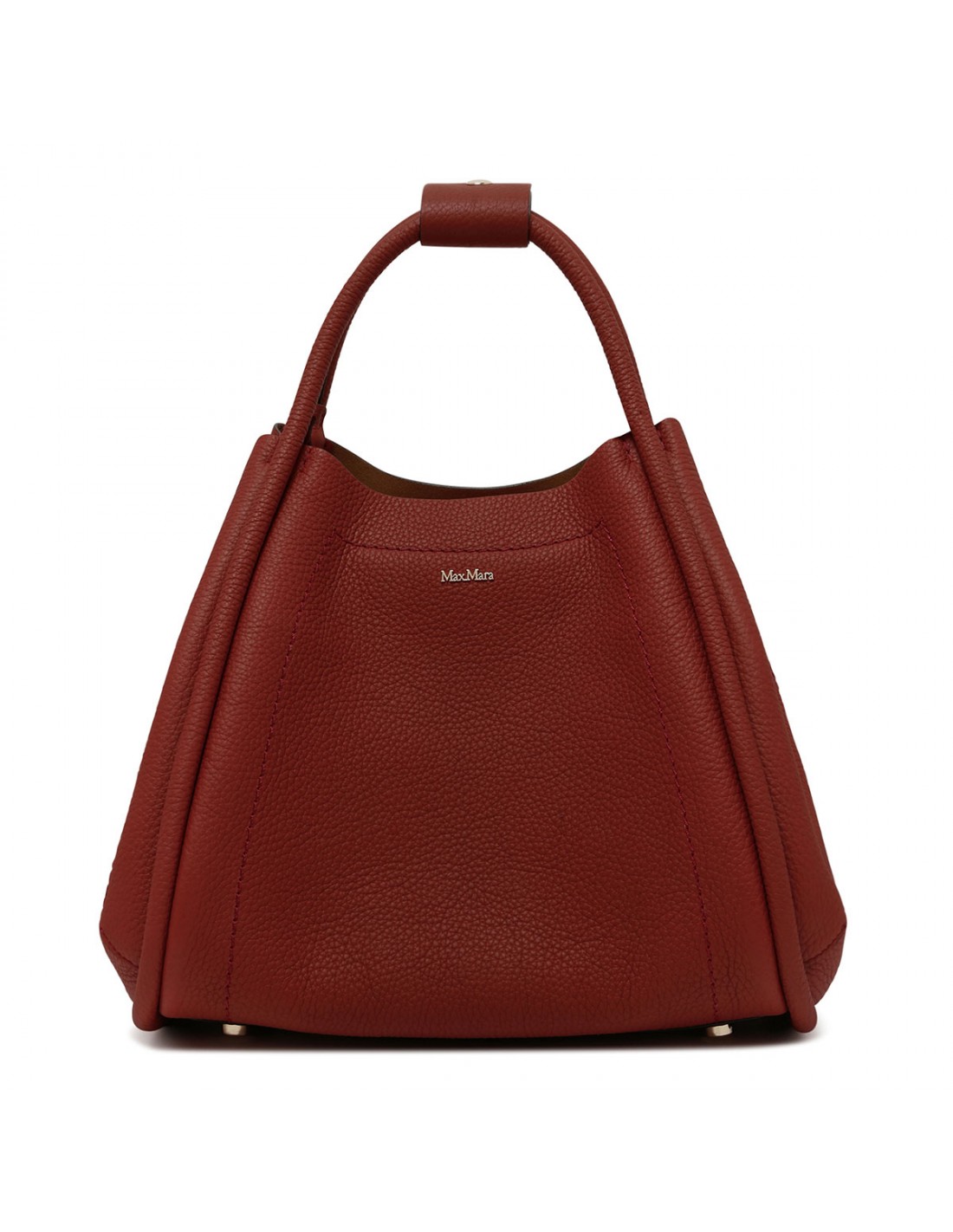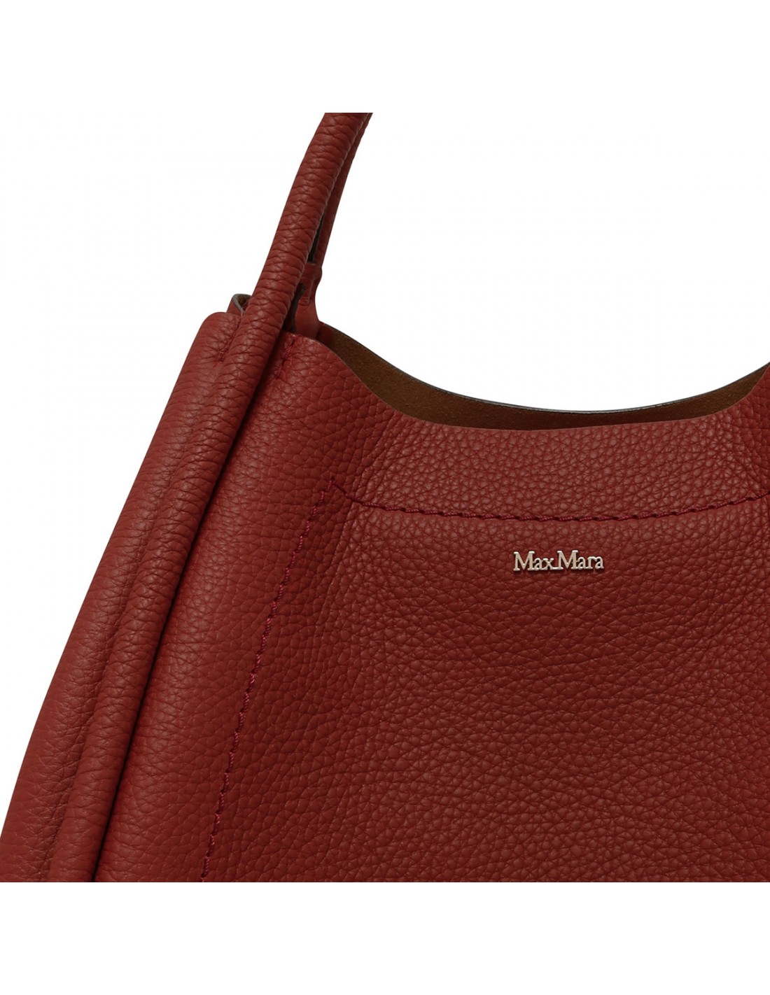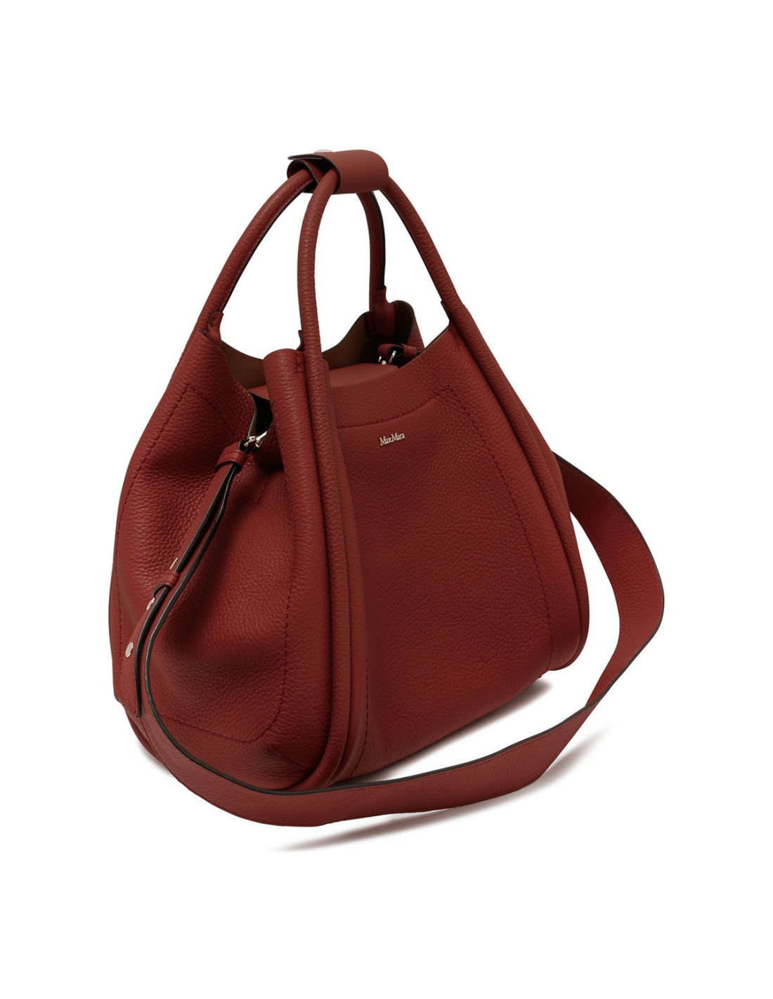 Rust hue tumbled calfskin Marine small bag from Max Mara featuring rounded shape, extendable sides, magnetic snap fastening, tubular handles with snap button bracelet, detachable shoulder strap, logo lettering on front.