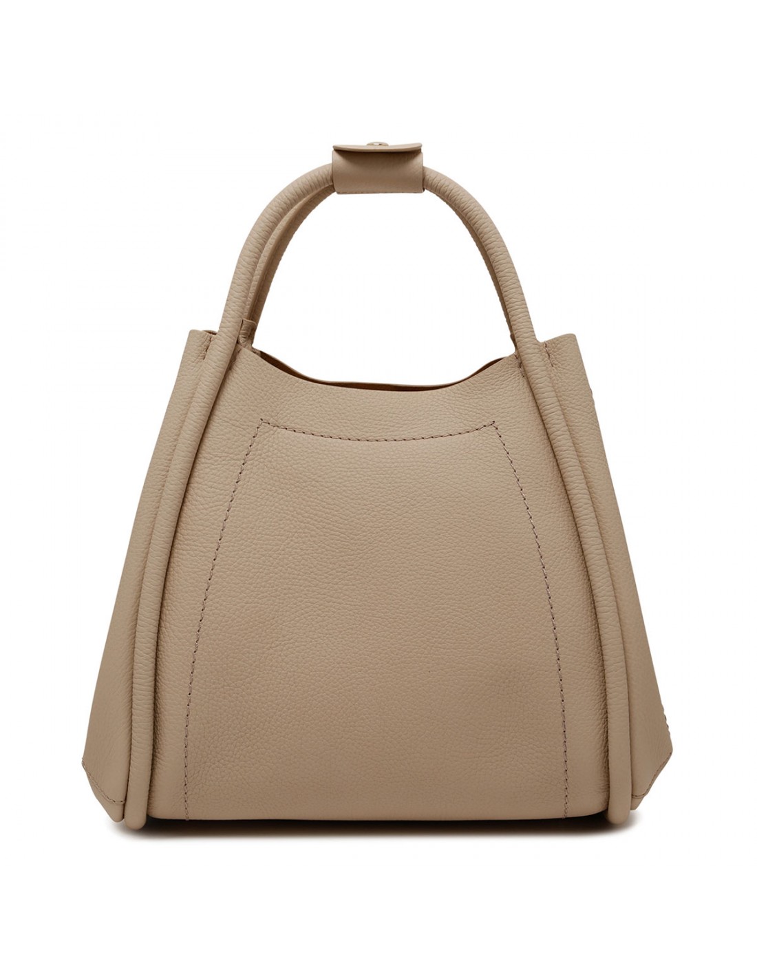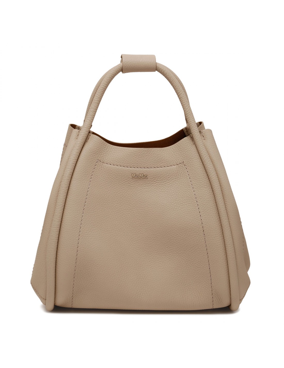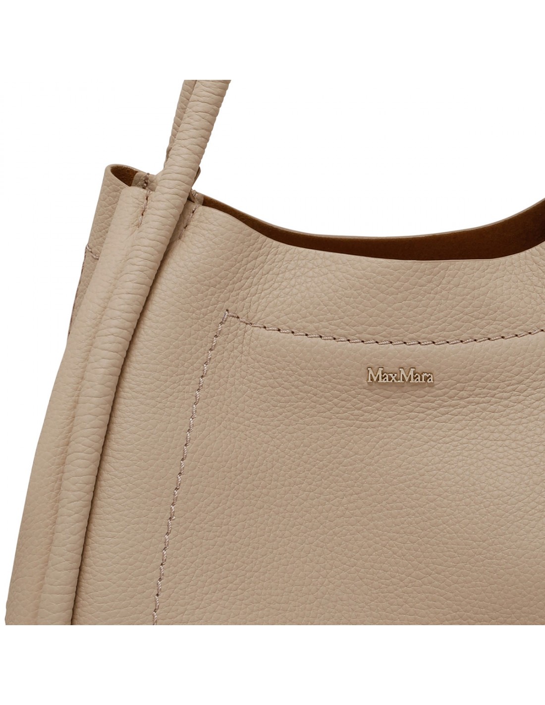 Ice tumbled calfskin Marine small bag from Max Mara featuring rounded shape, extendable sides, magnetic snap fastening, tubular handles with snap button bracelet, detachable shoulder strap, logo lettering on front.