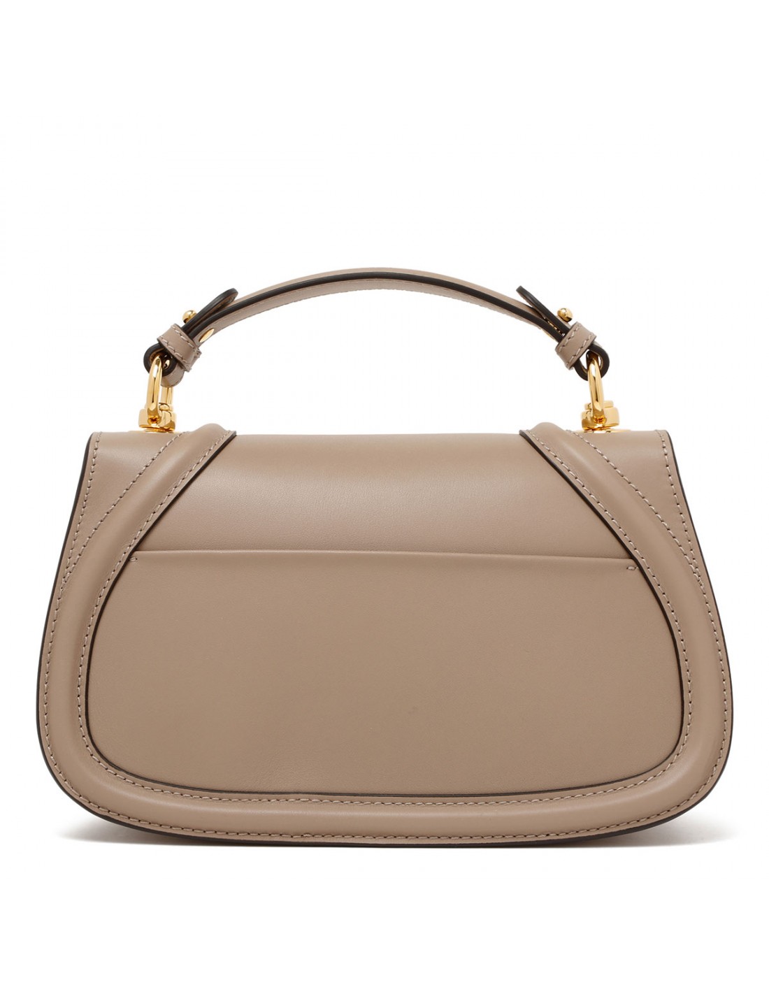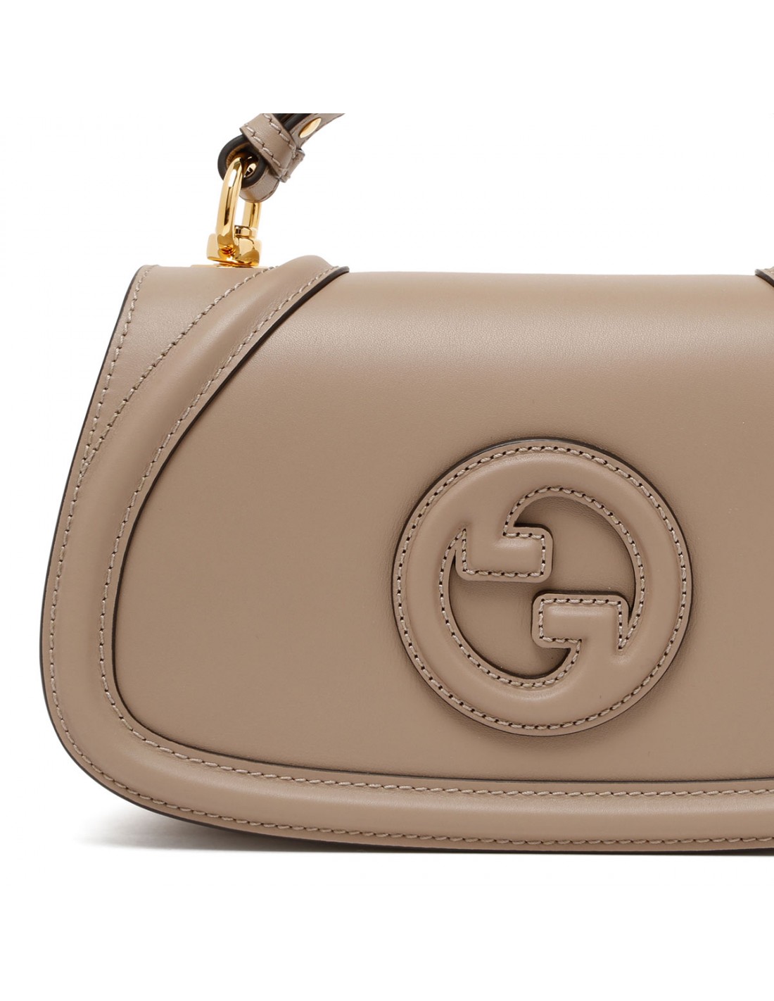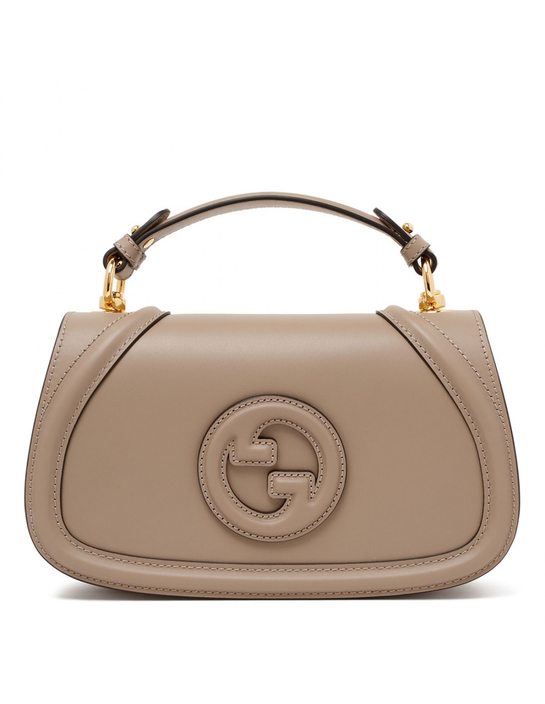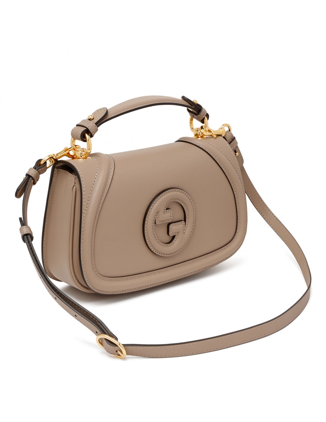 Taupe leather Blondie medium top handle bag from Gucci featuring round interlocking G, brown leather trim, top handle, detachable and adjustable shoulder strap, gold-toned hardware, magnetic closure, back open pocket., brown cotton linen lining, internal zipped pocket.