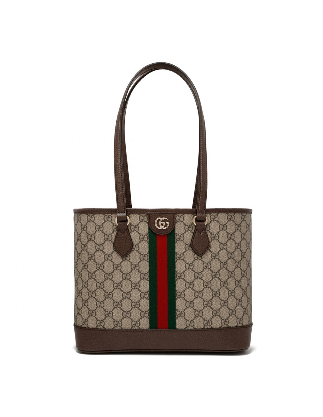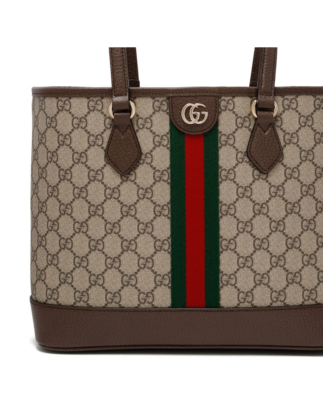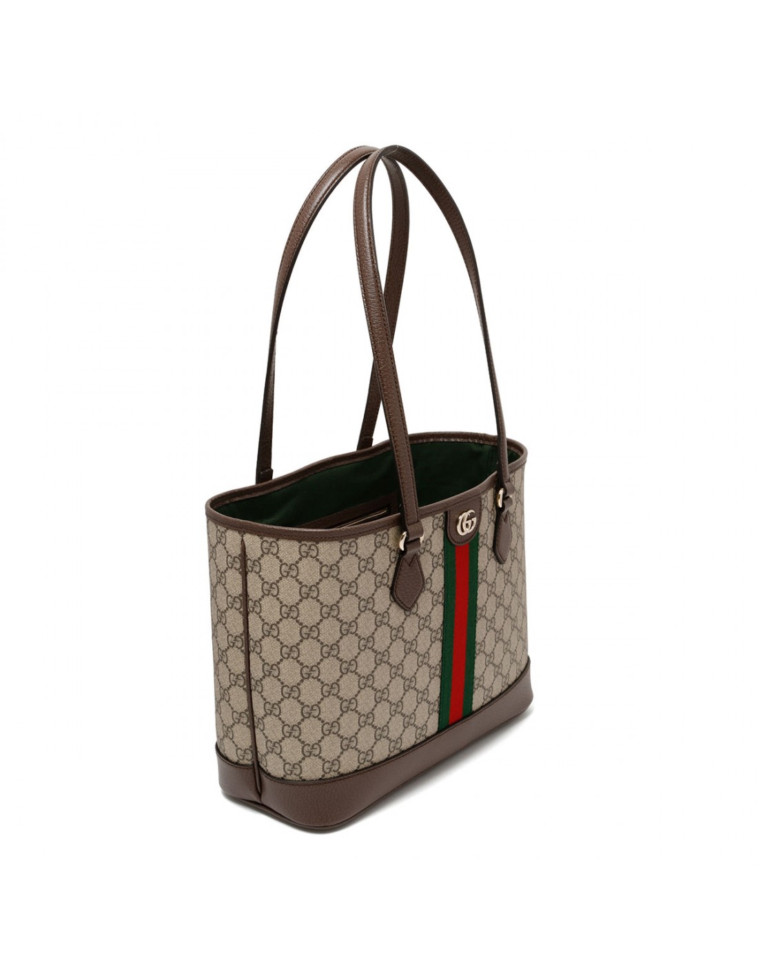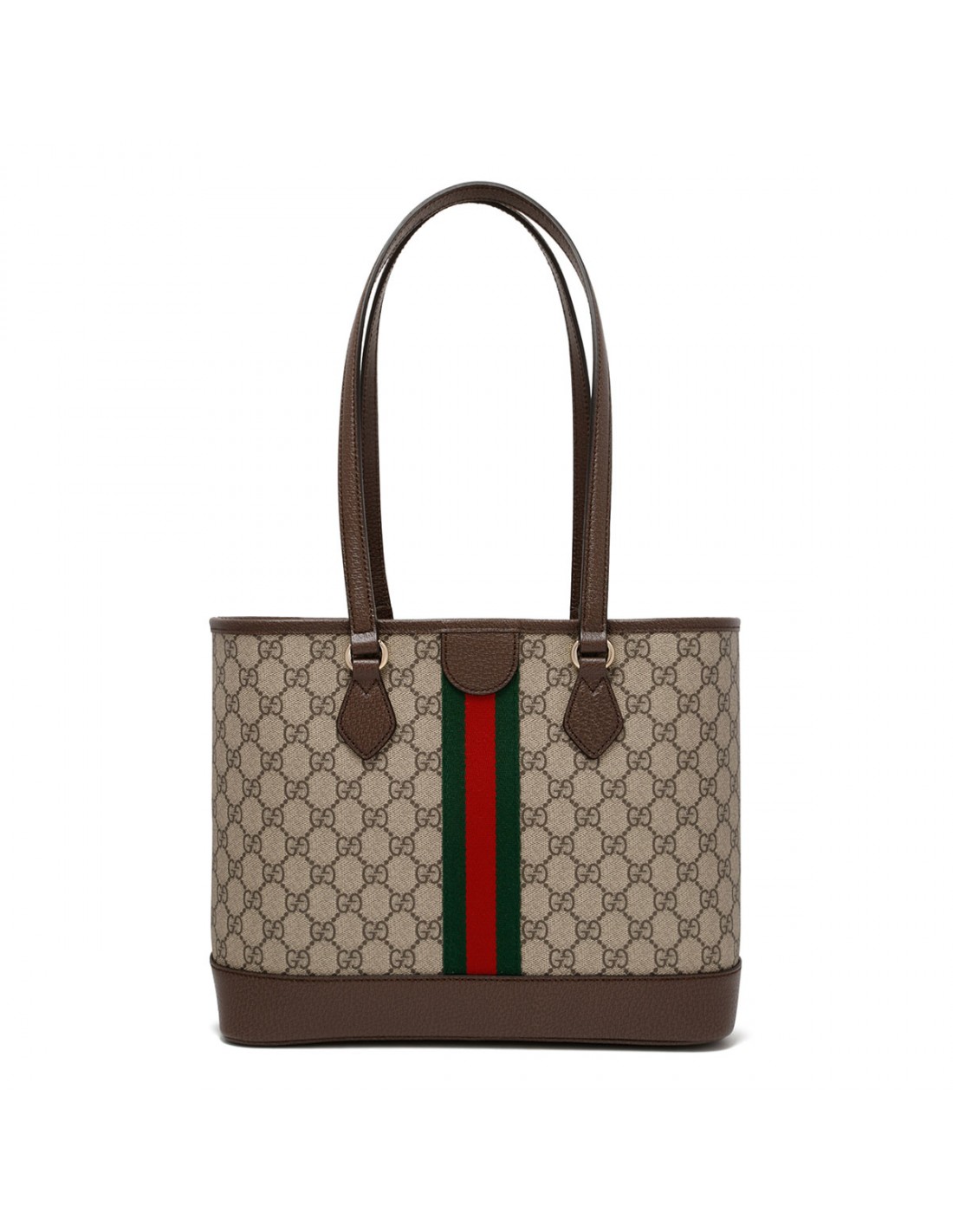 Beige and ebony Supreme canvas Ophidia medium tote bag from Gucci featuring GG motif, brown leather trims, green and red Web, gold-toned double G and hardware, double leather handles, magnetic snap closure, cotton lining, internal zipped pocket.