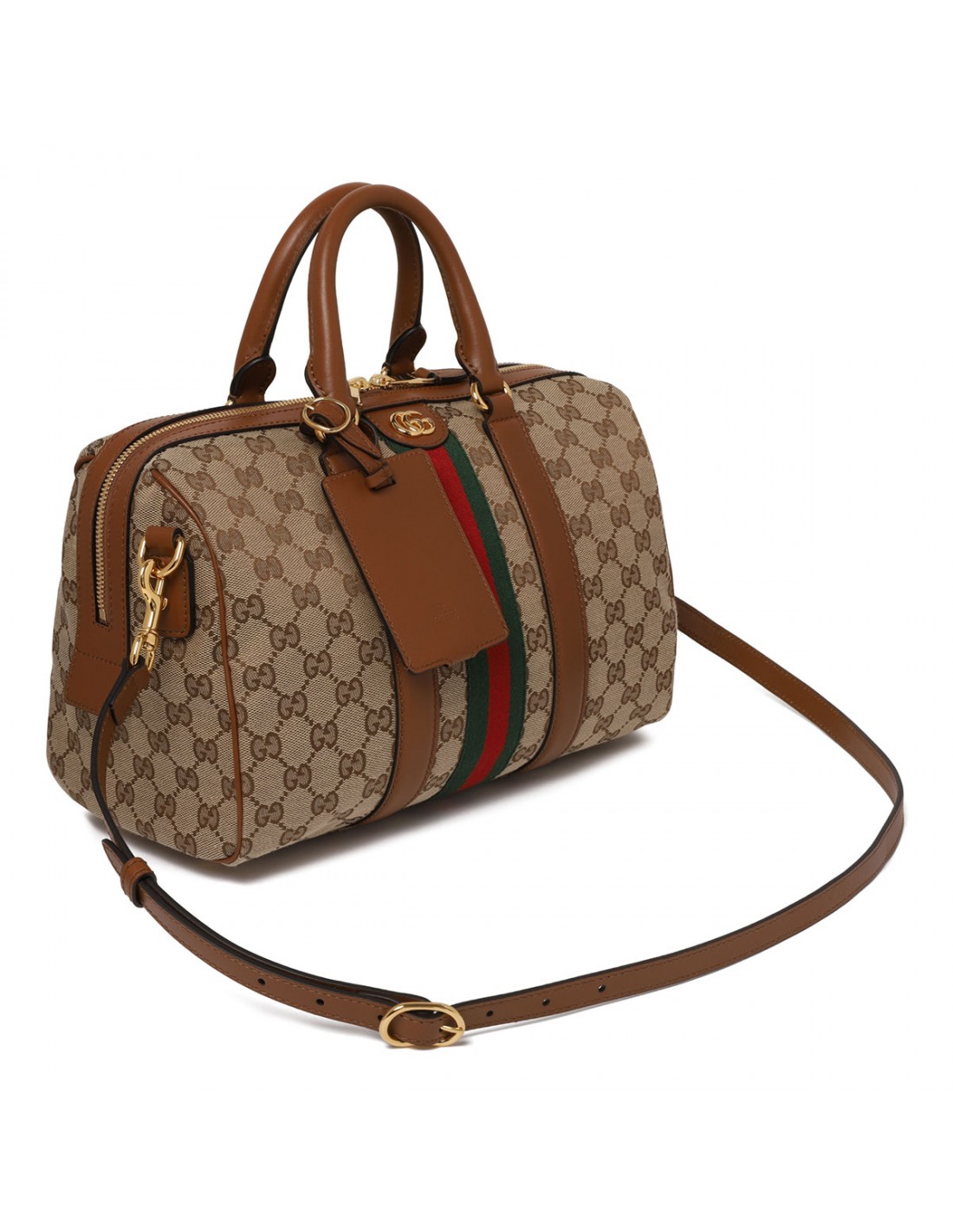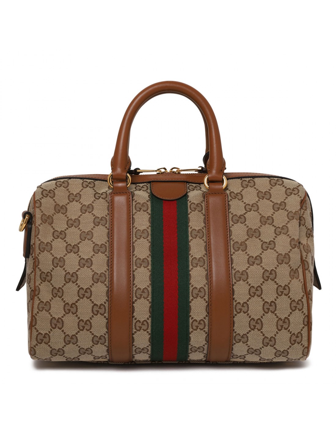 Beige and brown GG canvas Ophidia medium boston bag from Gucci featuring brown leather trims, gold-toned double G and hardware, zip fastening along top, detachable and adjustable leather shoulder strap, double top handle, green cotton linen lining.