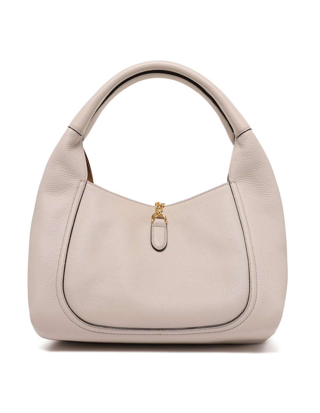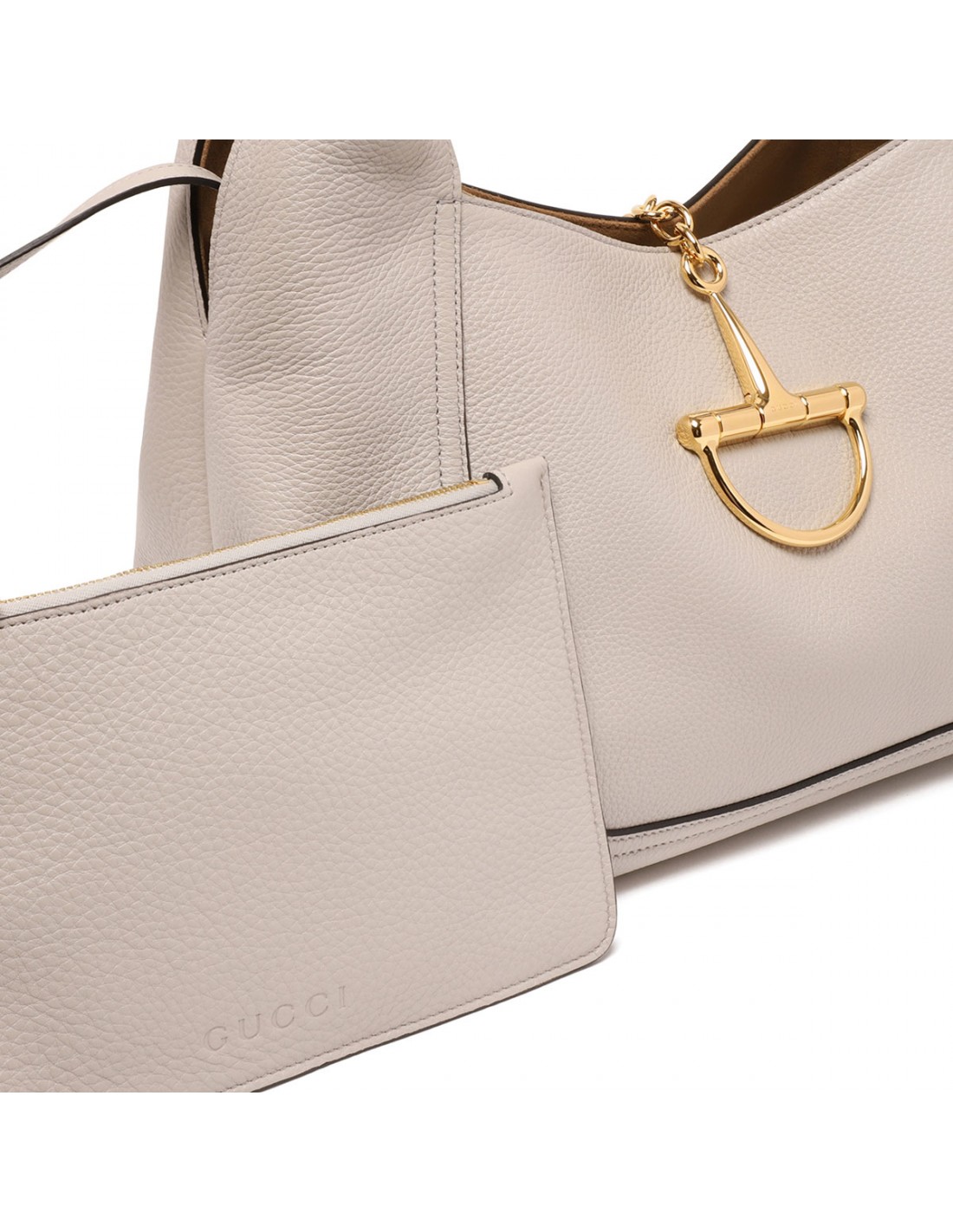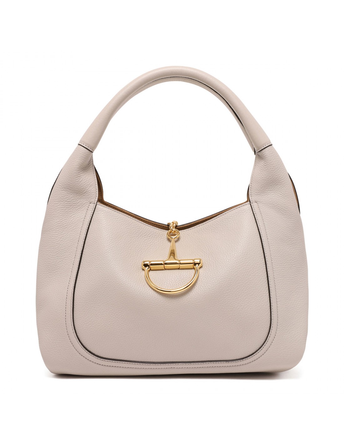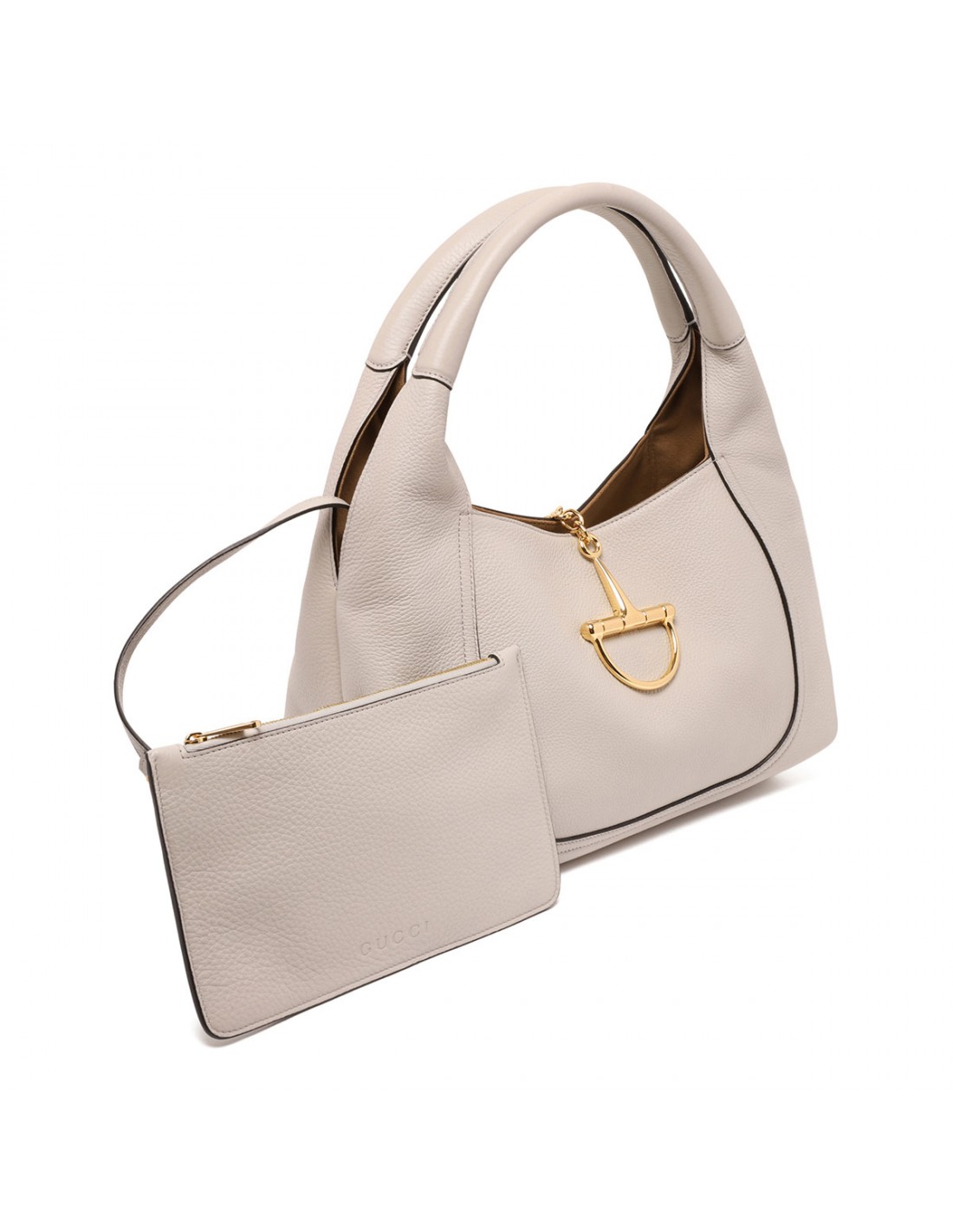 Taupe grained leather Softbit shoulder bag from Gucci featuring gold-toned half Horsebit and hardware, shoulder strap, brown microfiber lining, internal detachable pouch.
