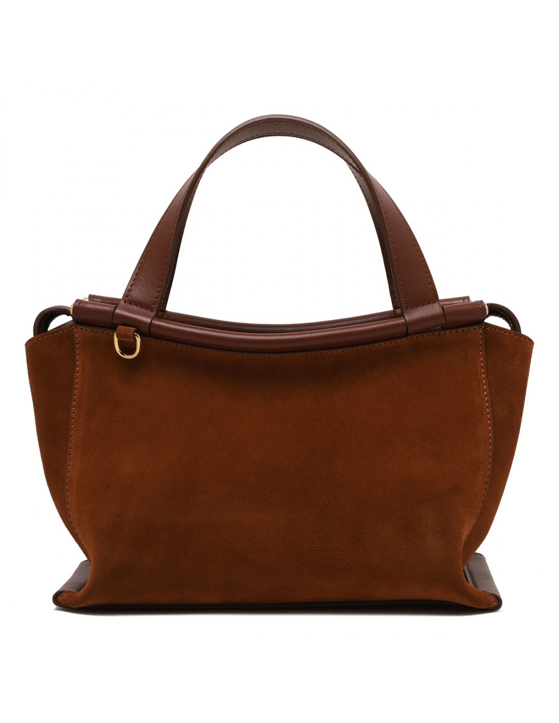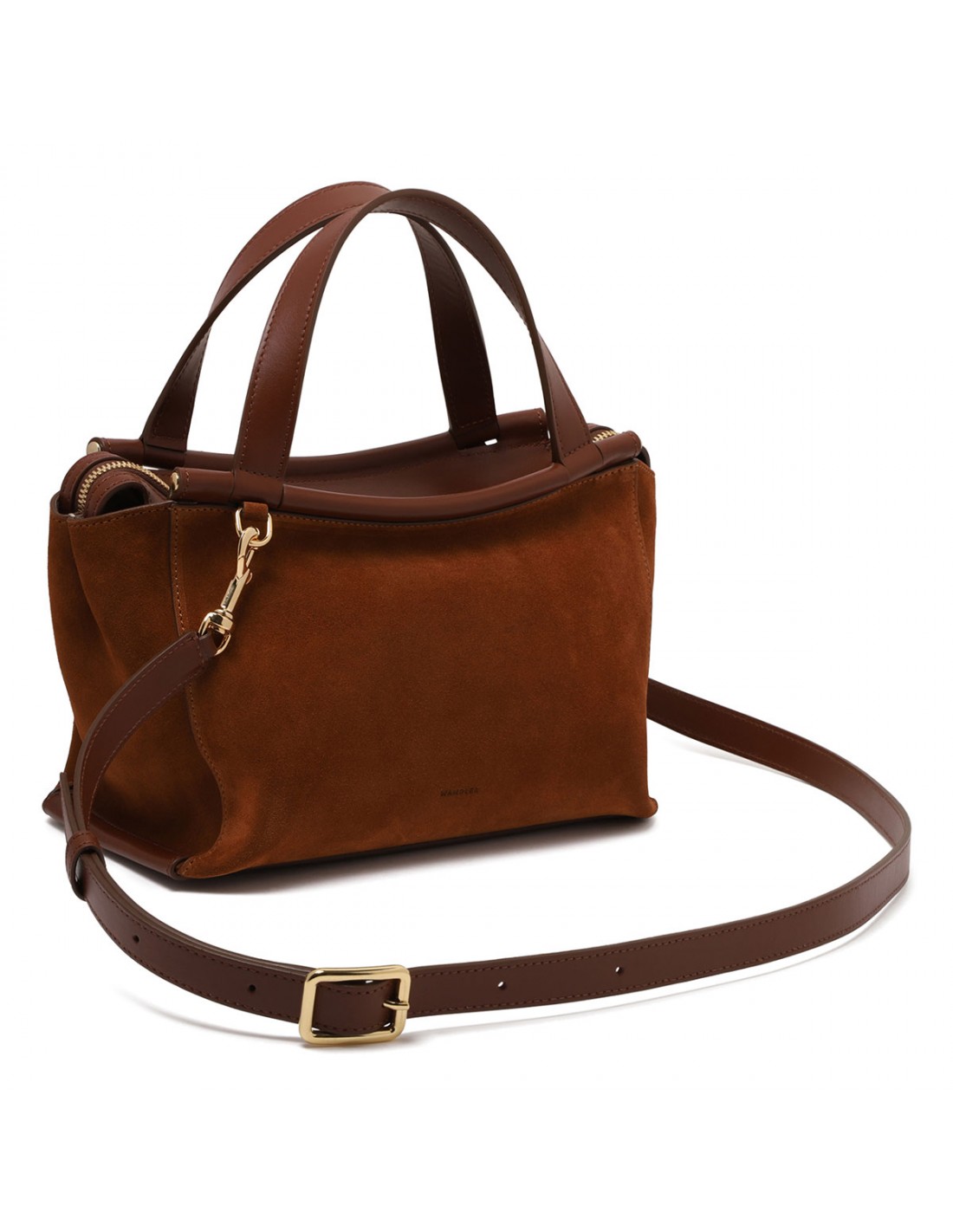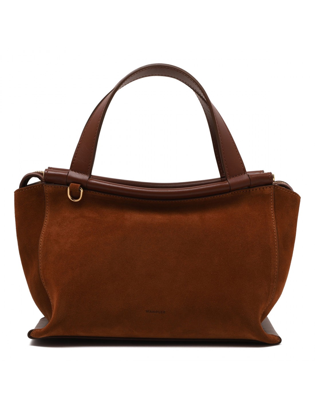 Tan hue suede leather Ida bag from Wandler featuring sculptural silhouette, top handle, elongated zip fastening, detachable and adjustable shoulder strap, internal slip pocket.