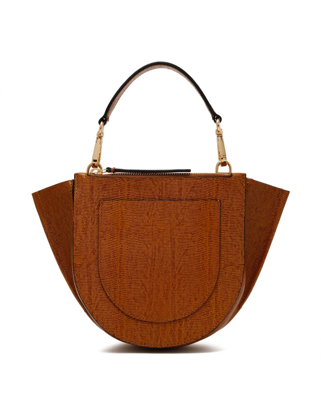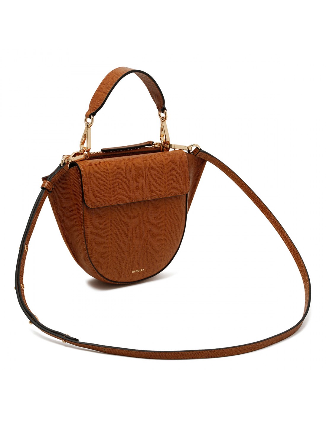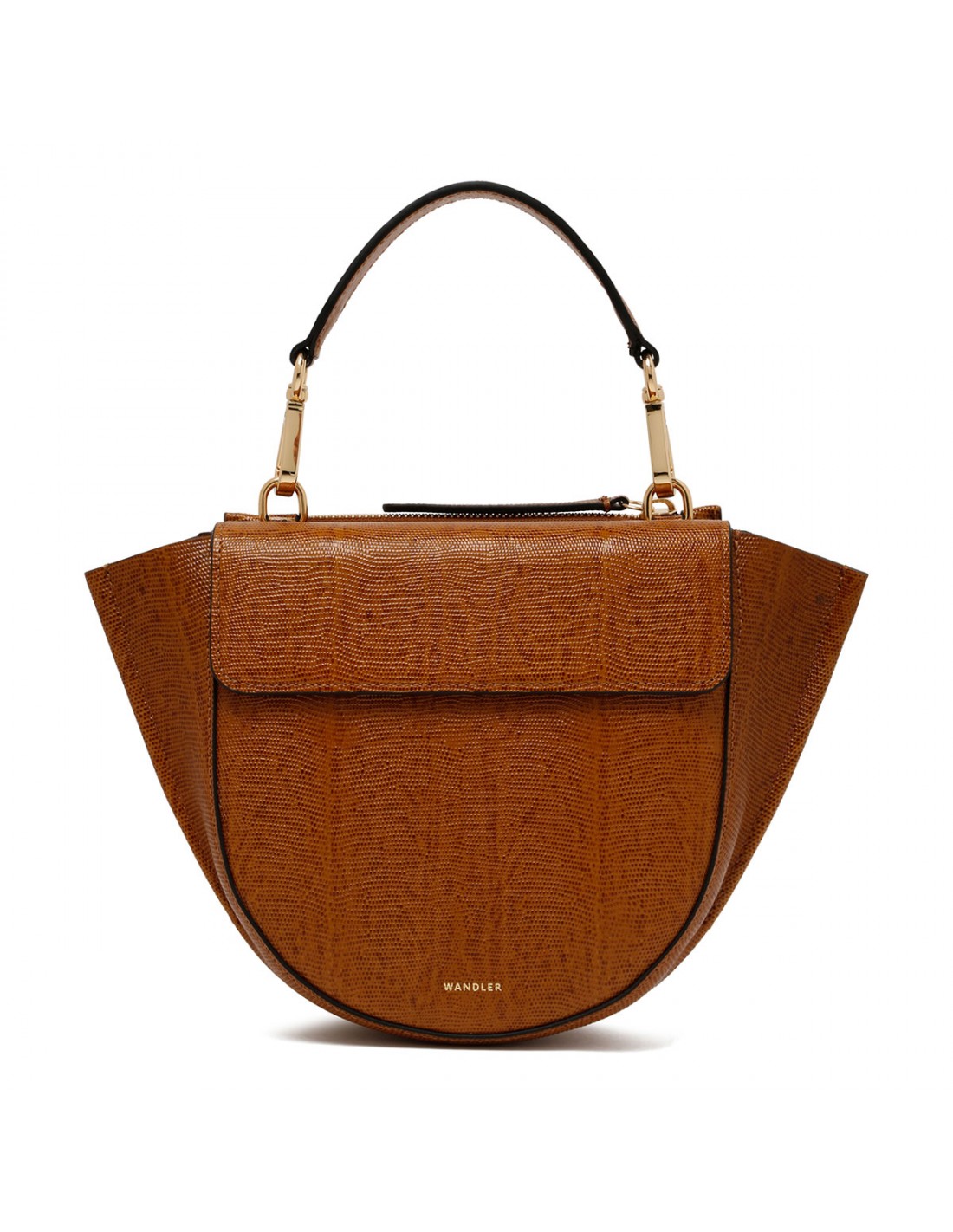Tobacco lizard embossed leather Hortensia mini bag from Wandler featuring magnetic closure, one main compartment, back external pocket with zip fastening, single top handle, black hand-painted edges, detachable shoulder strap, internal slip pocket.