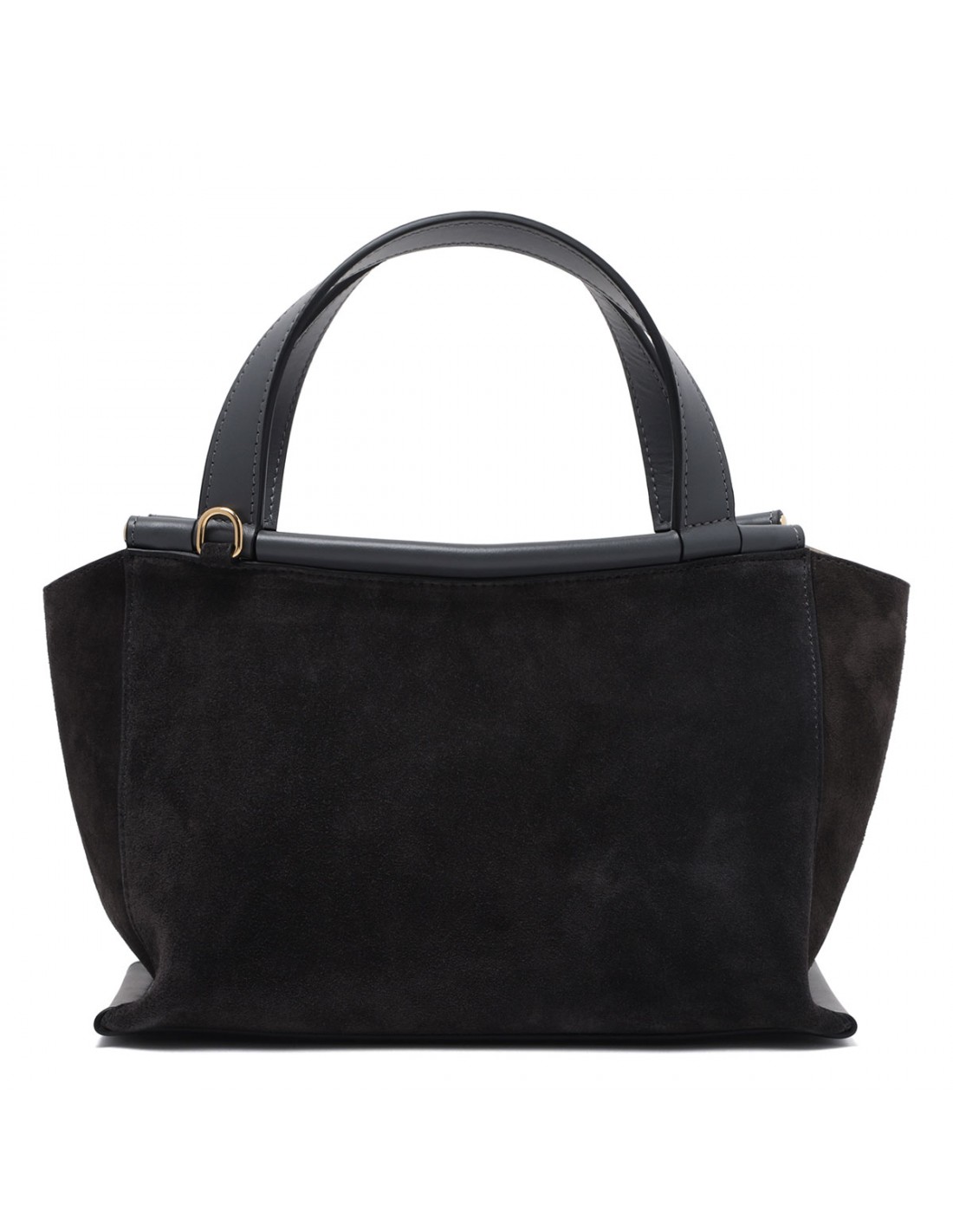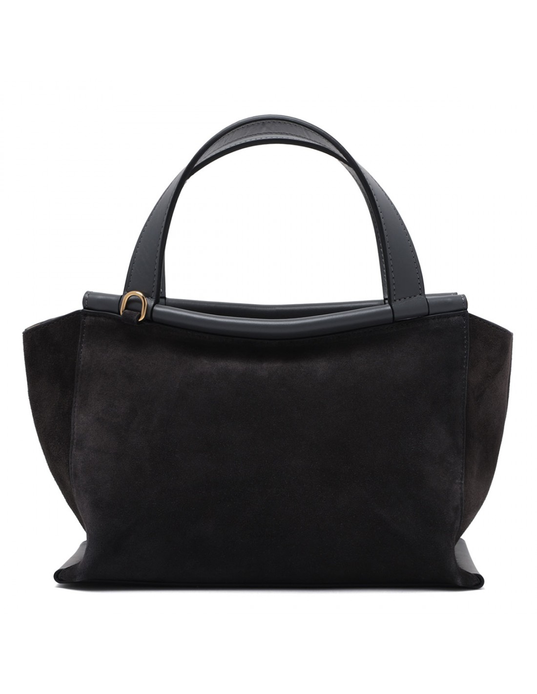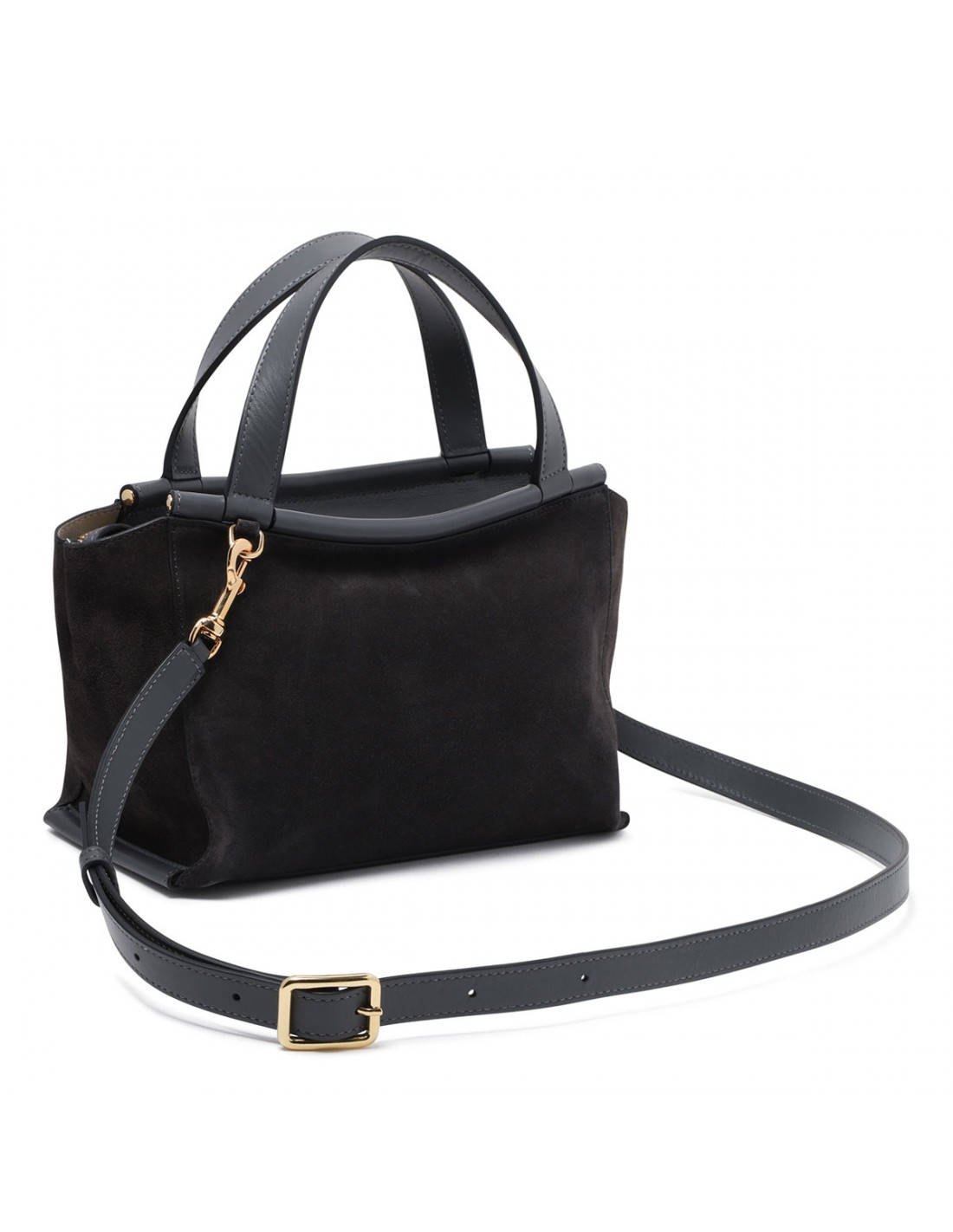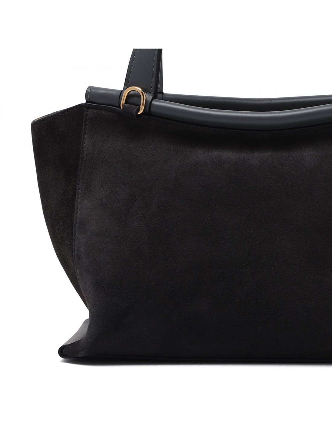 Charcoal gray suede leather Ida bag from Wandler featuring sculptural silhouette, top handle, elongated zip fastening, detachable and adjustable shoulder strap, internal slip pocket.