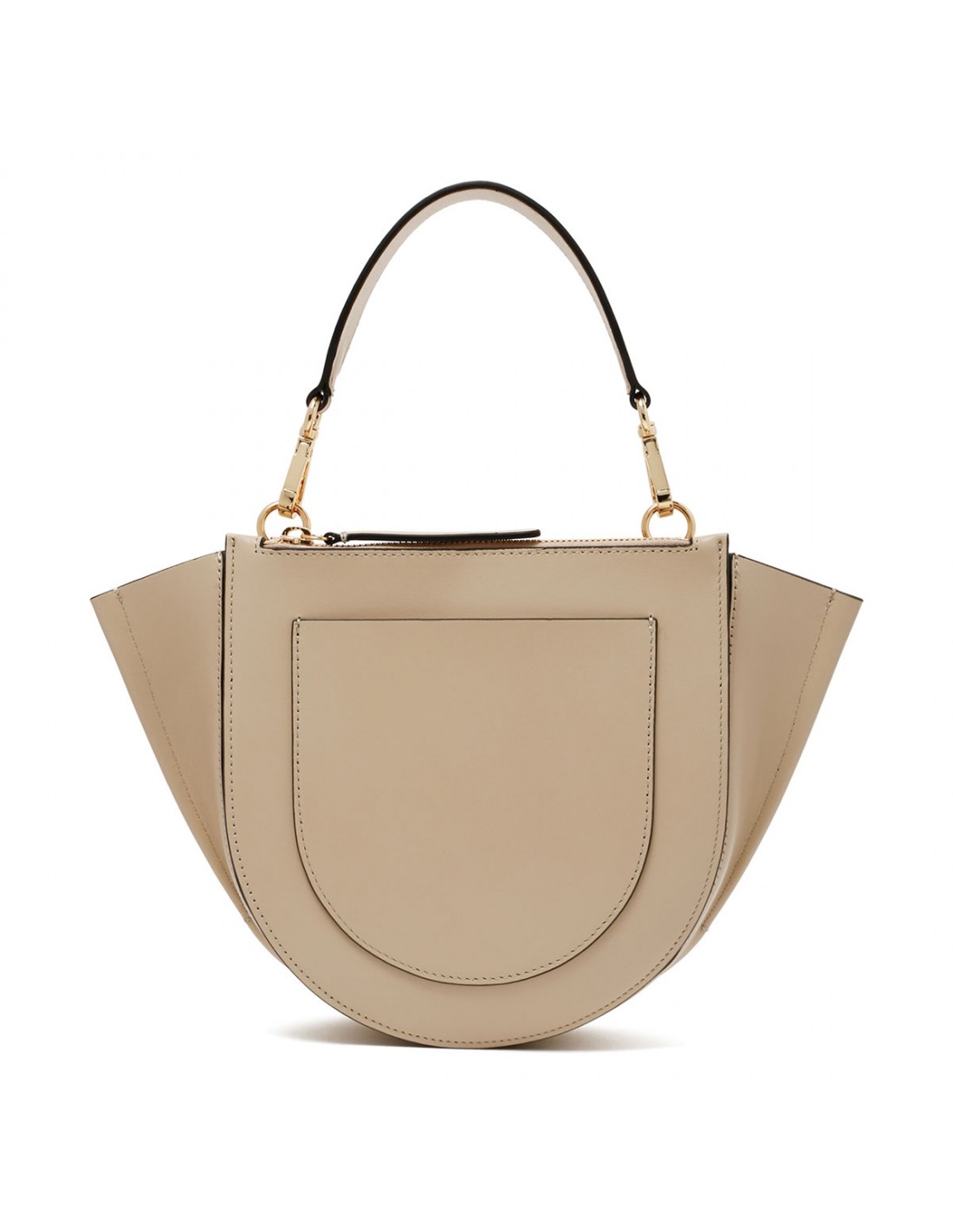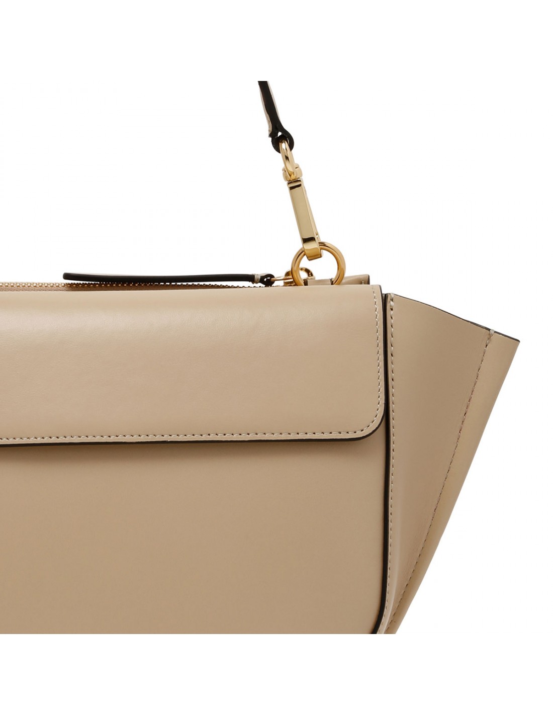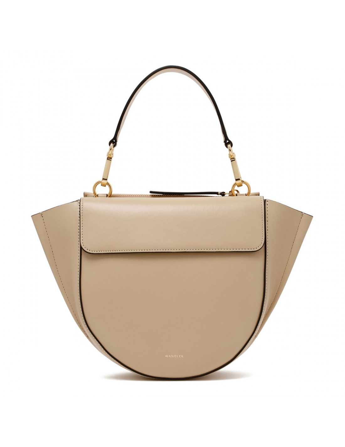 Linen hue leather Hortensia small bag from Wandler featuring magnetic closure, one main compartment, back external pocket with zip fastening, single top handle, black hand-painted edges, detachable shoulder strap, internal slip pocket.