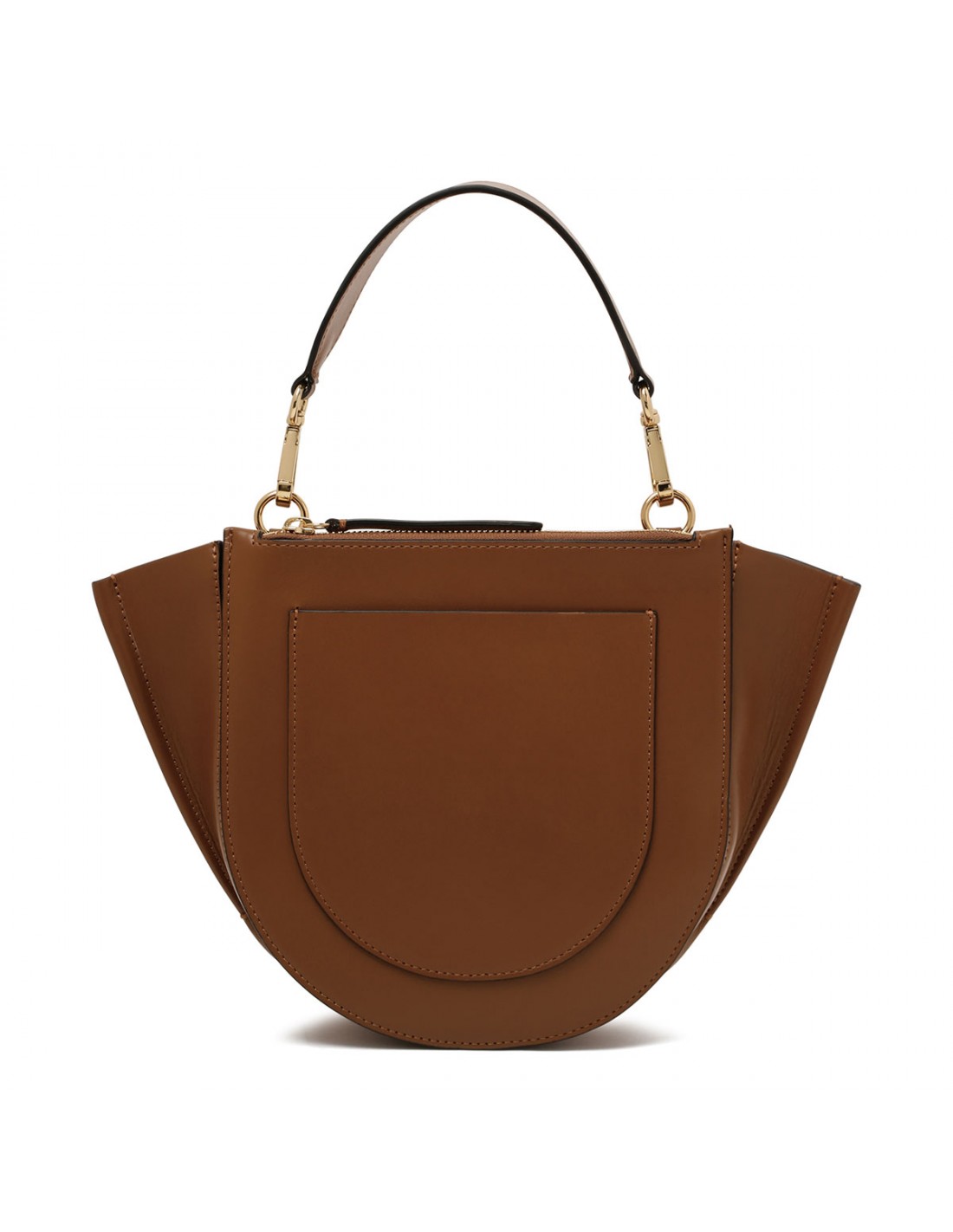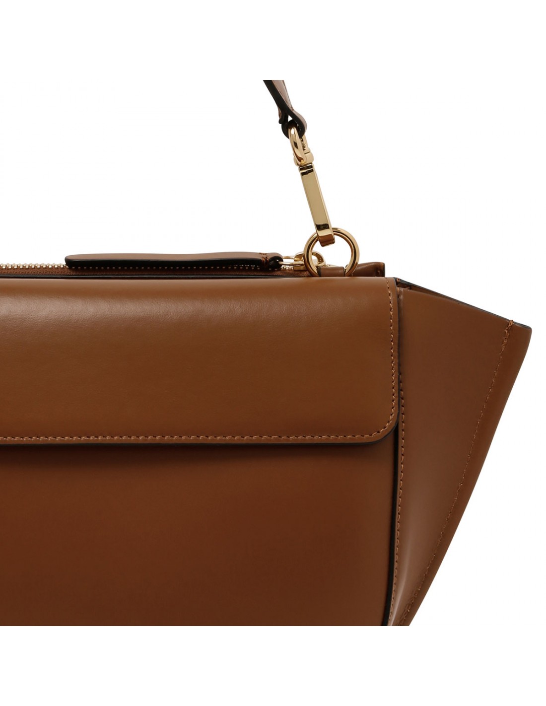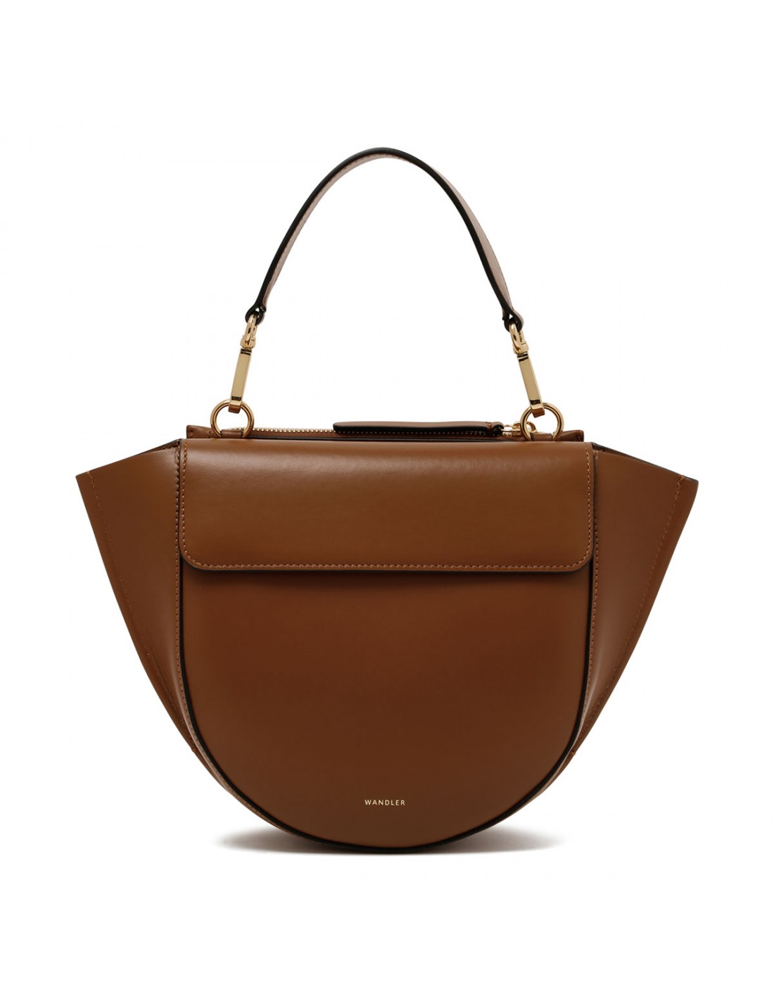 Saddle hue leather Hortensia small bag from Wandler featuring magnetic closure, one main compartment, back external pocket with zip fastening, single top handle, black hand-painted edges, detachable shoulder strap, internal slip pocket.