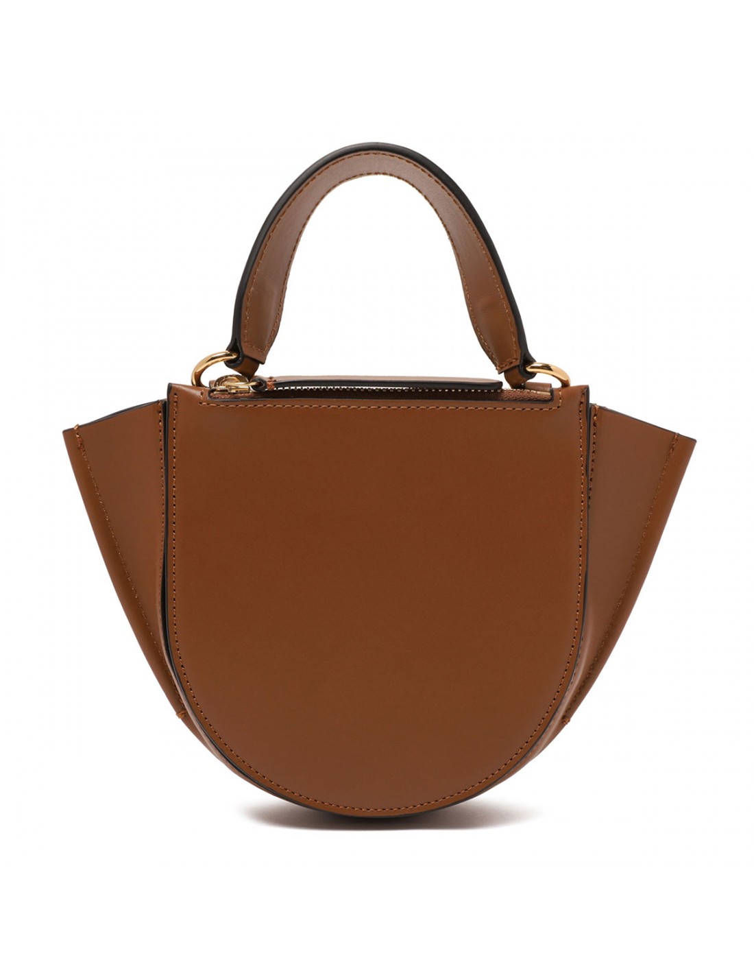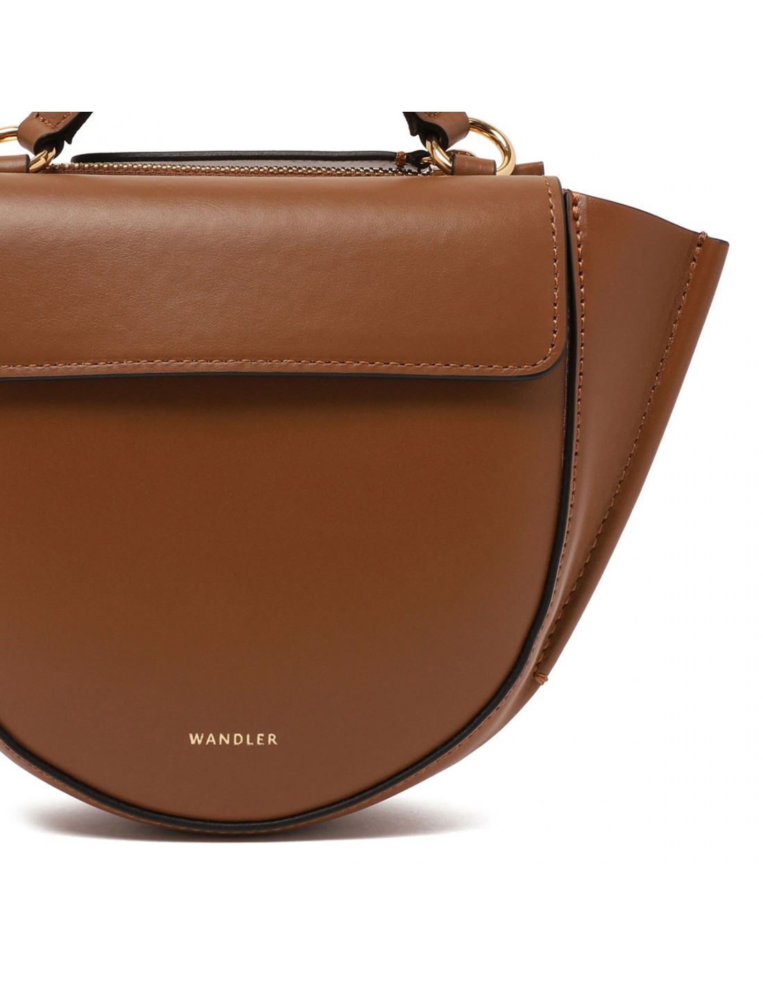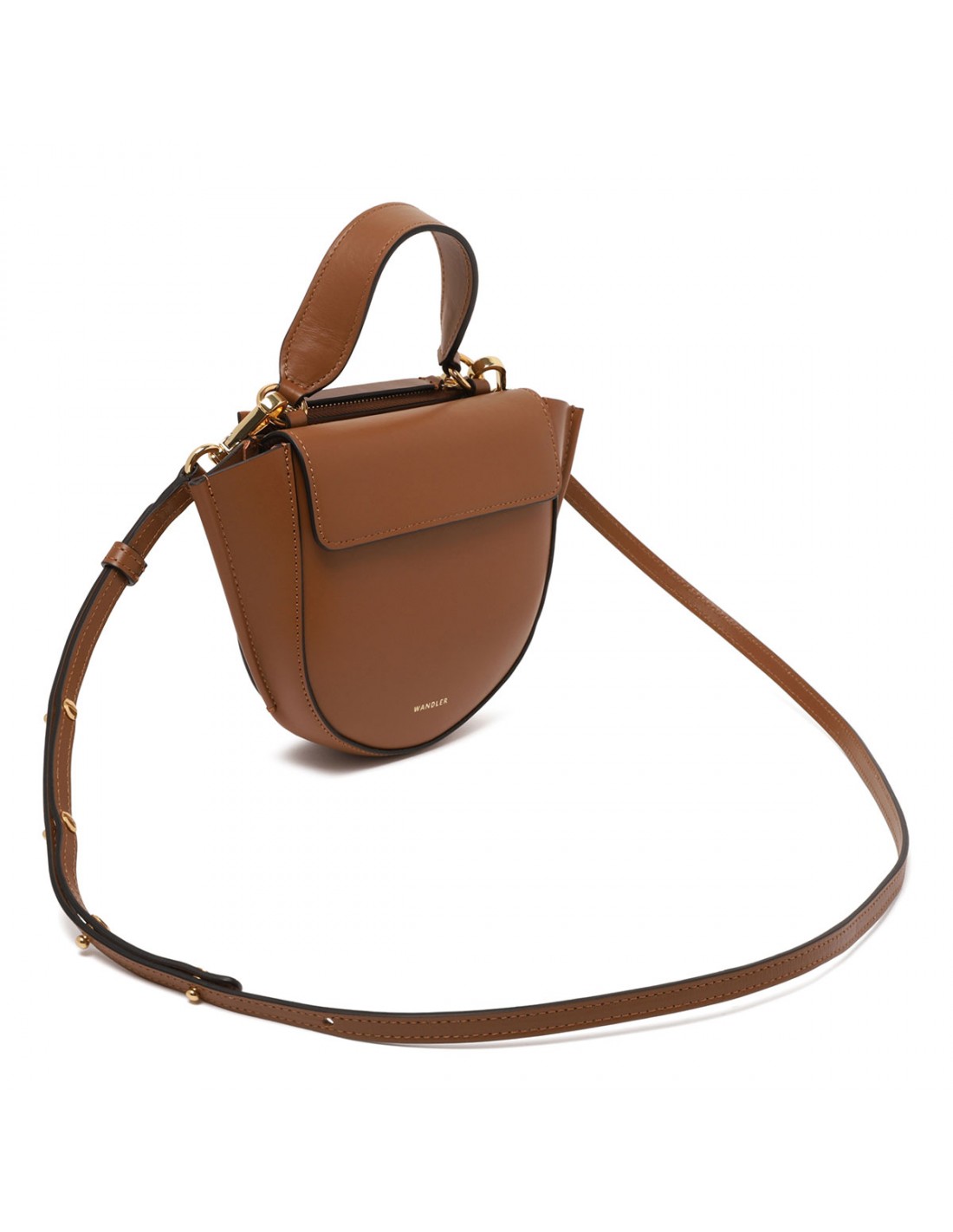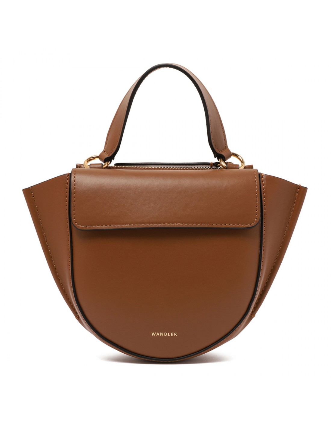 Saddle hue leather Hortensia "piccola" bag from Wandler featuring magnetic closure, one main compartment, back external pocket with zip fastening, single top handle, black hand-painted edges, detachable shoulder strap, internal slip pocket.