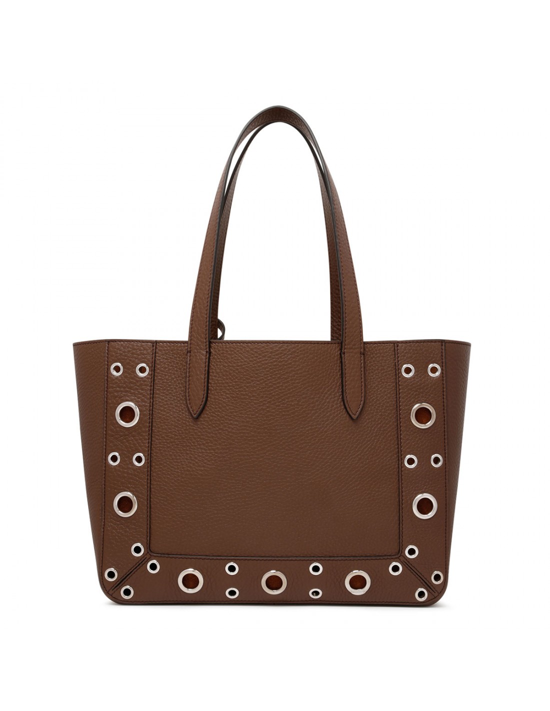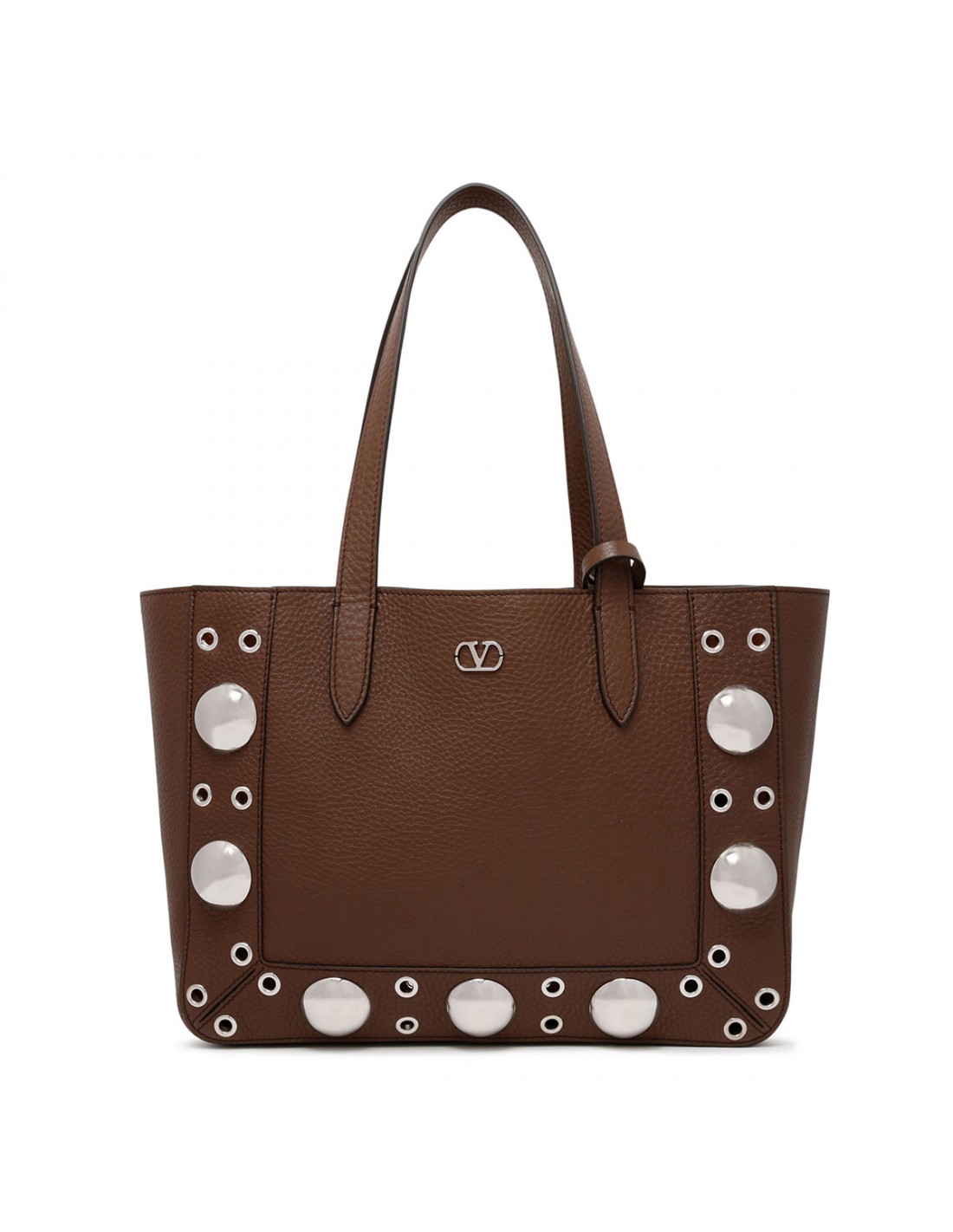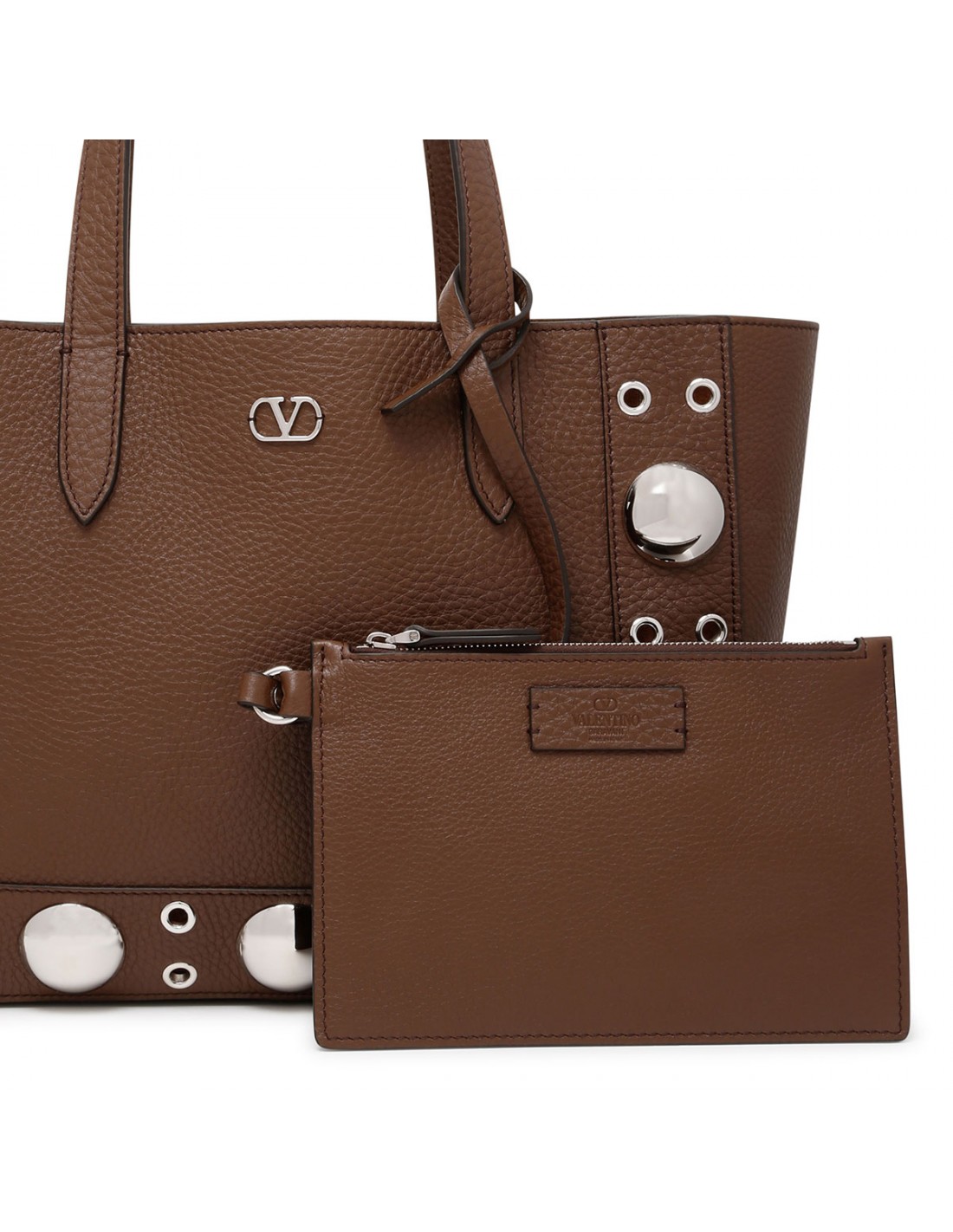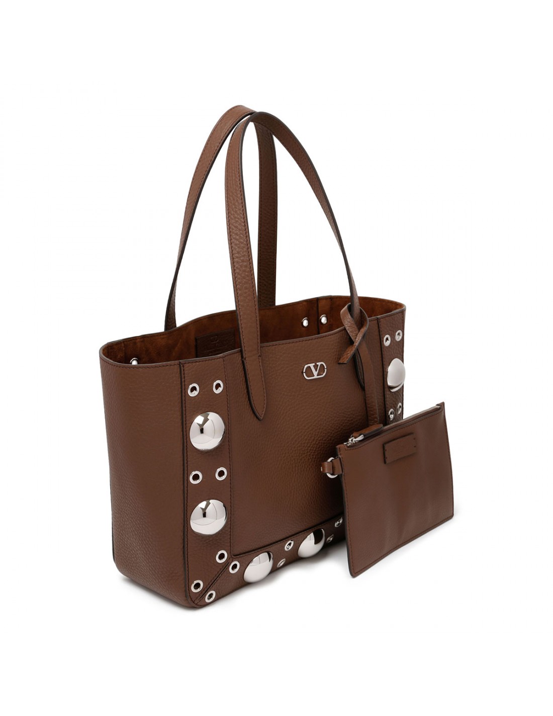 Dark brown suede leather Nellcôte medium tote bag from Valentino Garavani featuring trims decorated with ball studs and rivets, small metallic detail with VLogo Signature, palladium-finish hardware, double long top handle, attached pouch with zip closure.