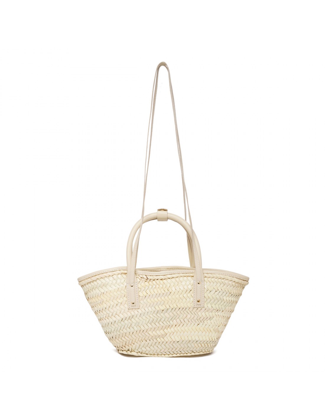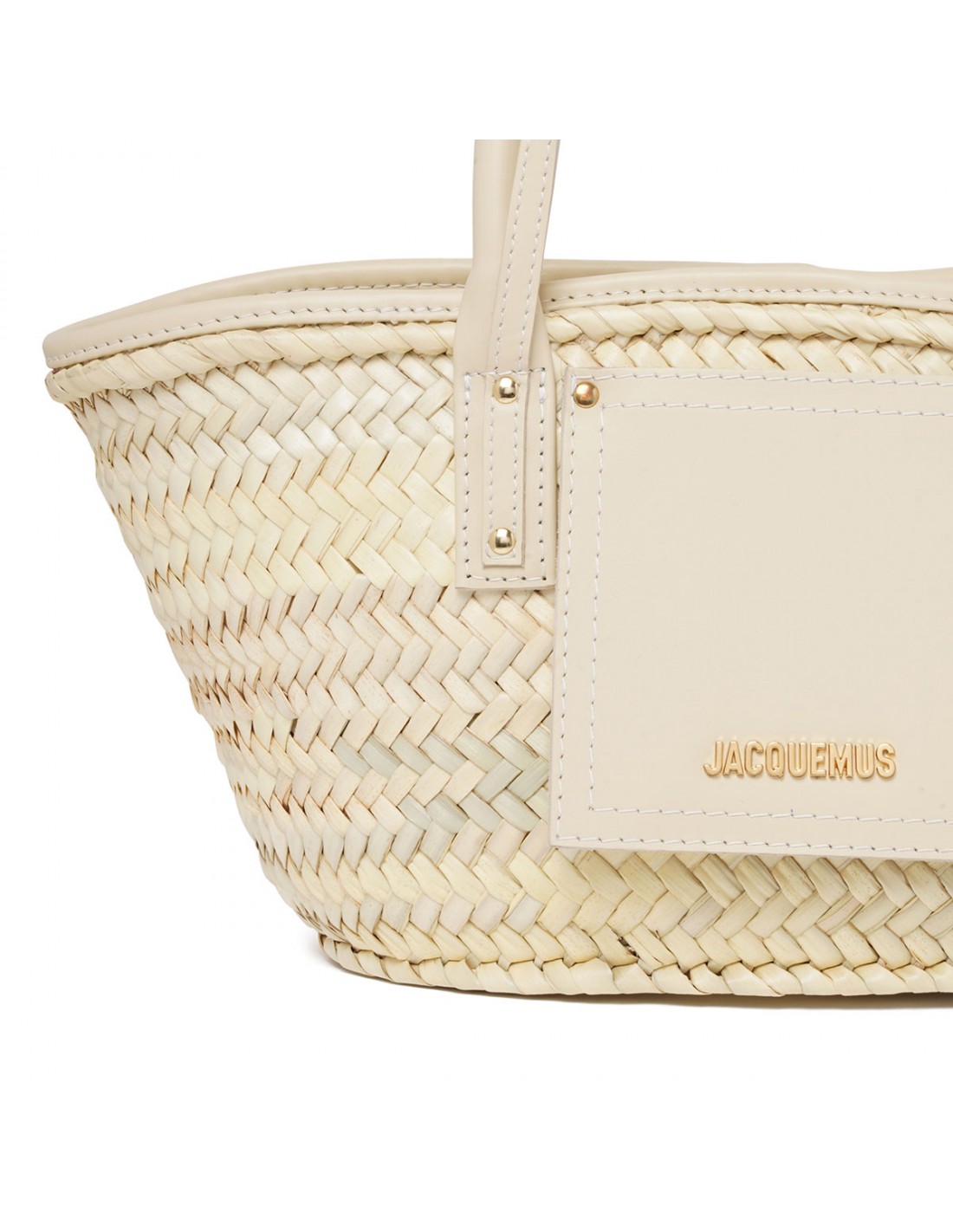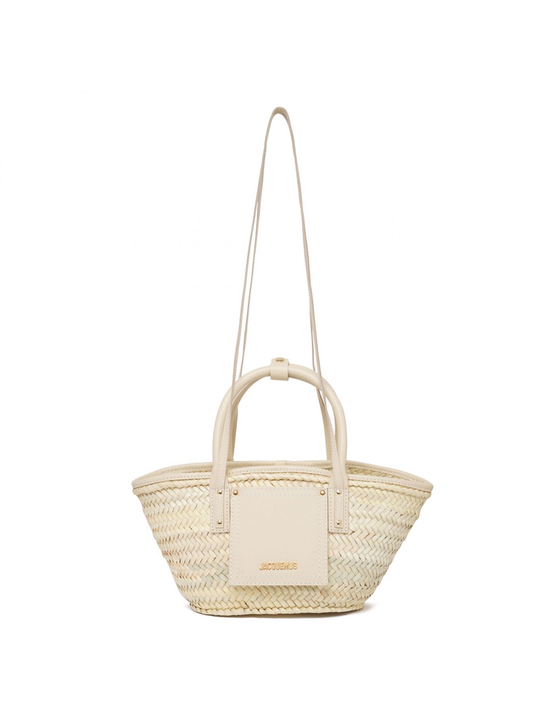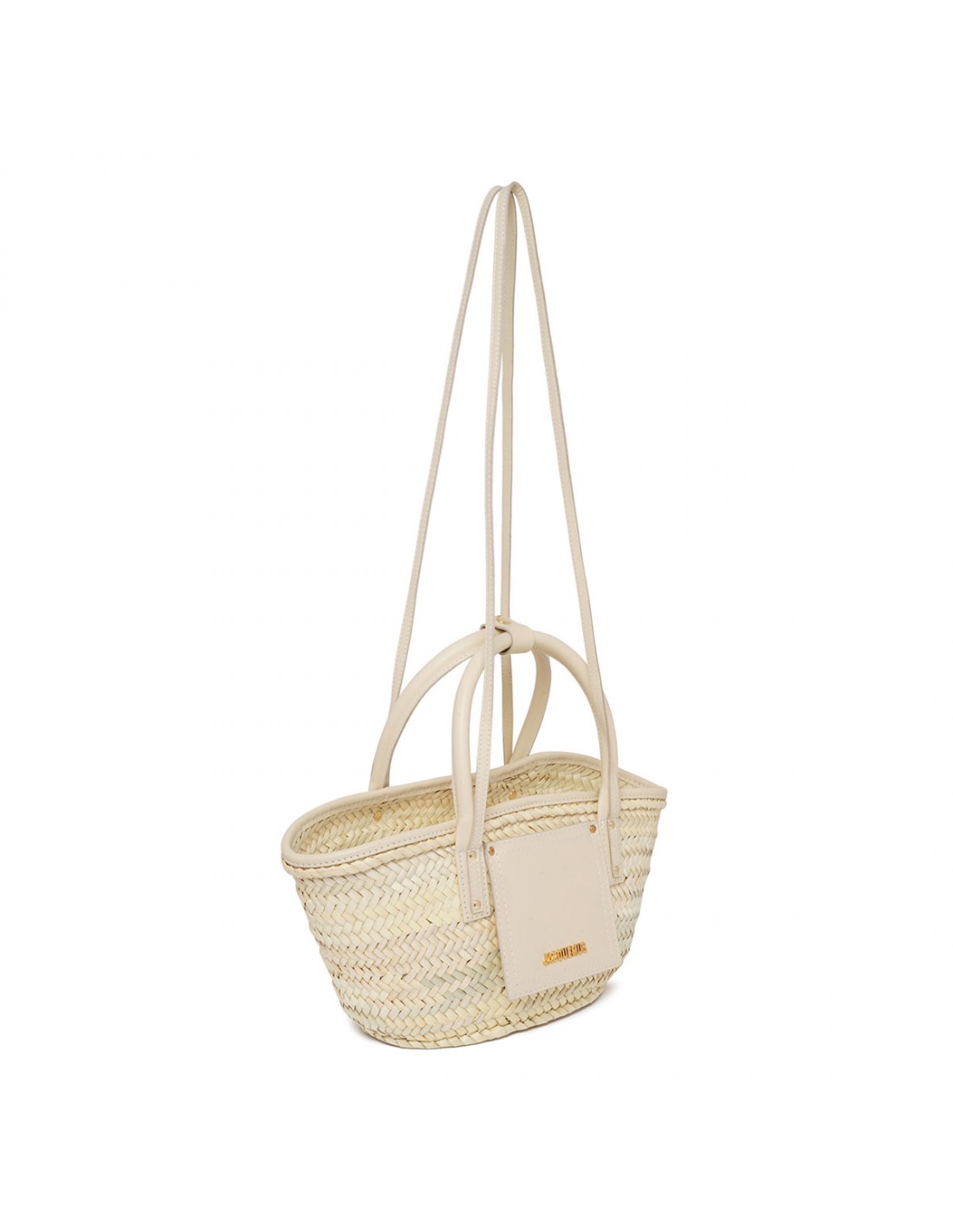 Handwoven The Soli small basket bag from Jacquemus featuring ivory smooth leather details, leather top handles, long detachable cross-body strap, front flap pocket, gold metal logo and hardware.