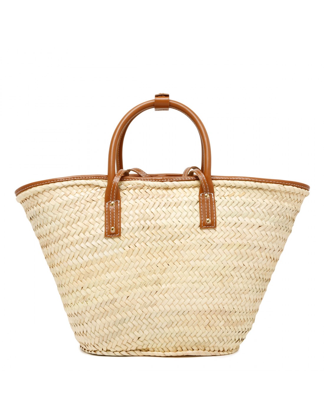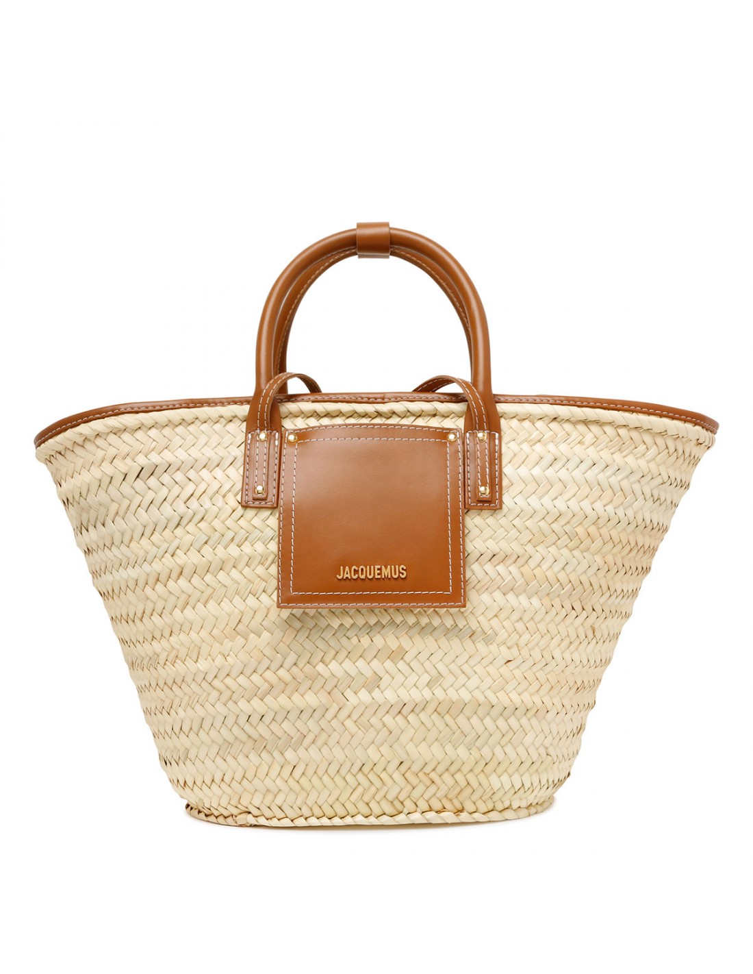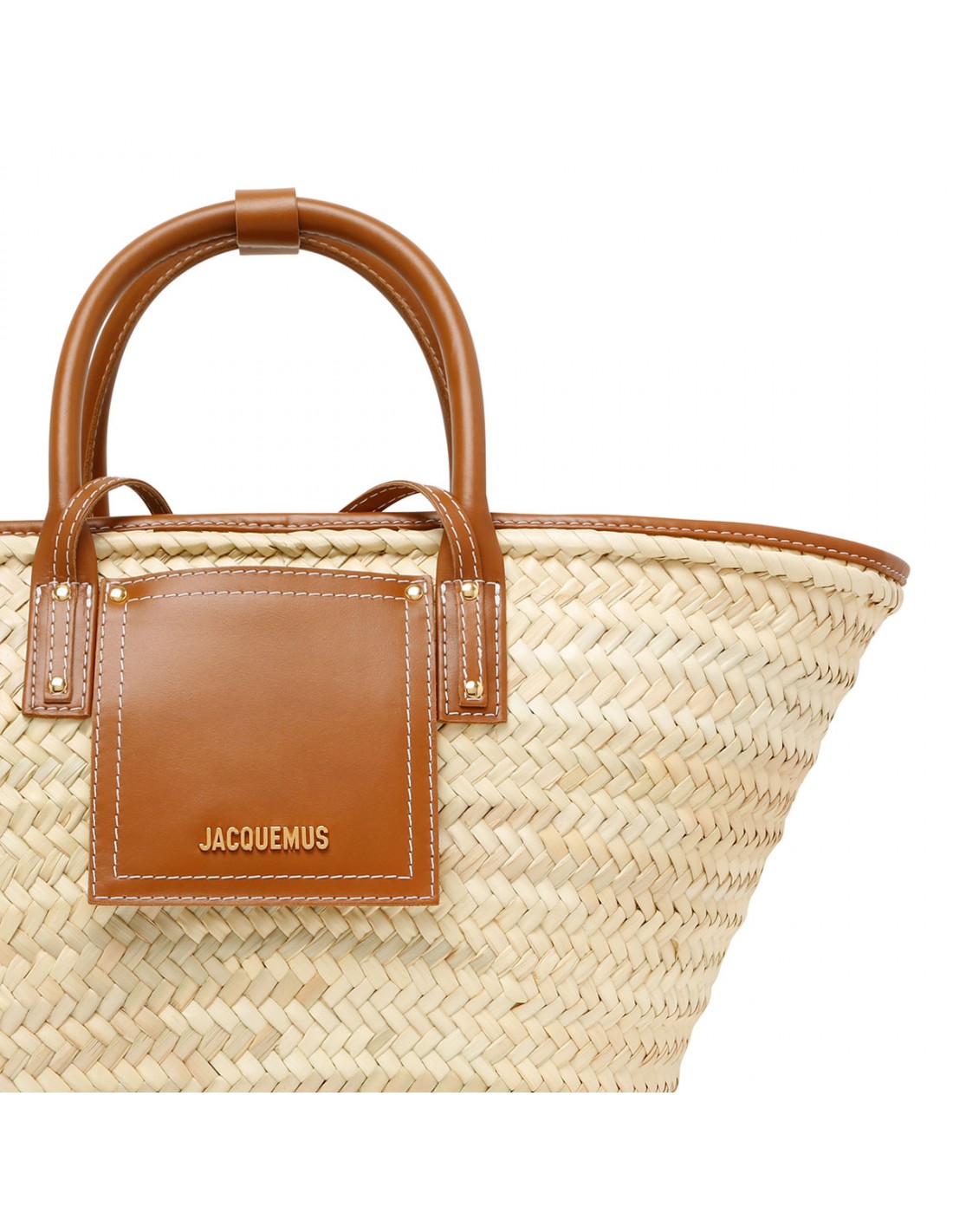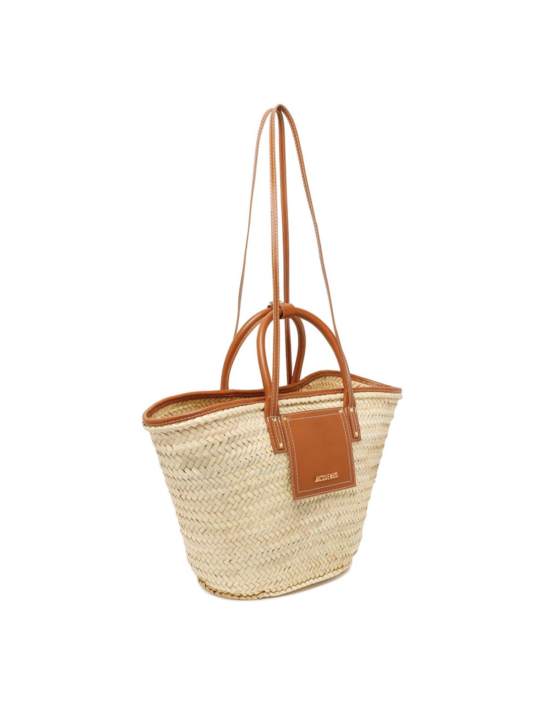 Natural handwoven The Soli beach basket bag from Jacquemus featuring light brown smooth leather detail, long cross-body straps, double top handle with snap button tab, front flap pocket, gold metal logo and studs.