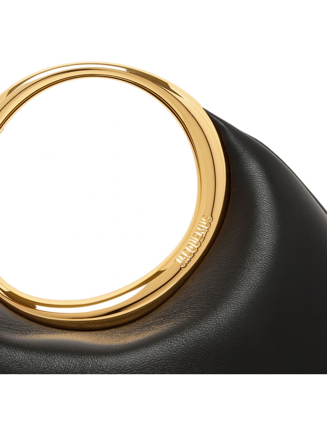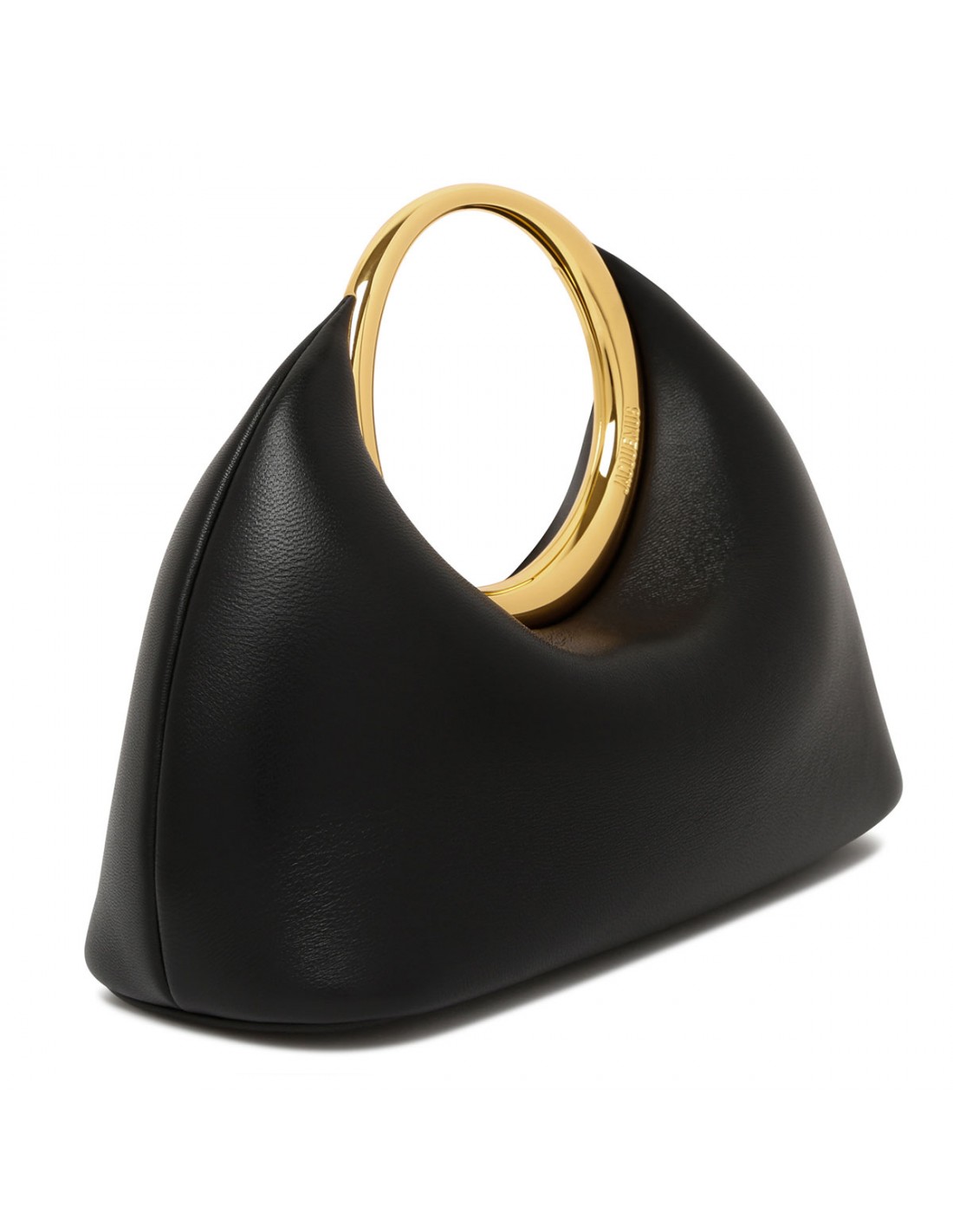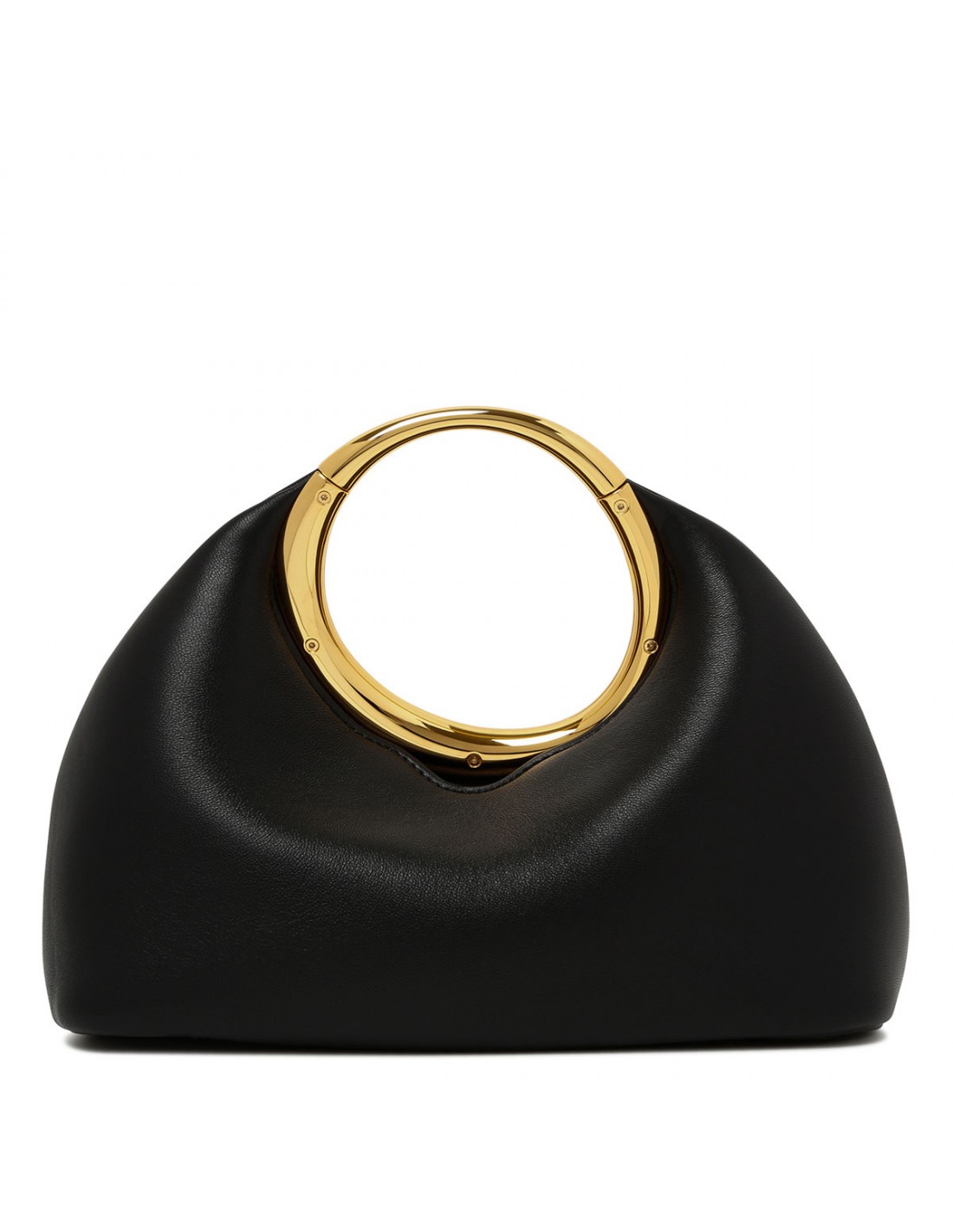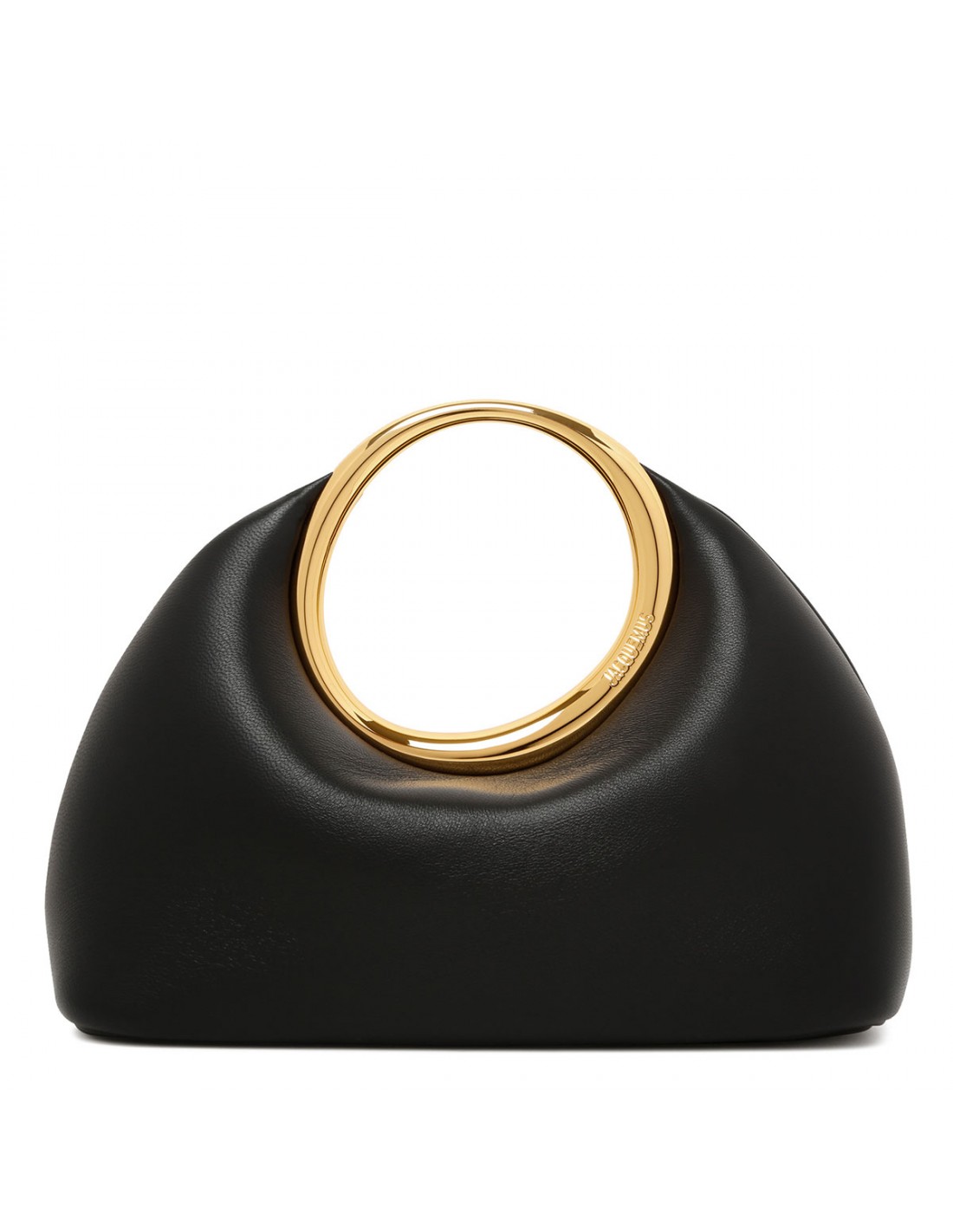 Black nappa leather The Calino small handbag from Jacquemus featuring integrated engraved ring handle, magnetic closure, flat bottom, cotton lining.