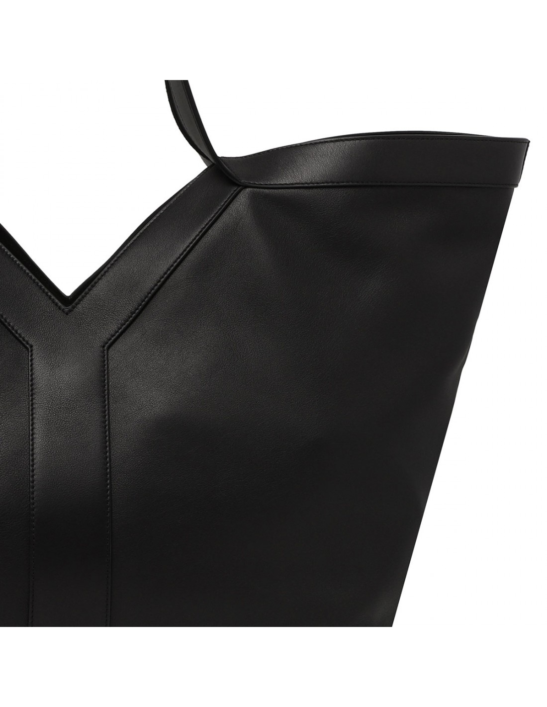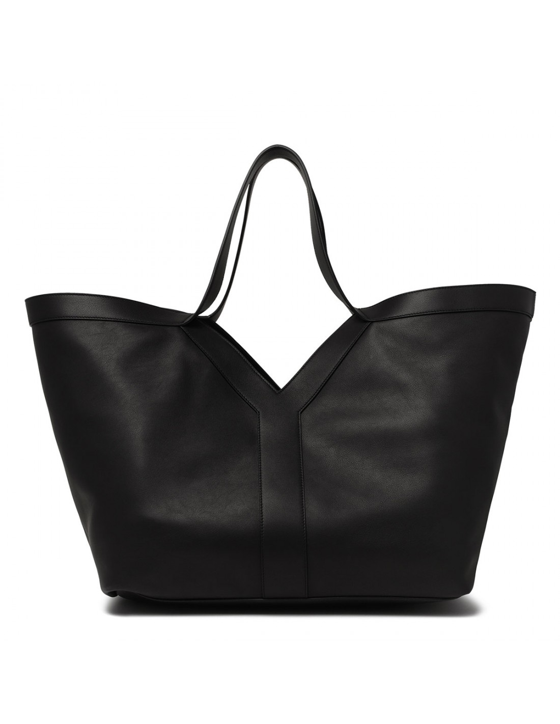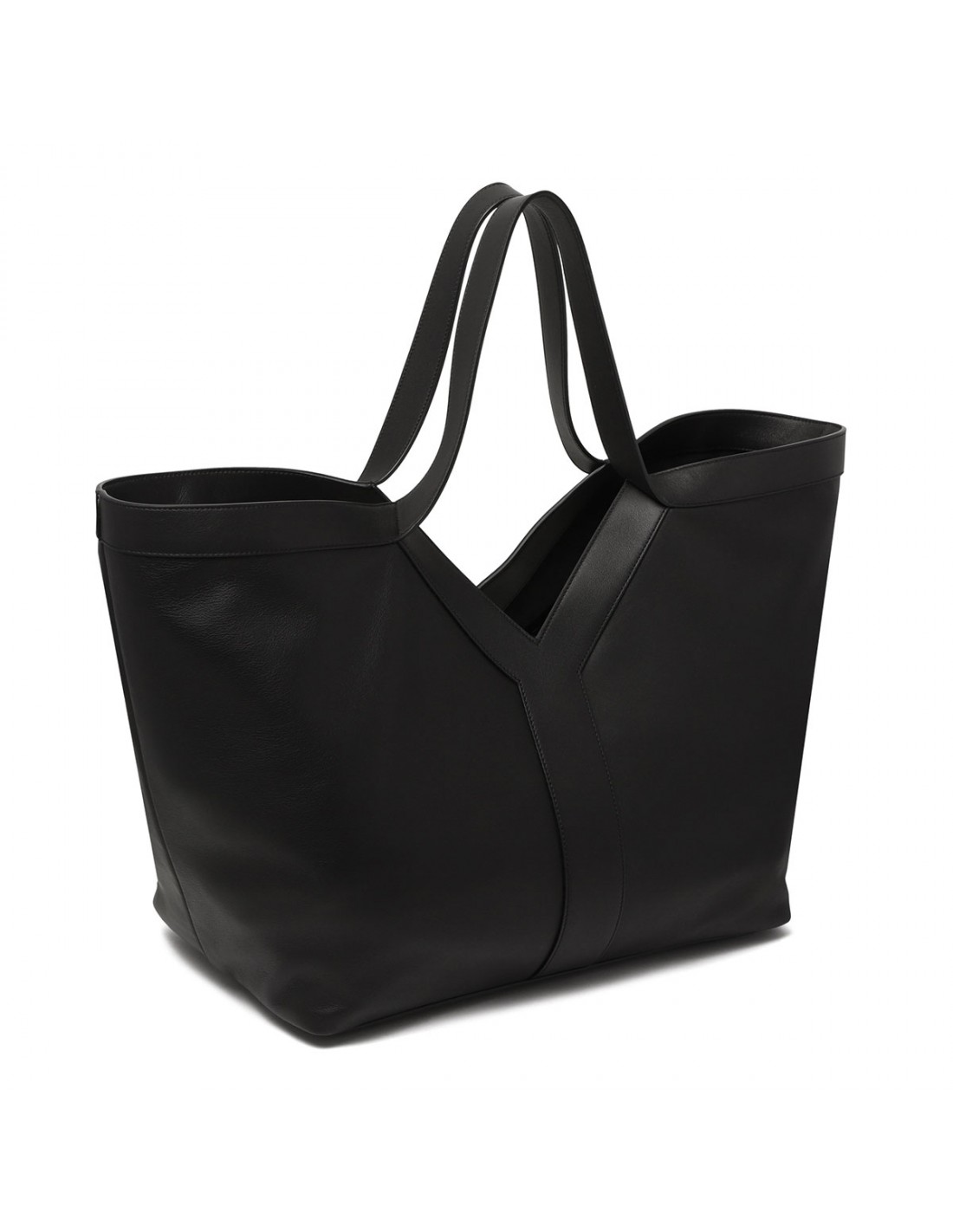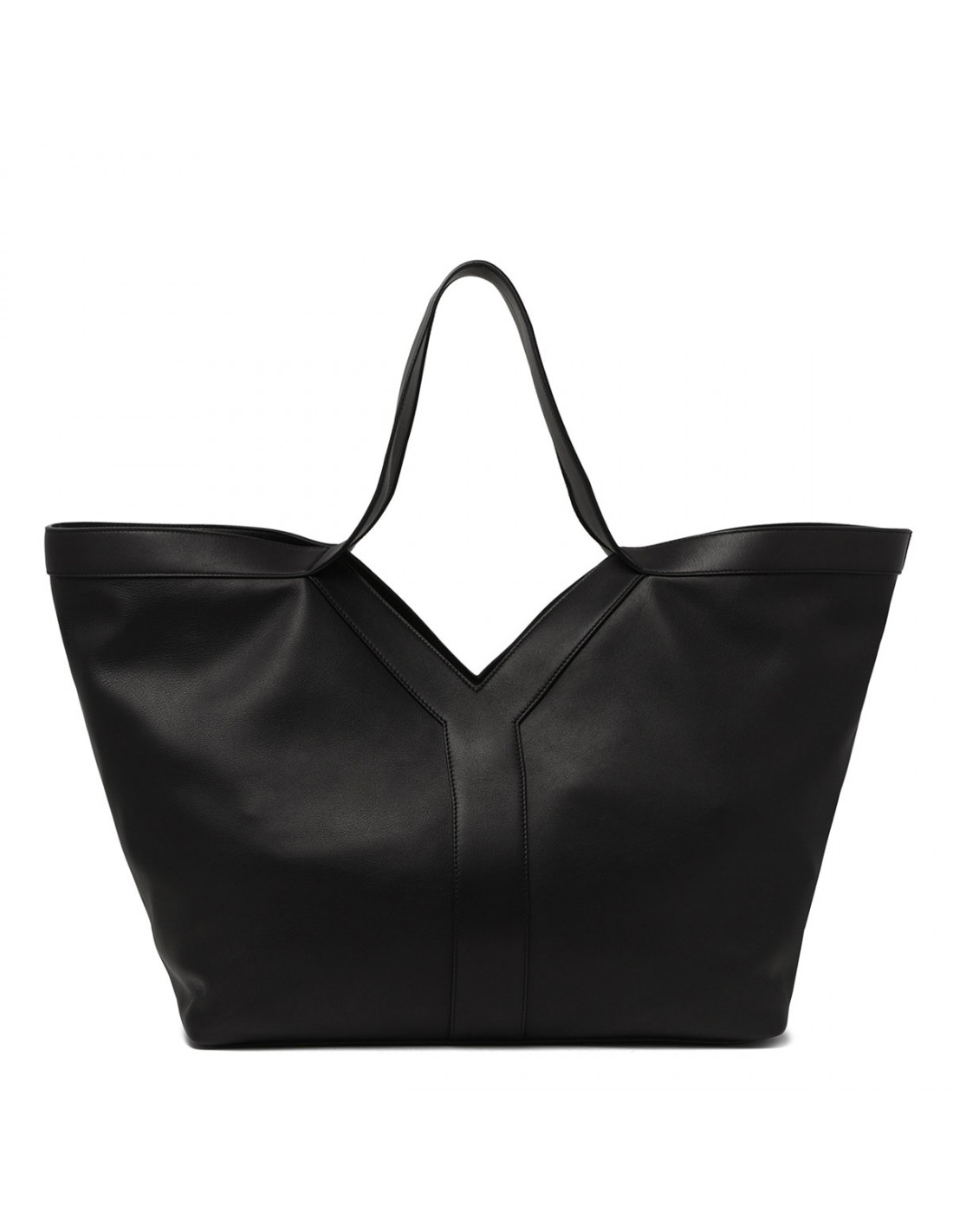 Black grained leather Y tote bag from Saint Laurent featuring Y stitched signature, hook closure, double leather top handle, suede lining and internal zipped pocket.