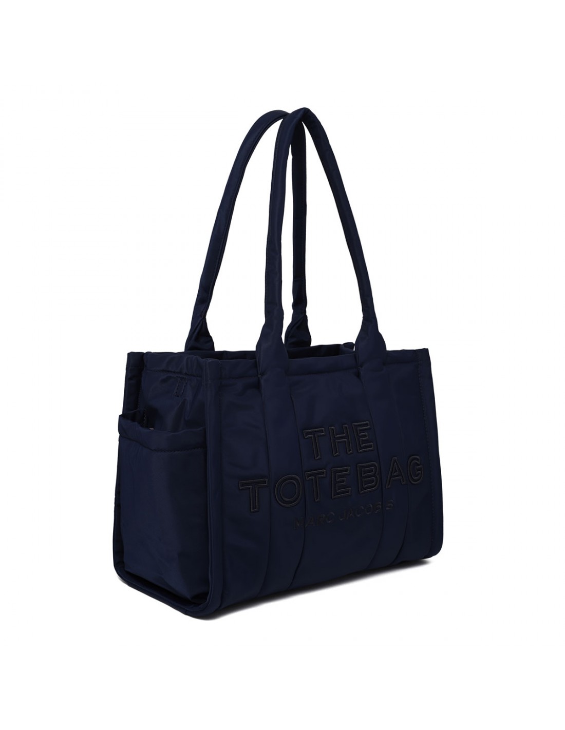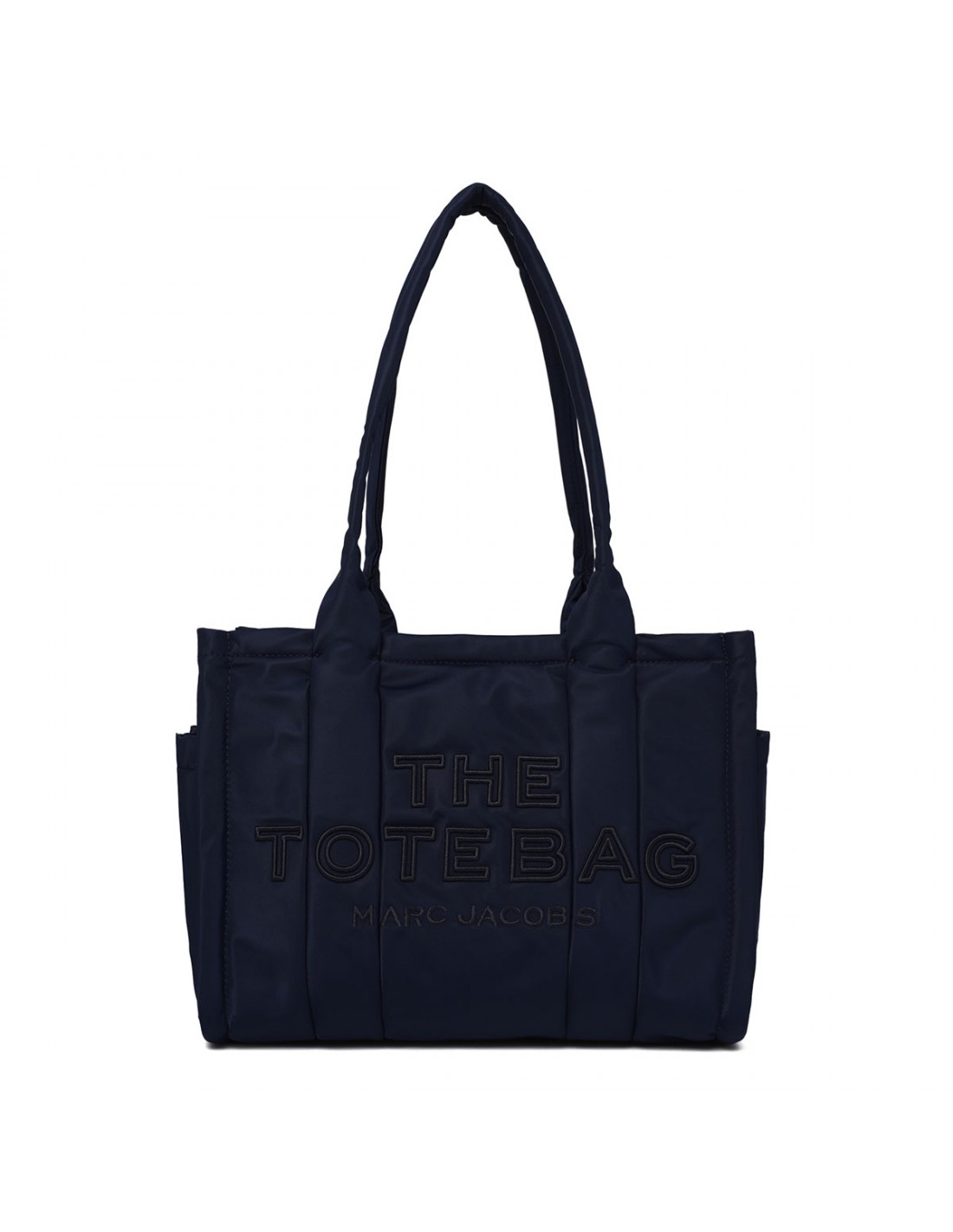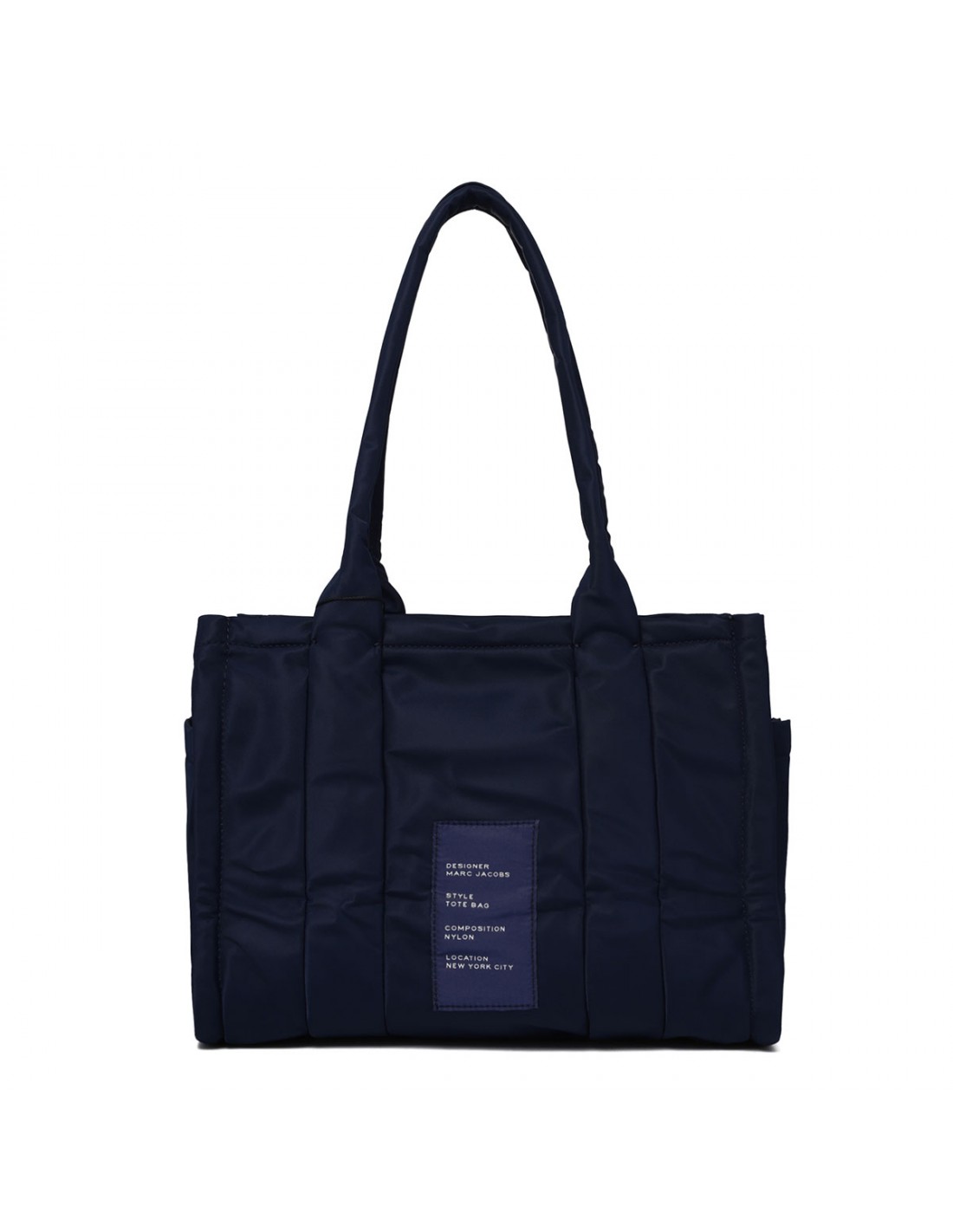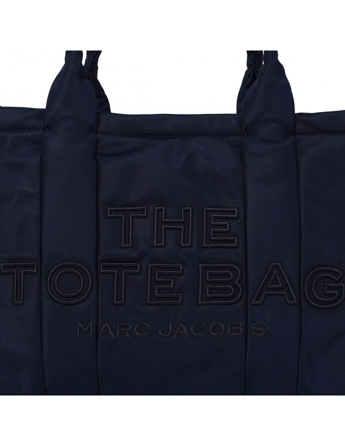 Blue sea puffy nylon The Medium Tote bag from Marc Jacobs featuring double top handle, embroidered signature namesake branding, zip fastening along top, two external side pockets, internal slip and zipped pockets, "Caution extremely lightweight because life's too short for heavy baggage" interior inscription.