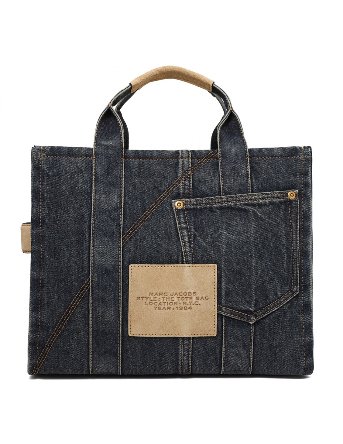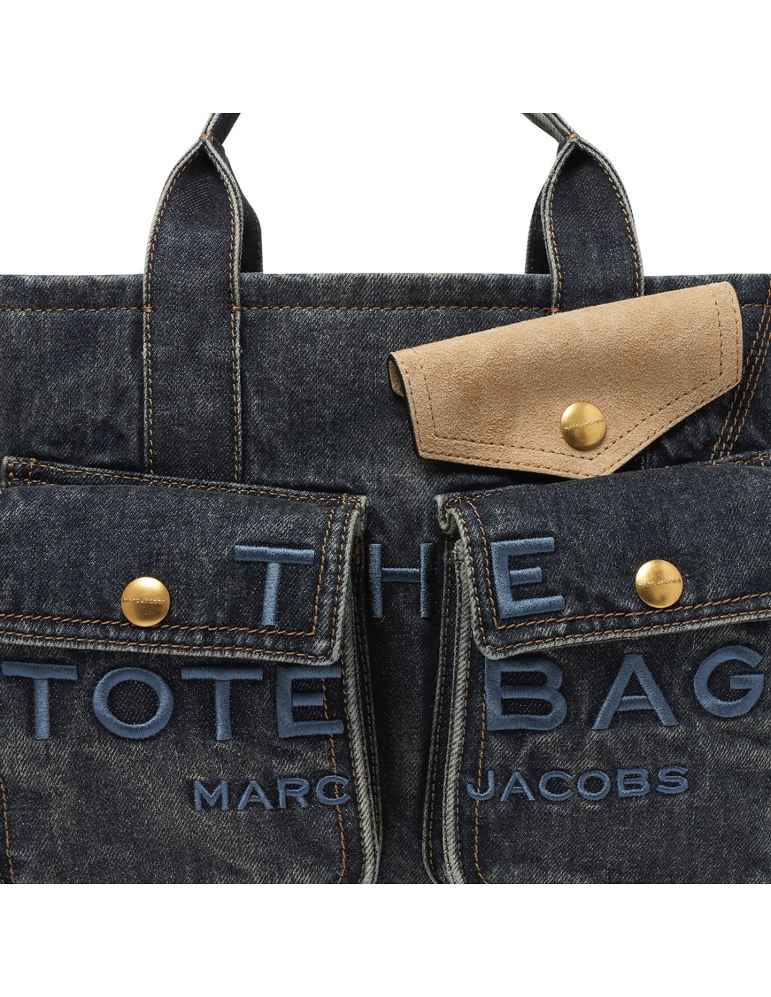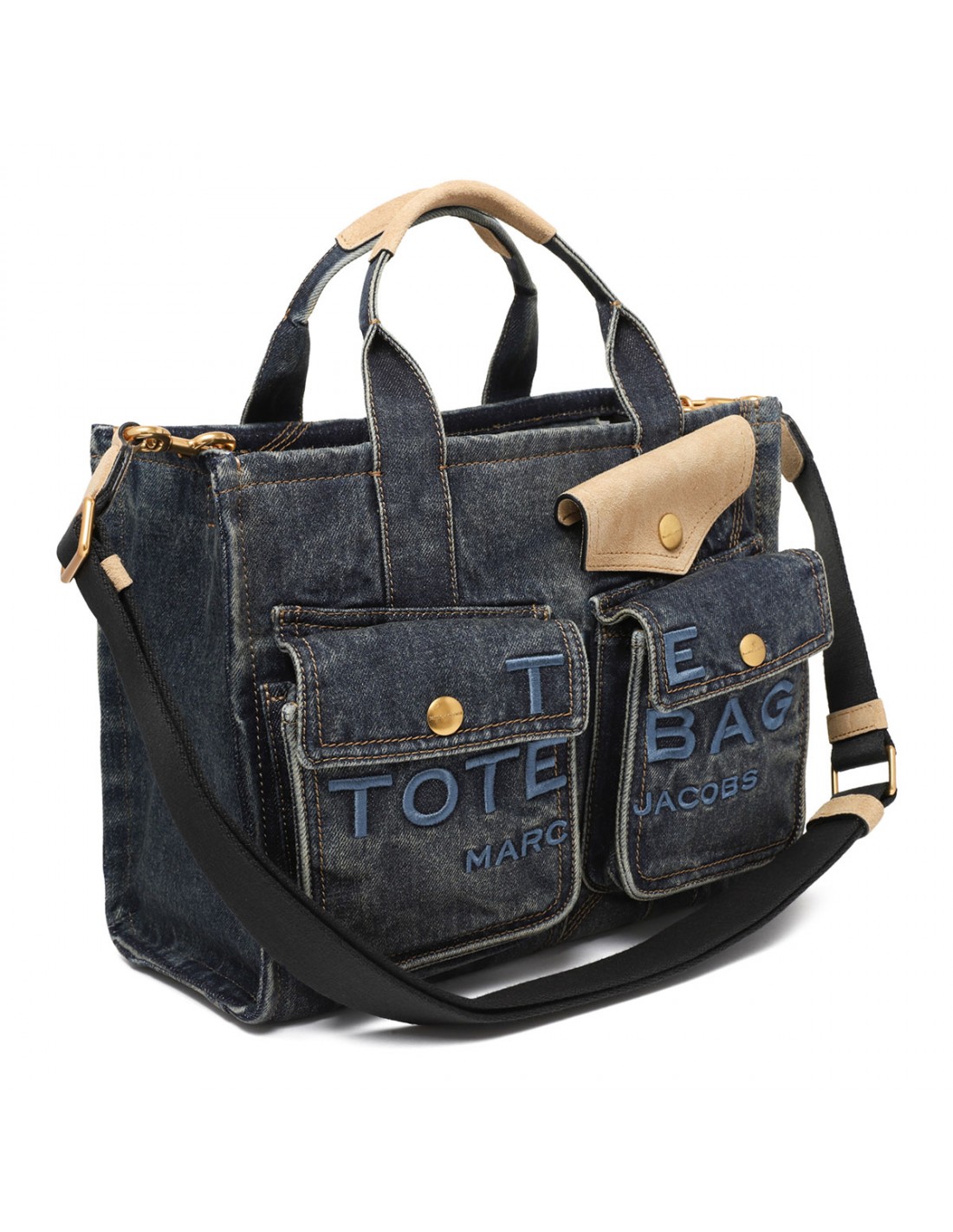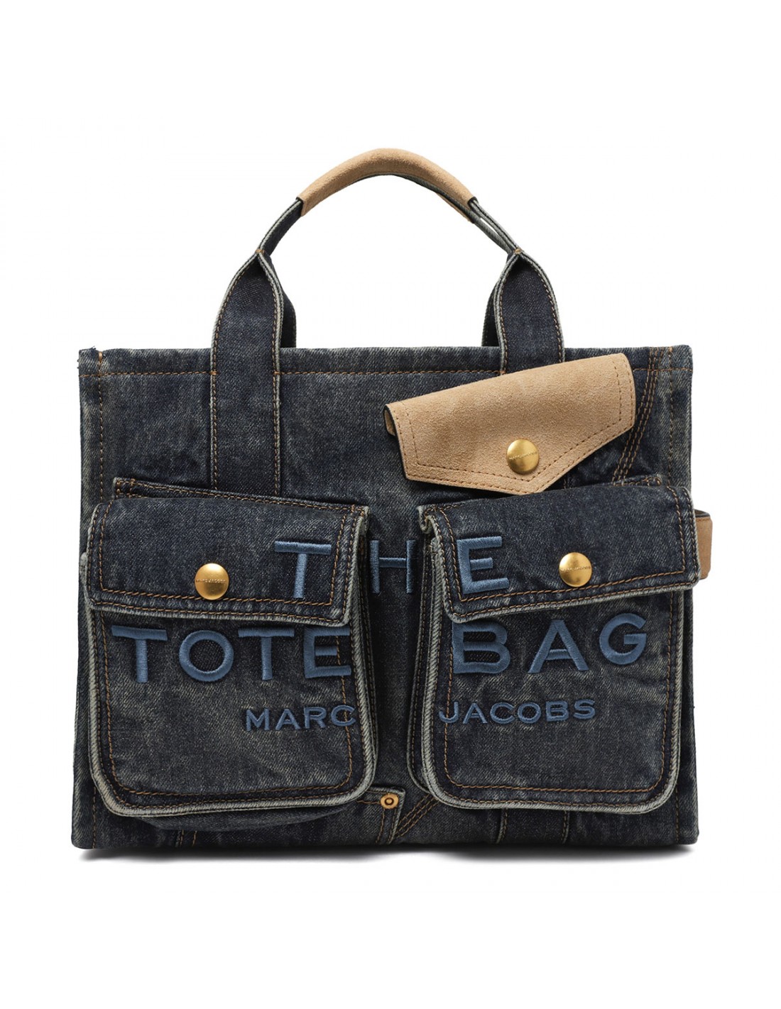 Dark indigo denim and suede The medium tote bag from Marc Jacobs featuring details inspired by cargo pants and denim jackets, chunky zip fastening along top, namesake branding, top handles, adjustable and detachable crossbody strap, two external snap pockets and one external slip pocket, twill lining, internal zipped pocket, slip pocket, one card slot.
