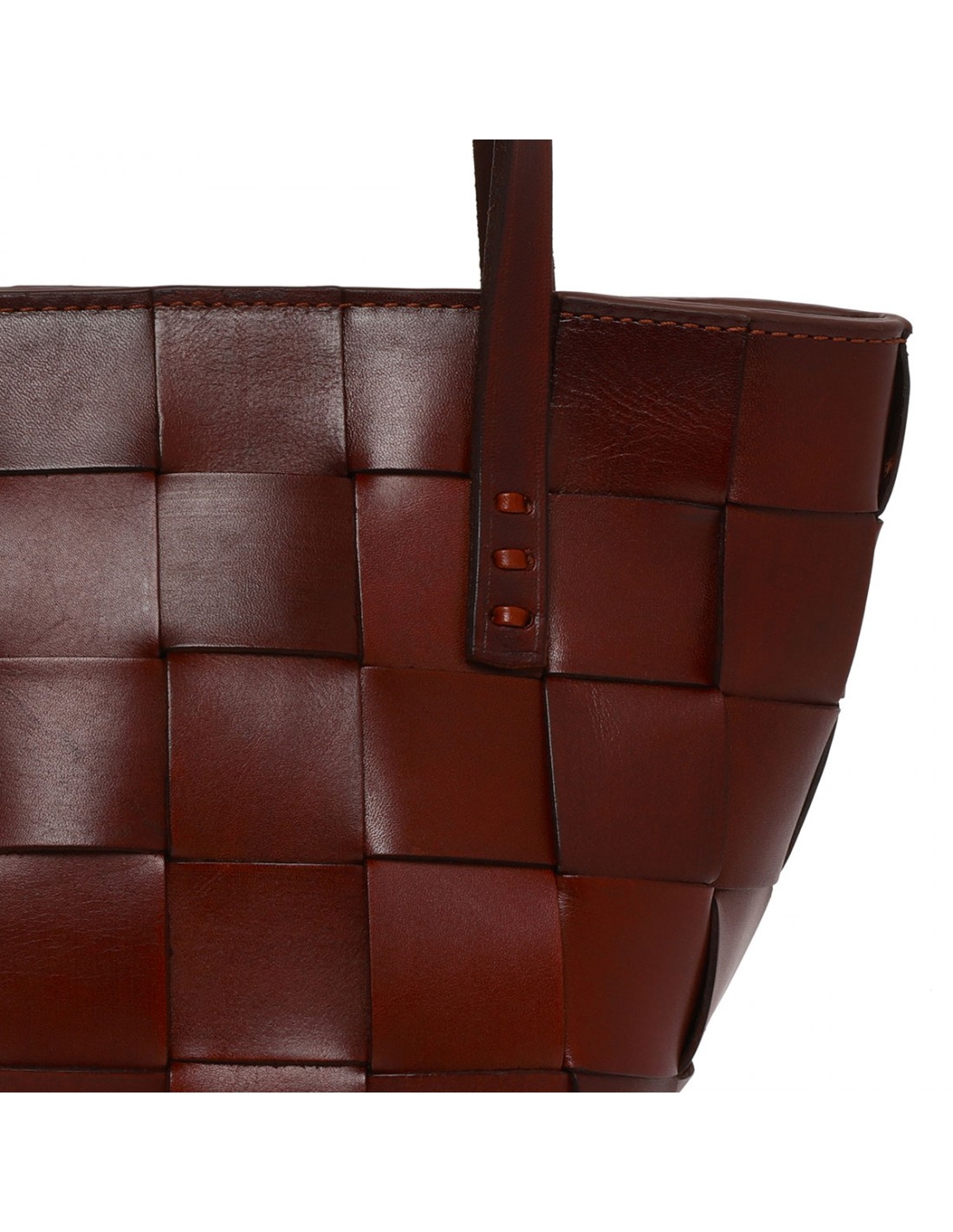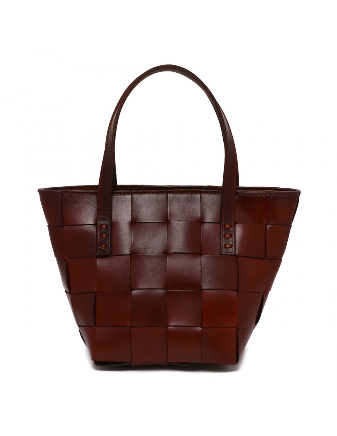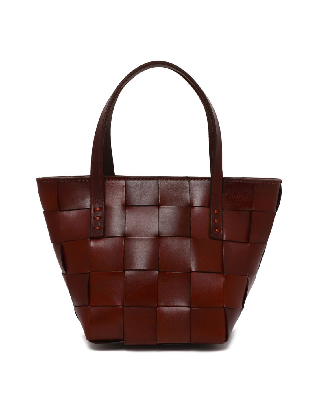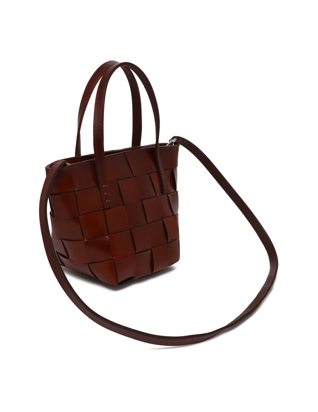 Bordeaux woven leather Japan mini tote bag from Dragon Diffusion featuring cross-woven design, double top handle, detachable shoulder strap, zip fastening along top, antiqued St. Christopher medal charm hand-sewn inside the bag.