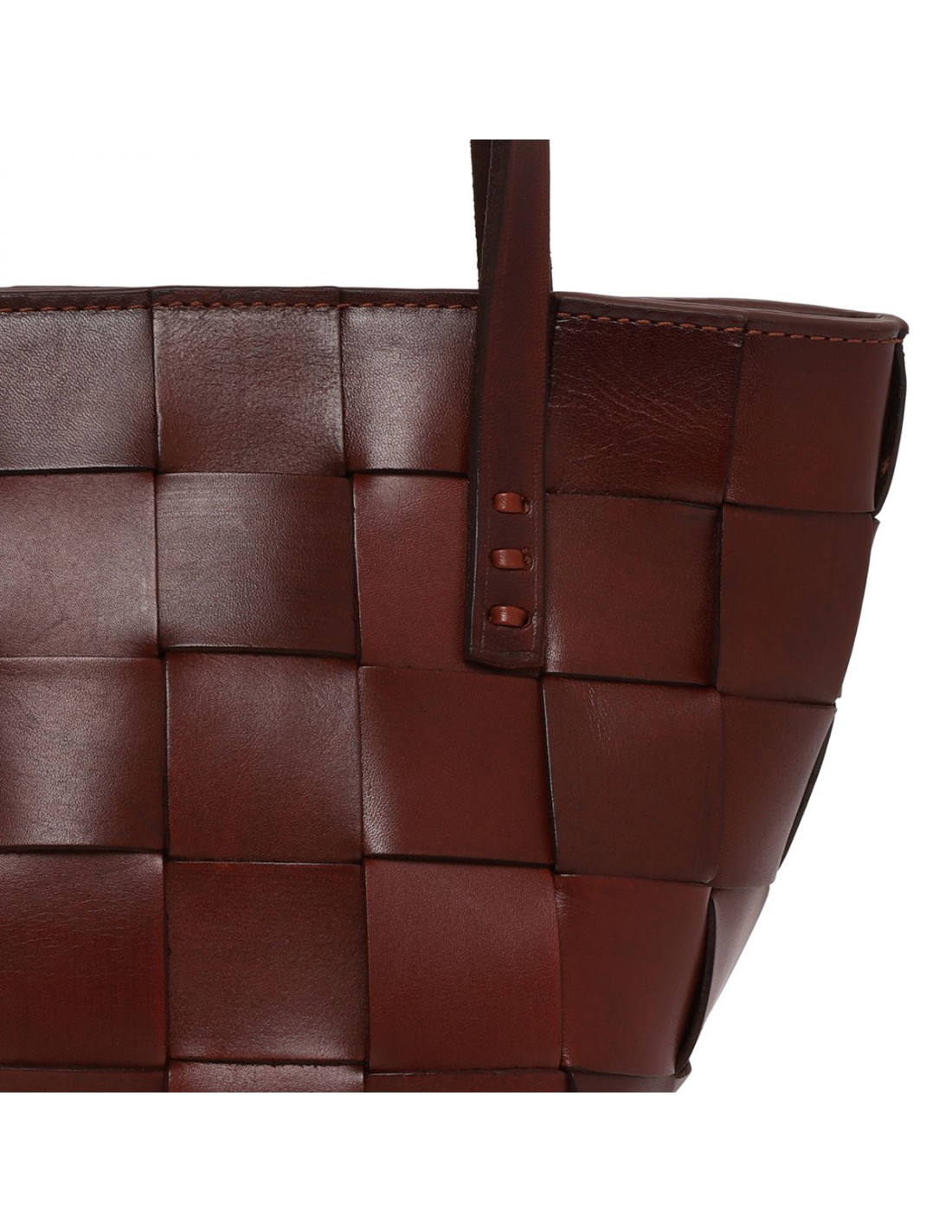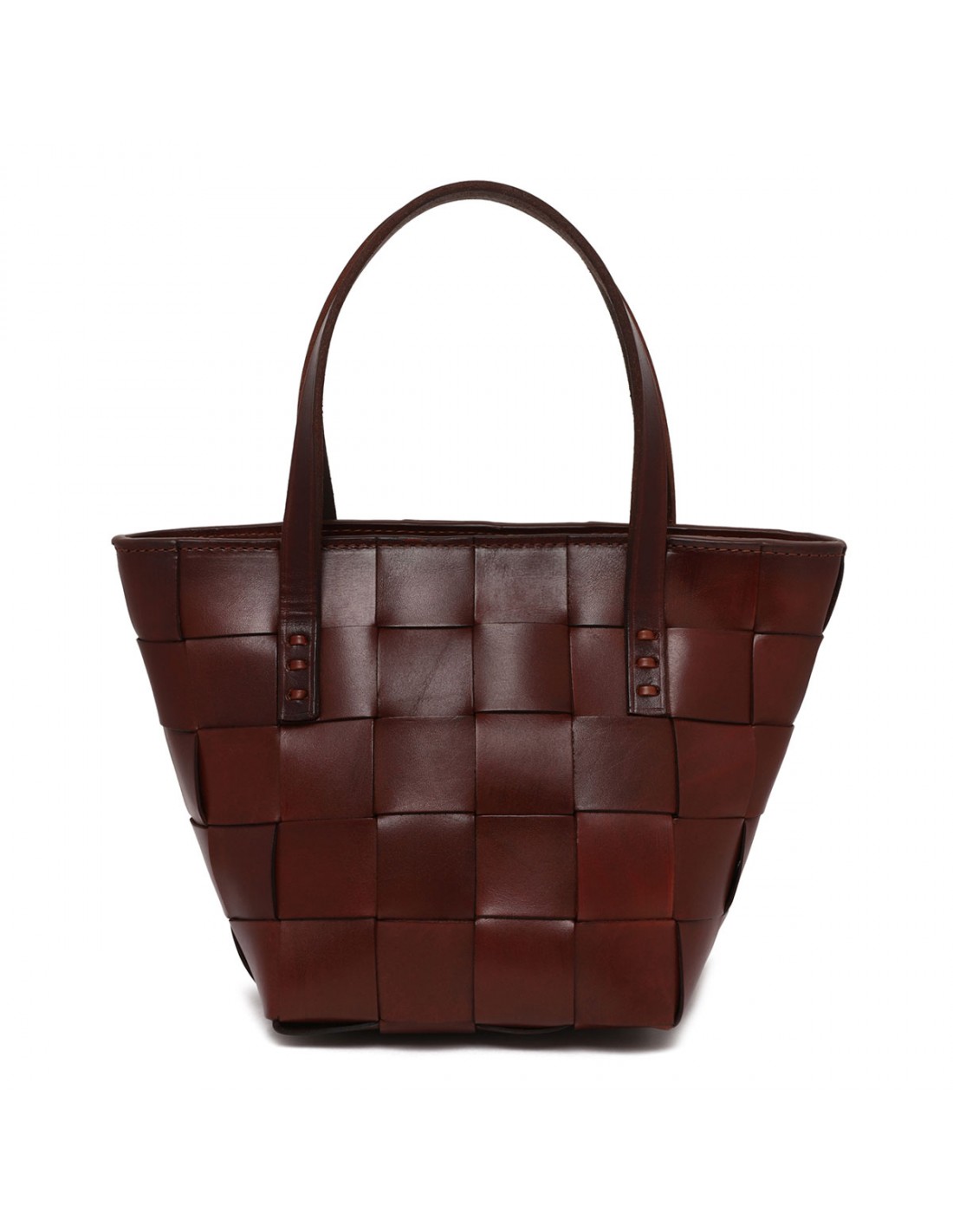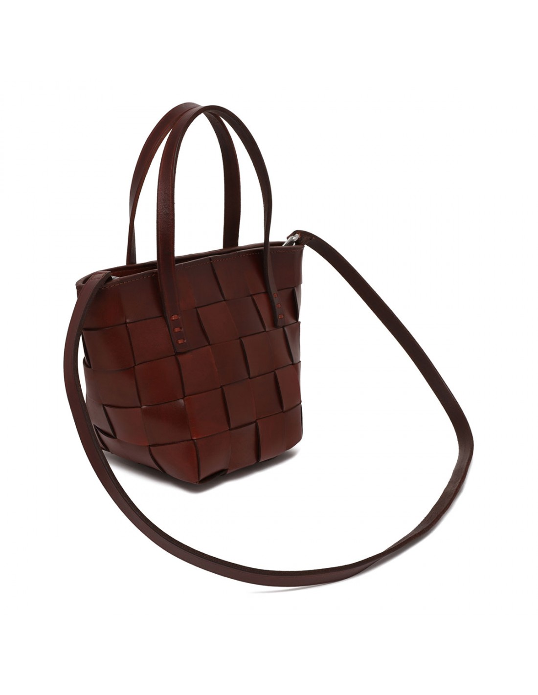 Burnt brown woven leather Japan mini tote bag from Dragon Diffusion featuring cross-woven design, double top handle, detachable shoulder strap, zip fastening along top, antiqued St. Christopher medal charm hand-sewn inside the bag.