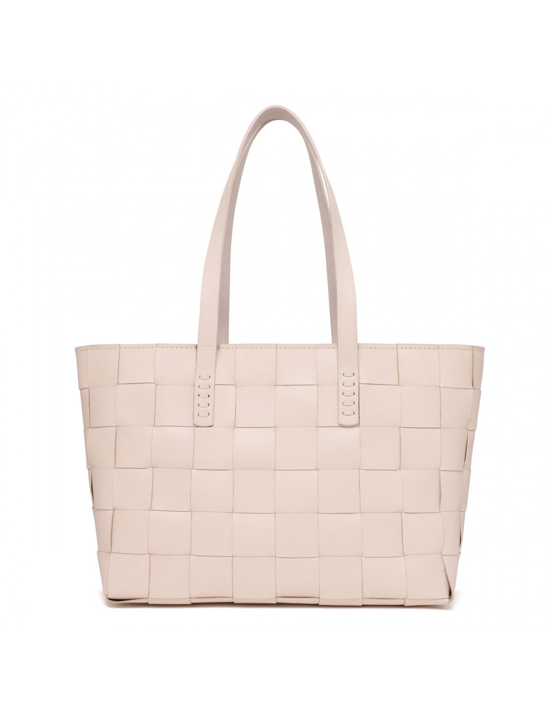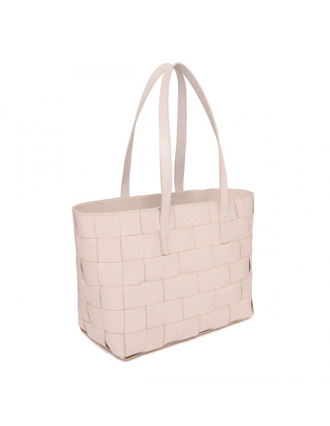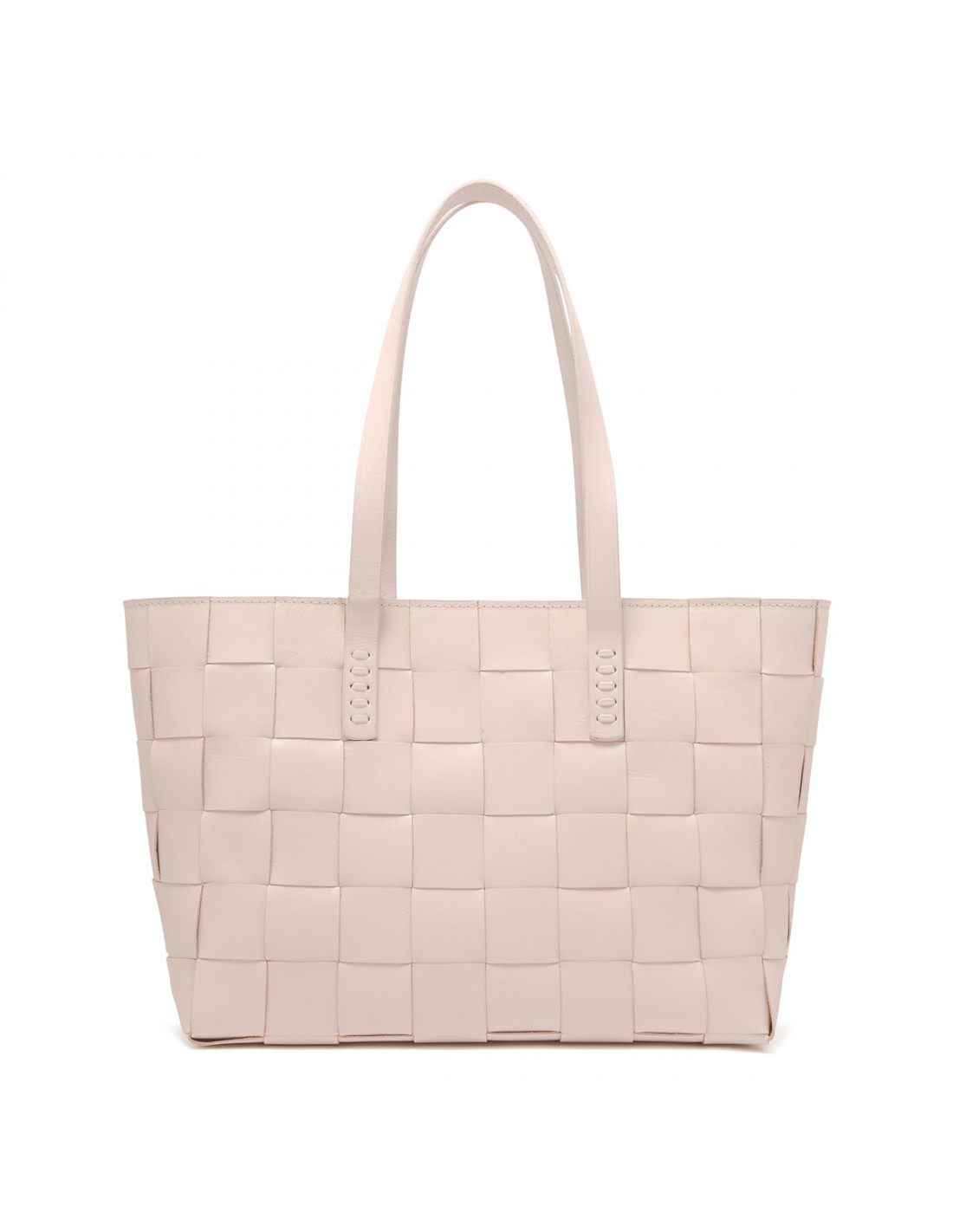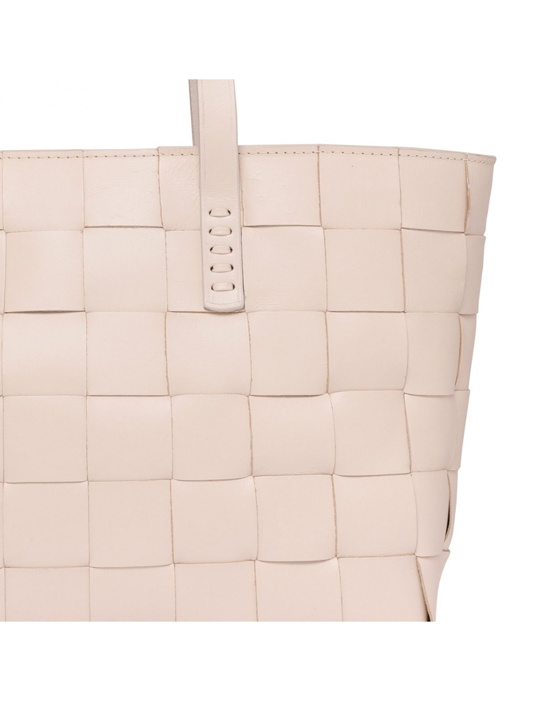 Sand hue woven leather Japan mini tote bag from Dragon Diffusion featuring cross-woven design, double top handle, antiqued St. Christopher medal charm hand-sewn inside the bag.