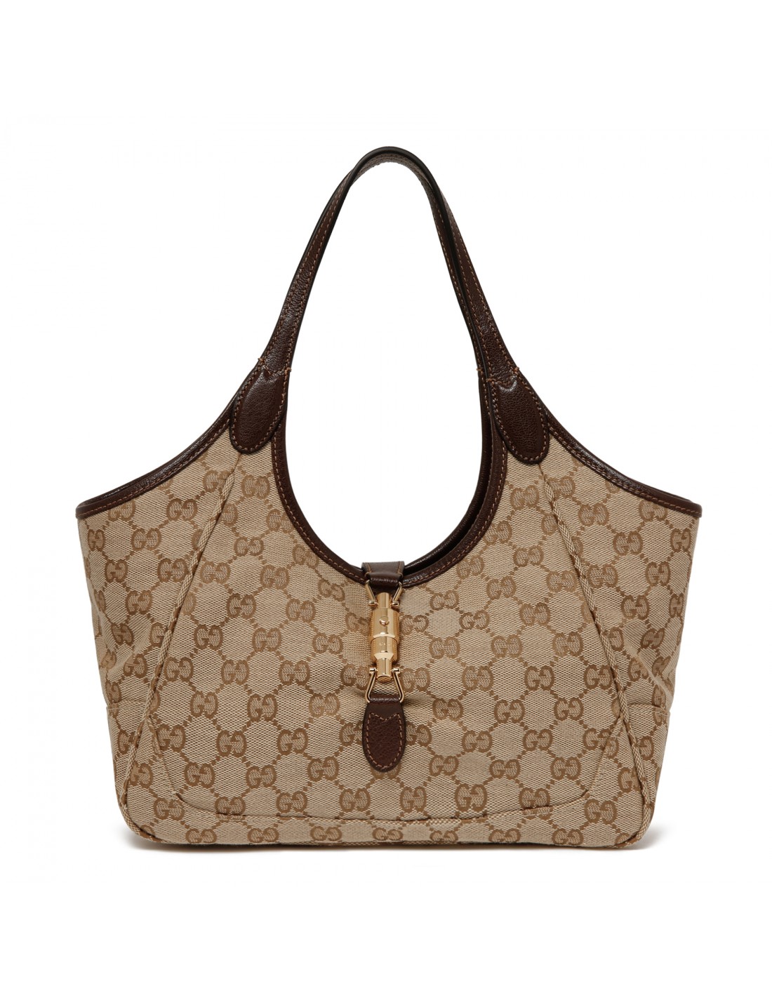 Sand and dark brown GG canvas Mercato small tote bag from Gucci featuring piston closure, dark brown soft leather trims, gold-toned hardware, double top handle, detachable and adjustable leather strap, sand canvas lining with diamante motif, one internal zipped pocket.