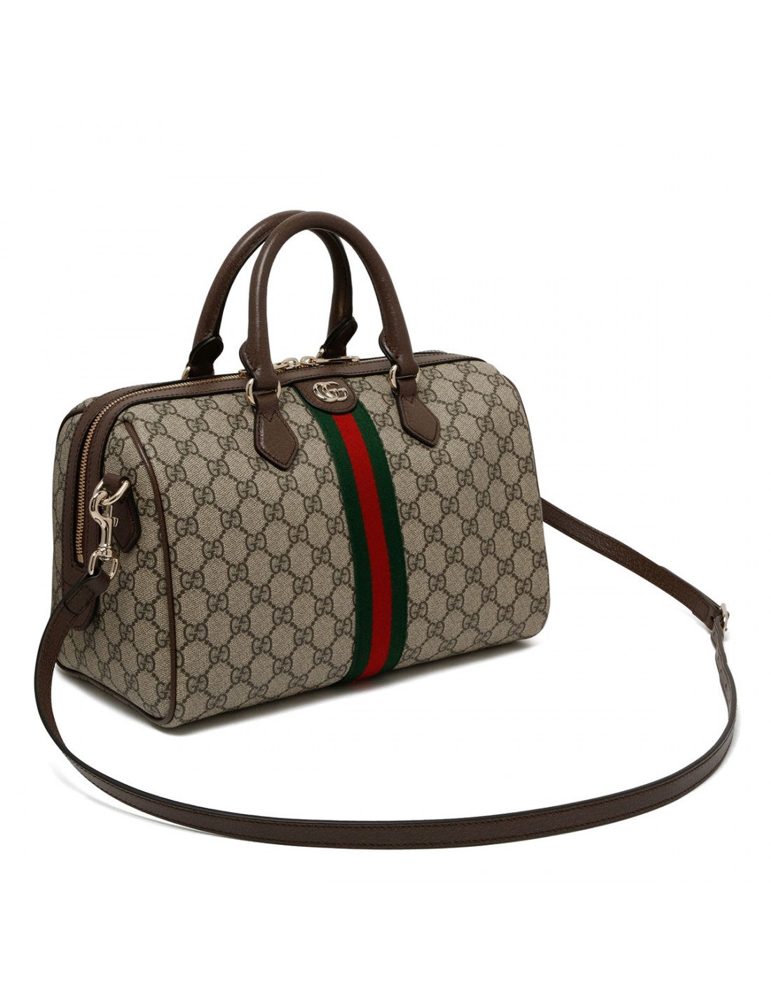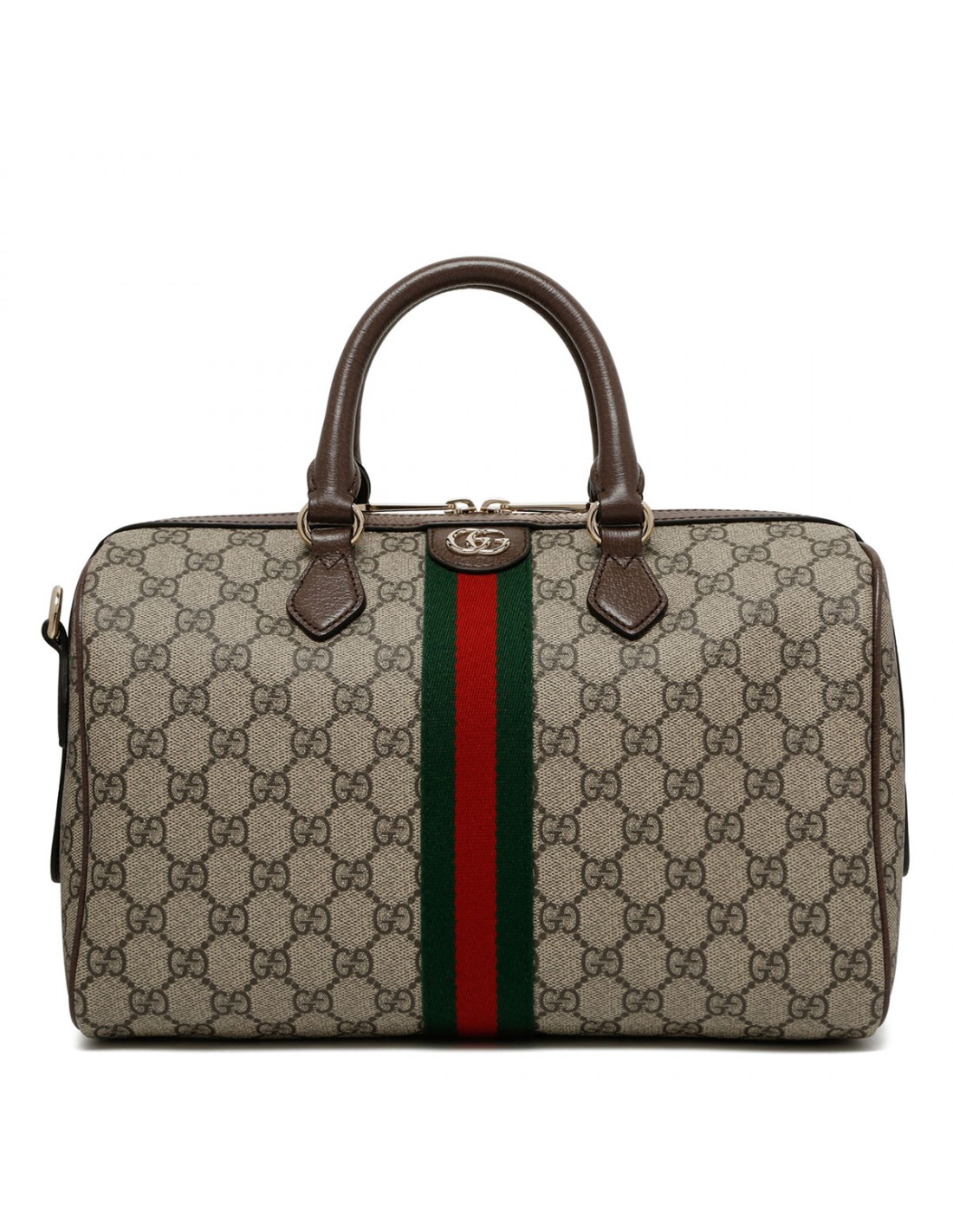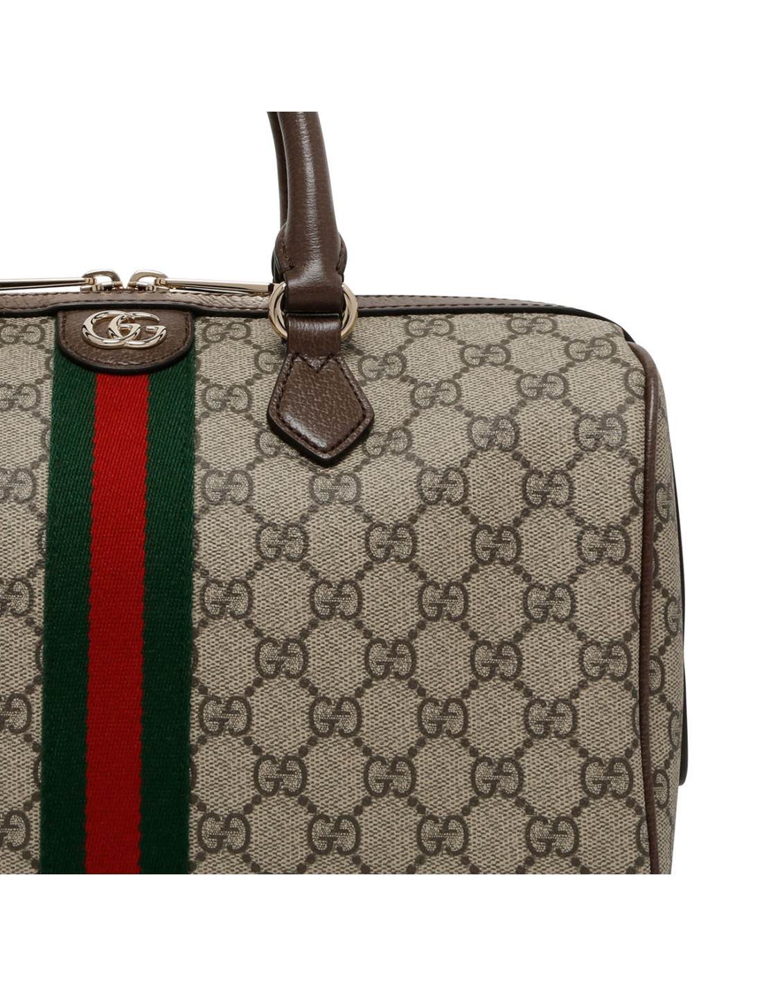 Beige and dark brown GG Monogram coated fabric Ophidia large boston bag from Gucci featuring brown leather trims, light gold-toned double G and hardware, Web, zip fastening along top, top handle, detachable and adjustable leather shoulder strap, green cotton lining, one zip pocket.