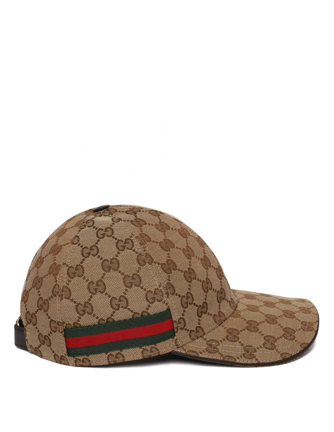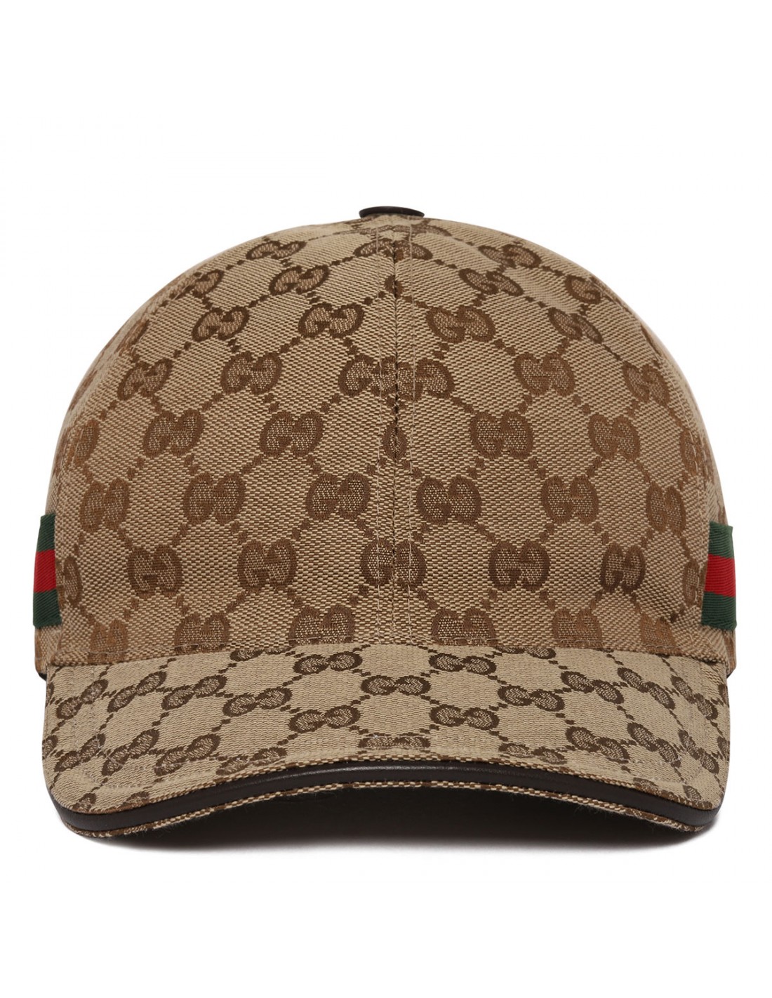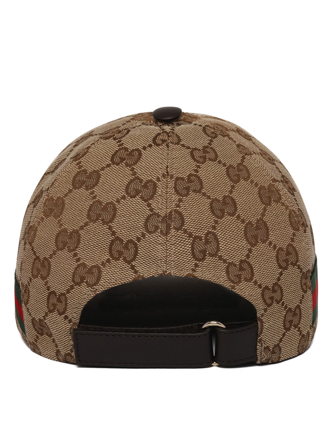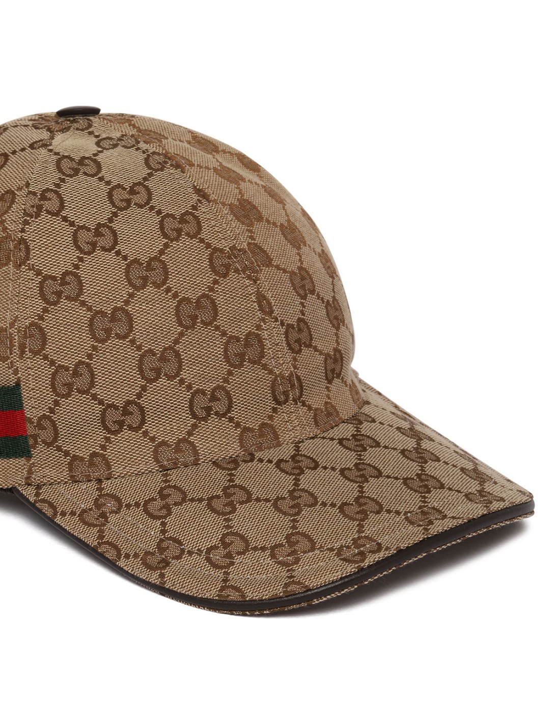 Beige and ebony Original canvas baseball cap from Gucci featuring GG motif, green and red Web, brown leather trim, button on top, adjustable hook-and-loop closure on back and cotton lining.