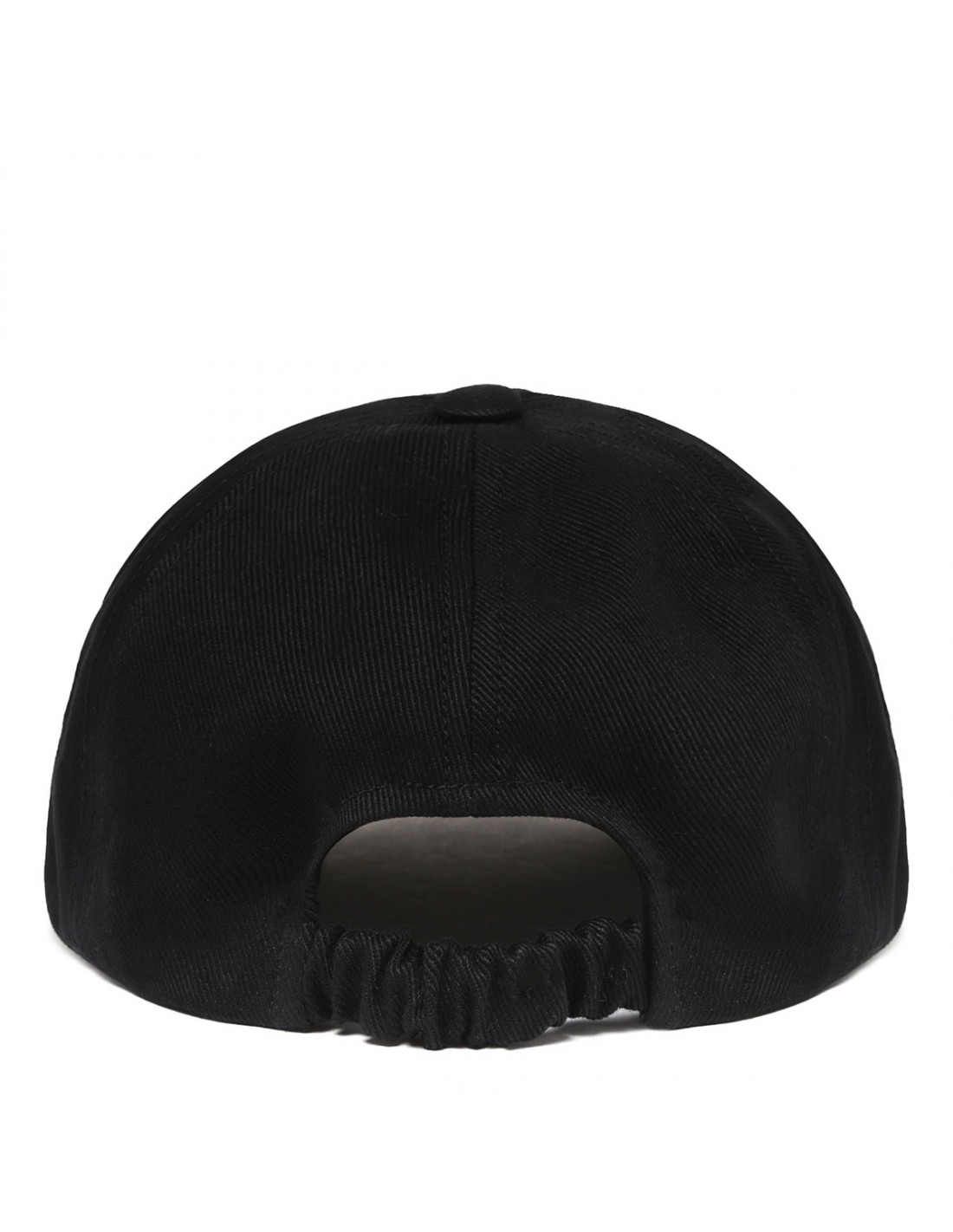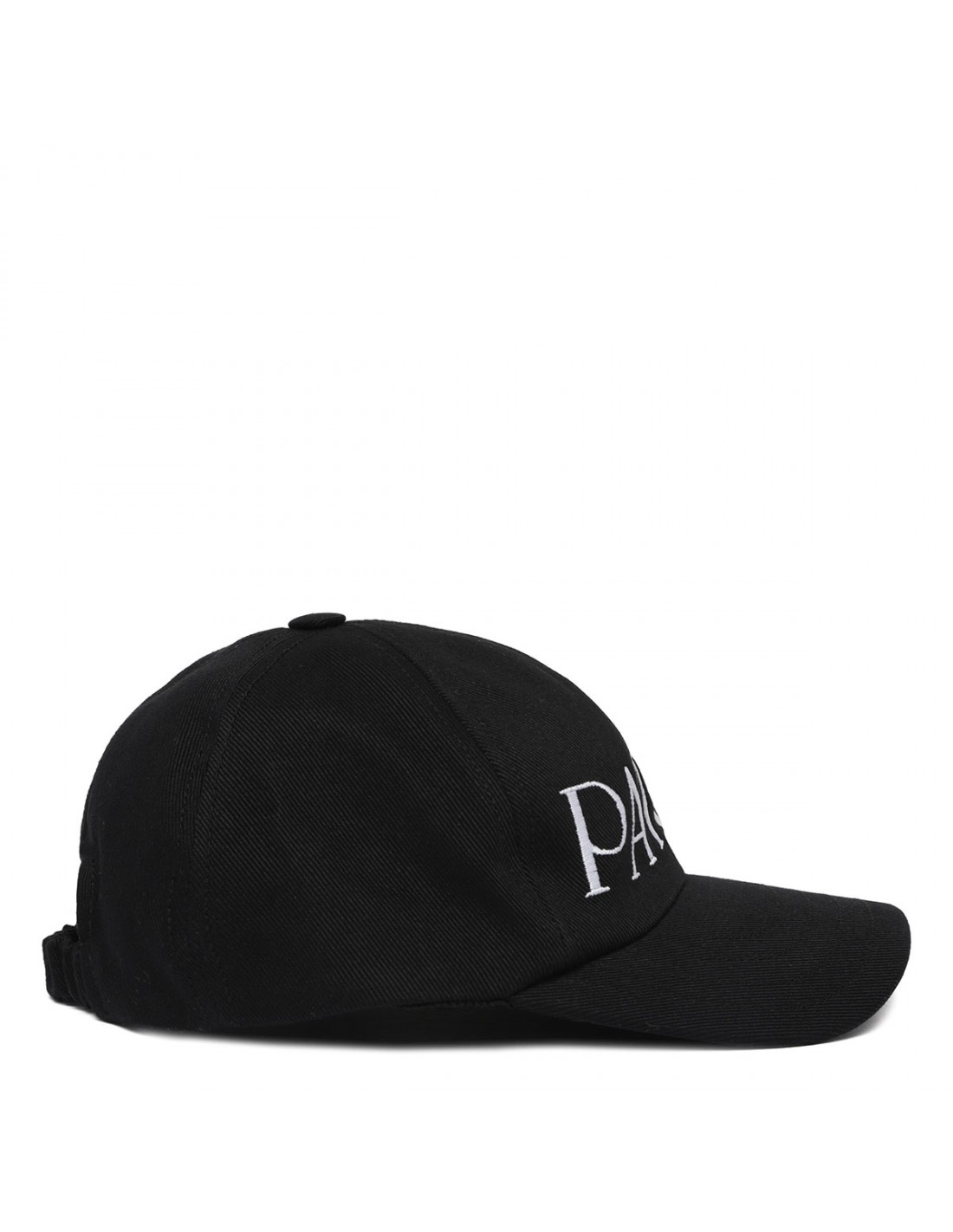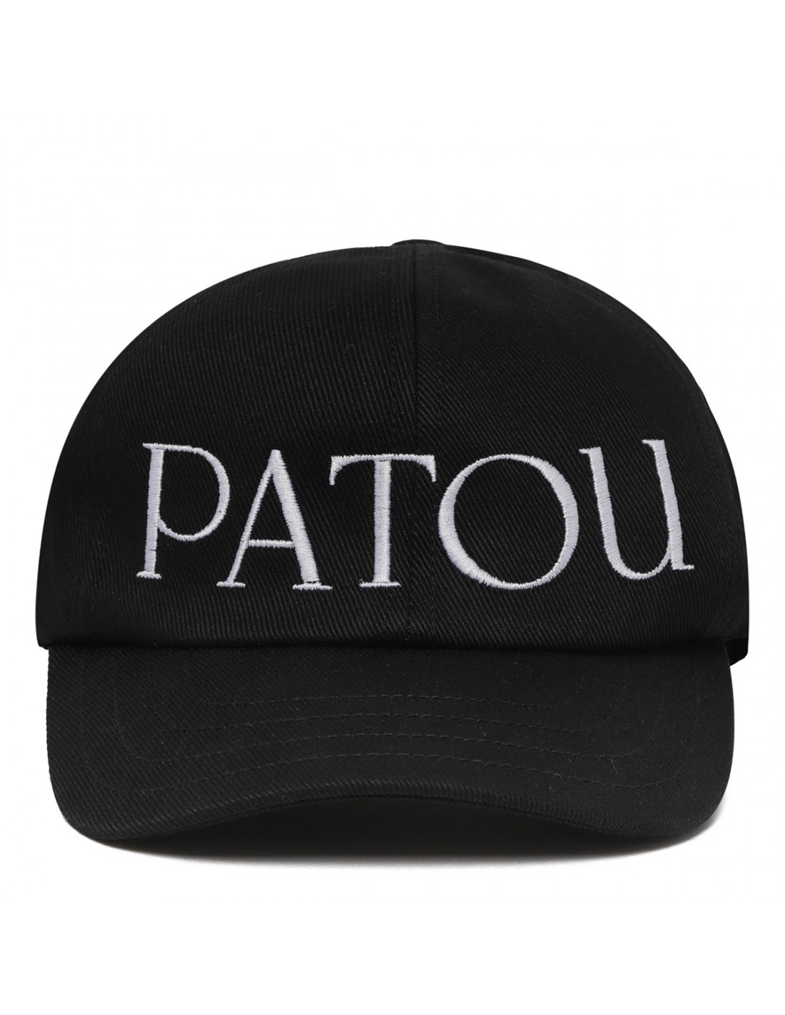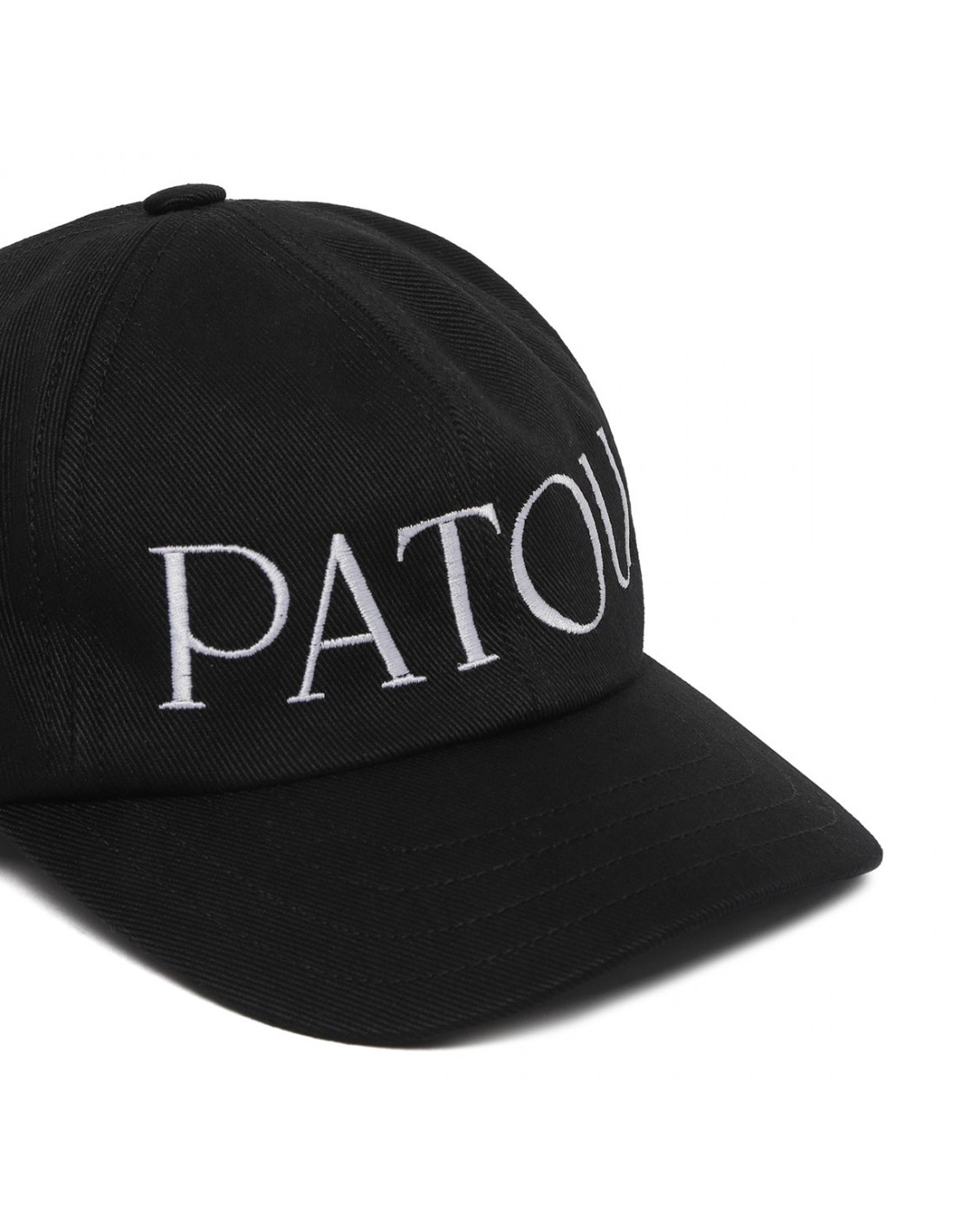 Black cotton baseball cap from Patou featuring white embroidered logo and elasticated strap at back.