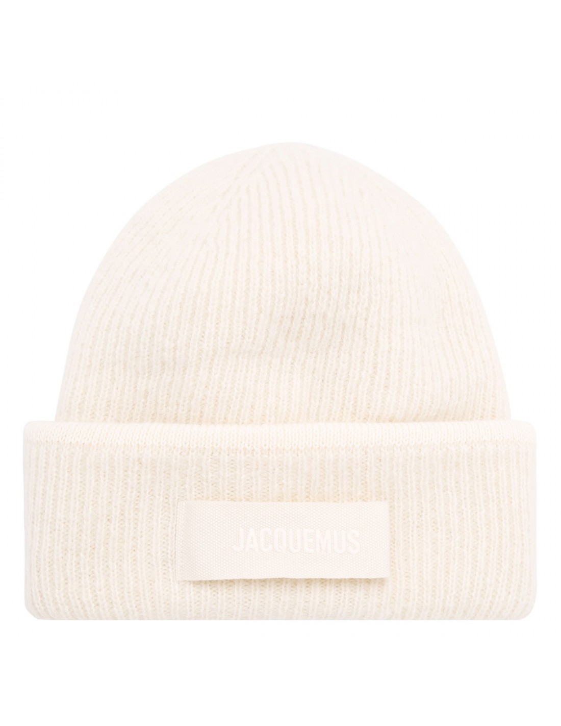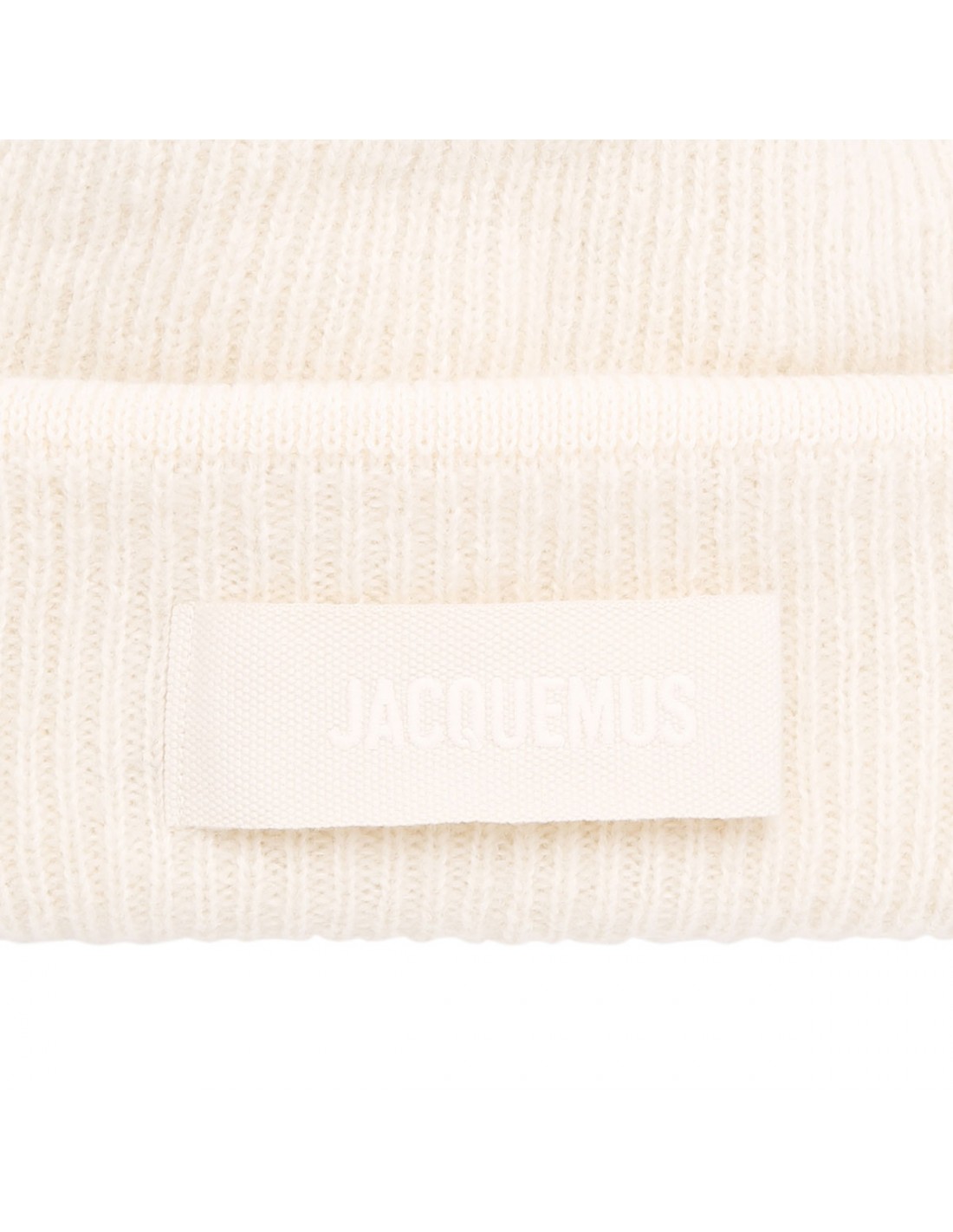 Off-white rib knit alpaca blend beanie from Jacquemus featuring tone-on-tone grosgrain logo embroidered on front and folded edge.